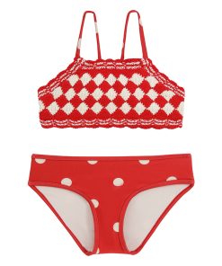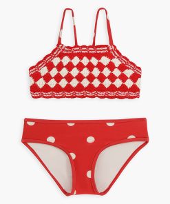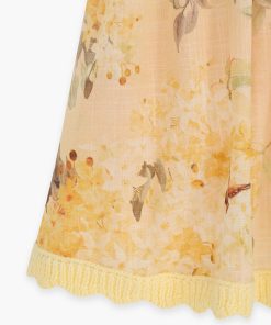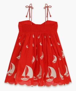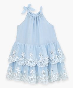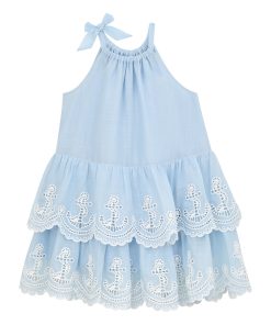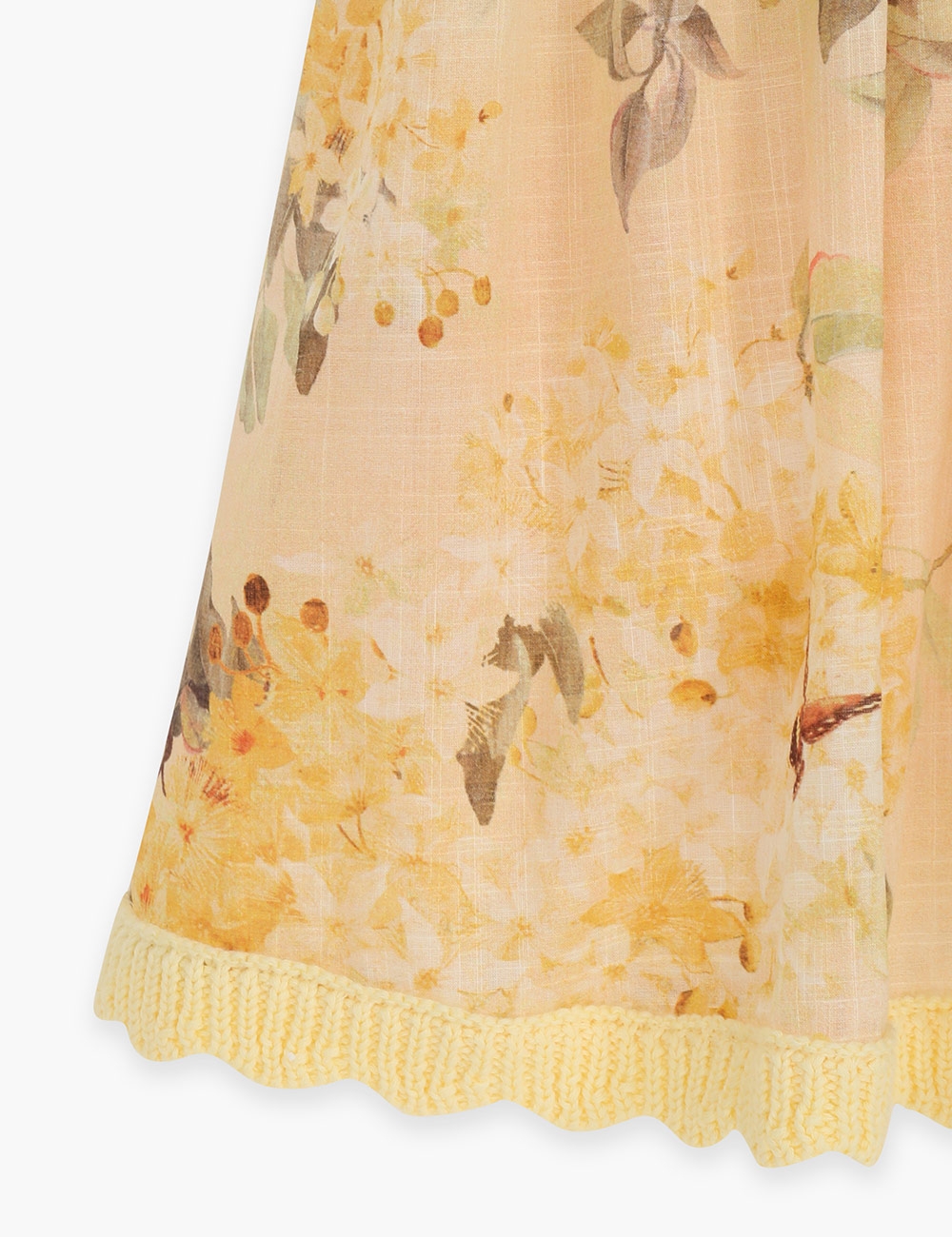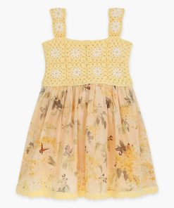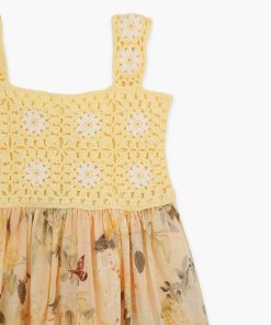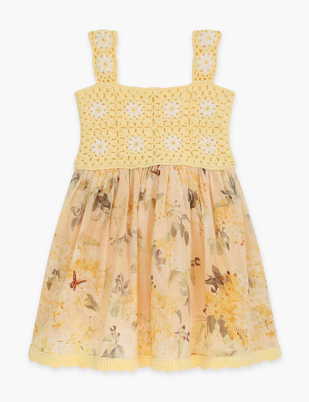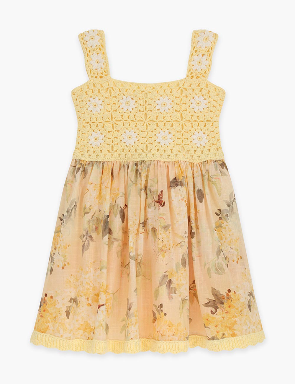 The Cascadian Kids Crochet Dress in Lemon/Ivory from our Summer Swim 2025 Collection. A cotton dress featuring a crochet bodice, thick shoulder straps and a frill skirt with scalloped edging.100% cotton fabric, kids cotton knee length dress, square neckline with thick straps, crochet bodice, scalloped hem