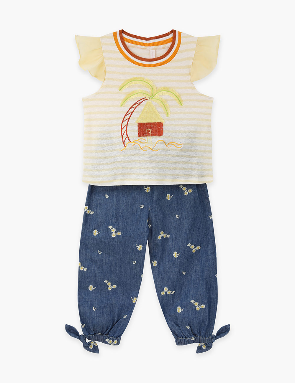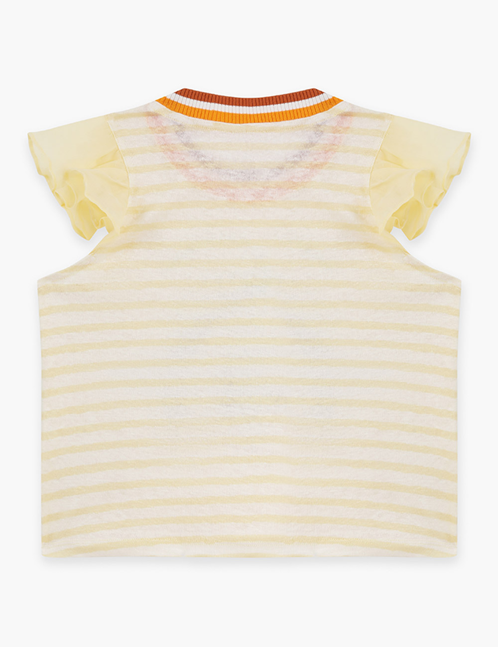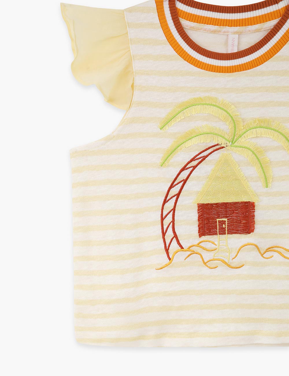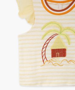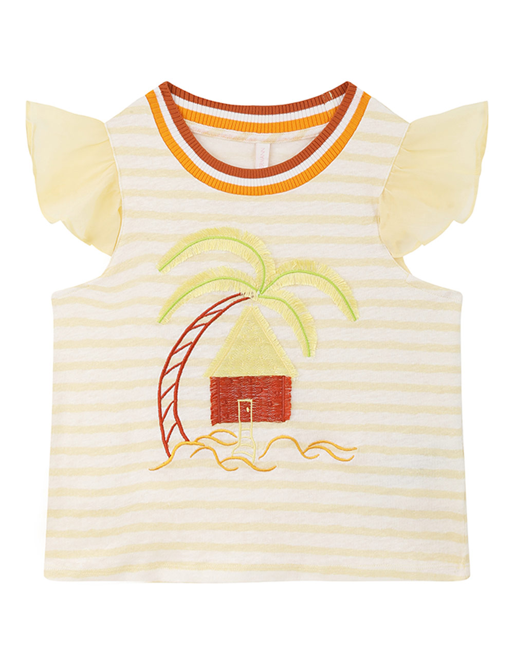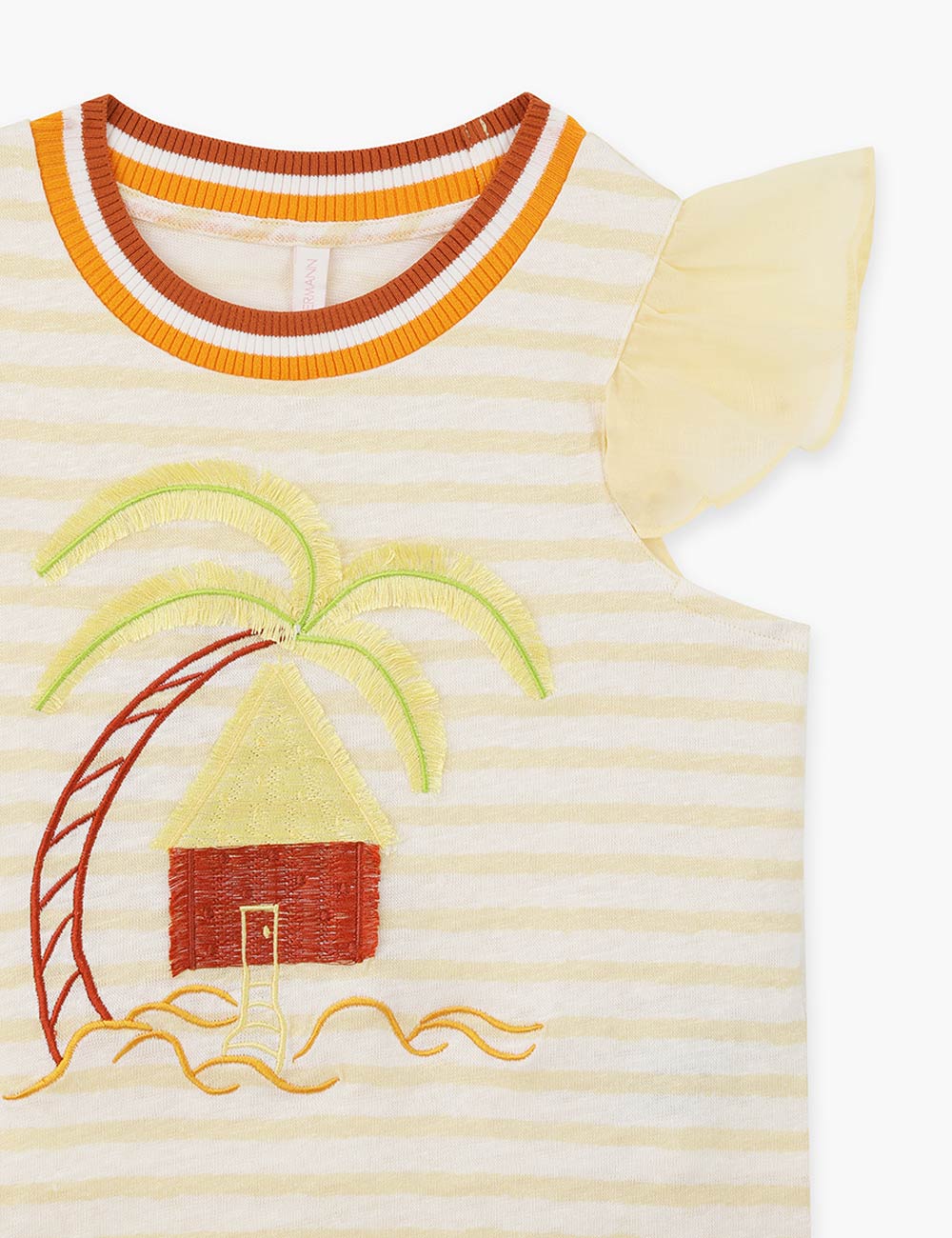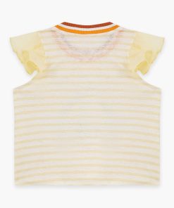 The Cascadian Kids Frill Tee in Yellow Stripe from our Summer Swim 2025 Collection. A kids top featuring a boat neckline and frilled sleeves.short sleeve kids top, ruffled sleeves, embroidery art design, contrast ribbed neckline