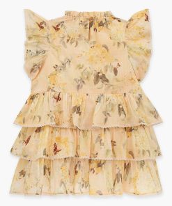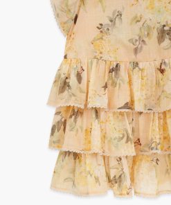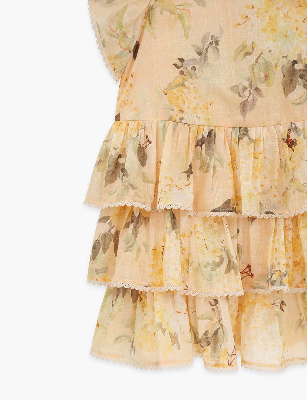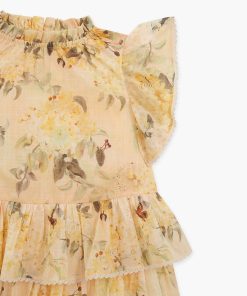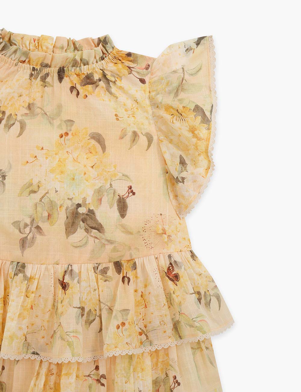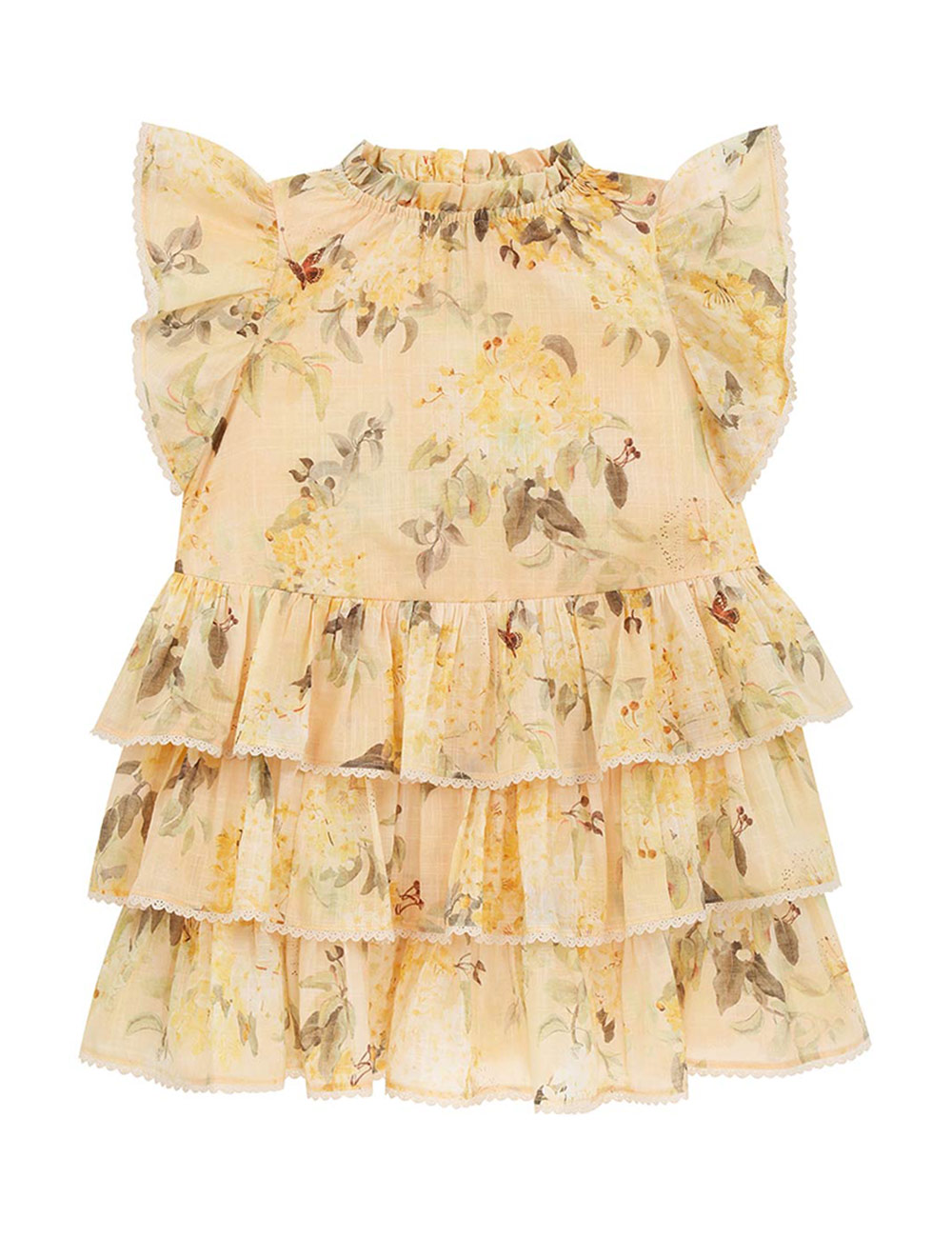 The Cascadian Kids Swing Dress in Yellow Botanical Floral from our Summer Swim 2025 Collection. A cotton dress featuring an elasticated neckline, tiered skirt and scalloped detail hem.100% cotton fabric, sleeveless kids dress, gathering across neckline, frill detailing throughout, scalloped edging