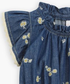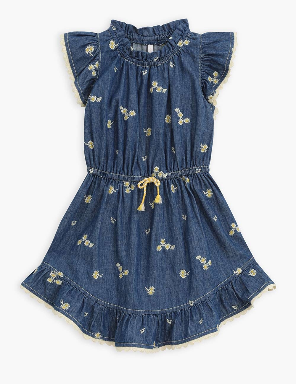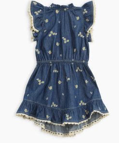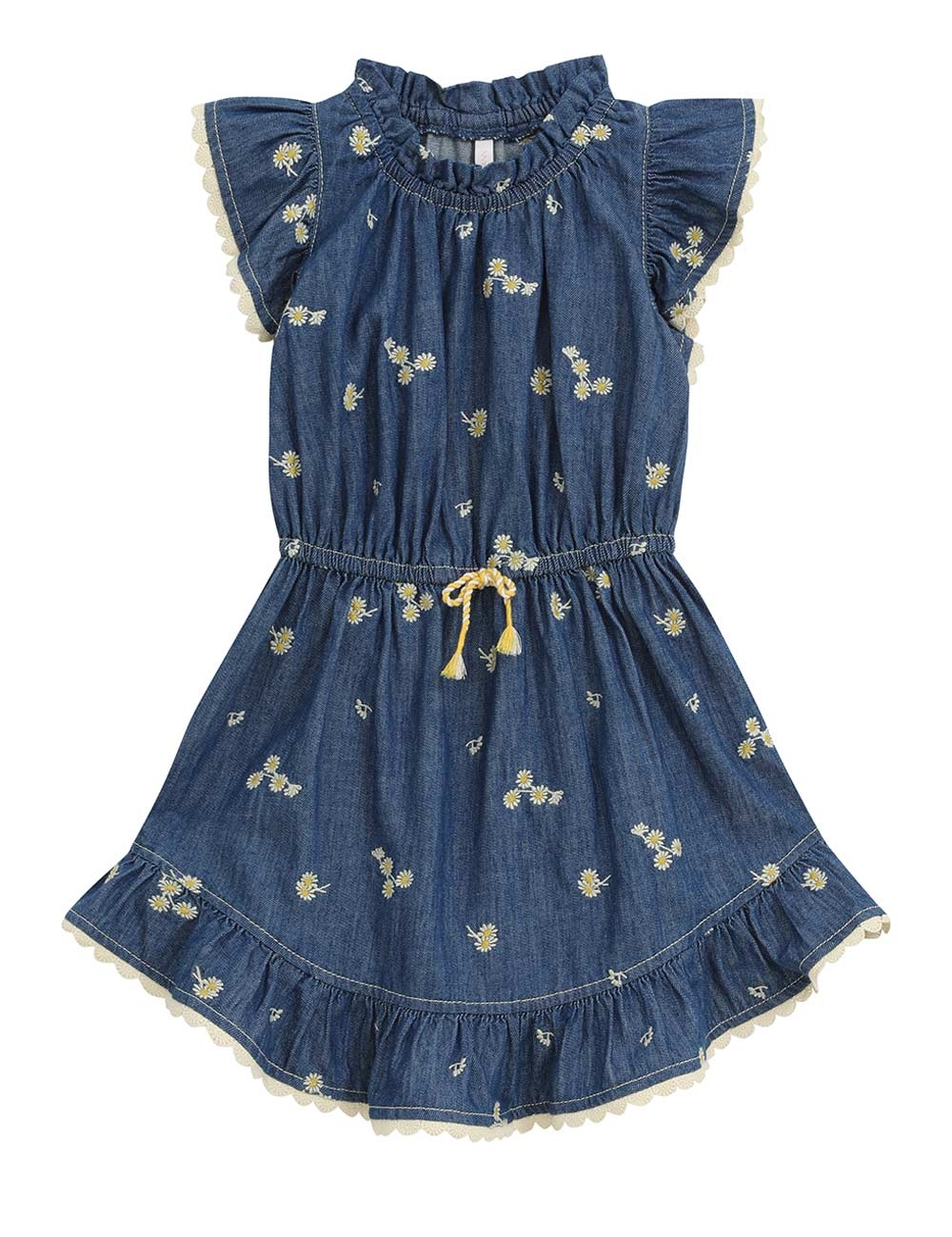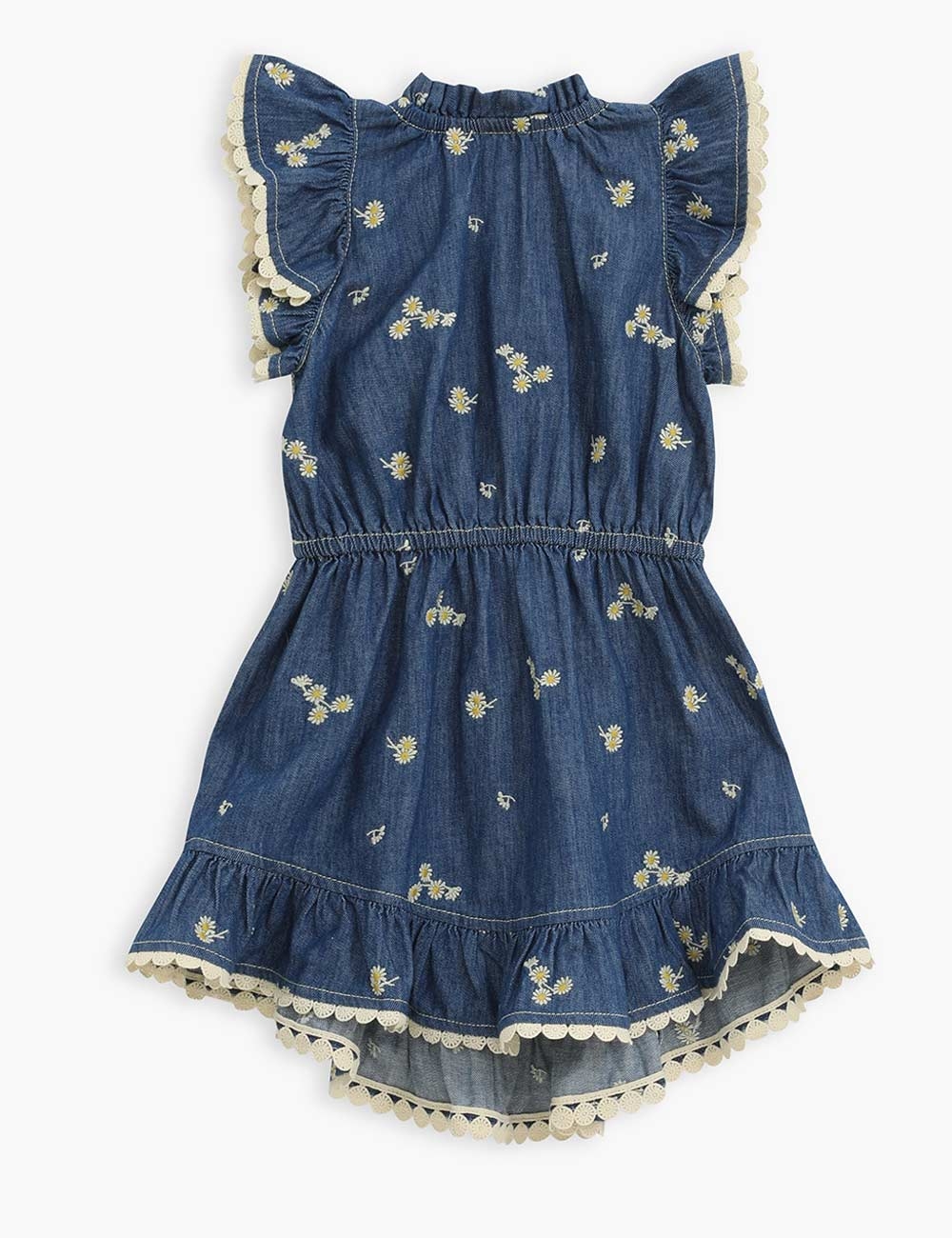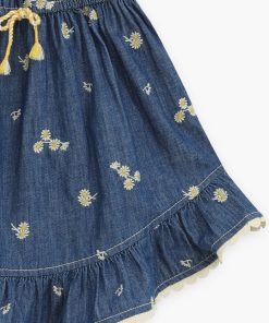 The Lucky Kids Denim Flip Dress in Daisy from our Summer Swim 2025 Collection. A cotton flip dress featuring a playful flip hem with gathered frill neckline and sleeves.kids cotton dress with denim-like finish, gathered frills at neckline and shoulders, flip hem with embroidered trim, drawstring waist with fixed bow