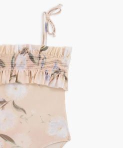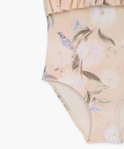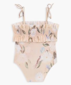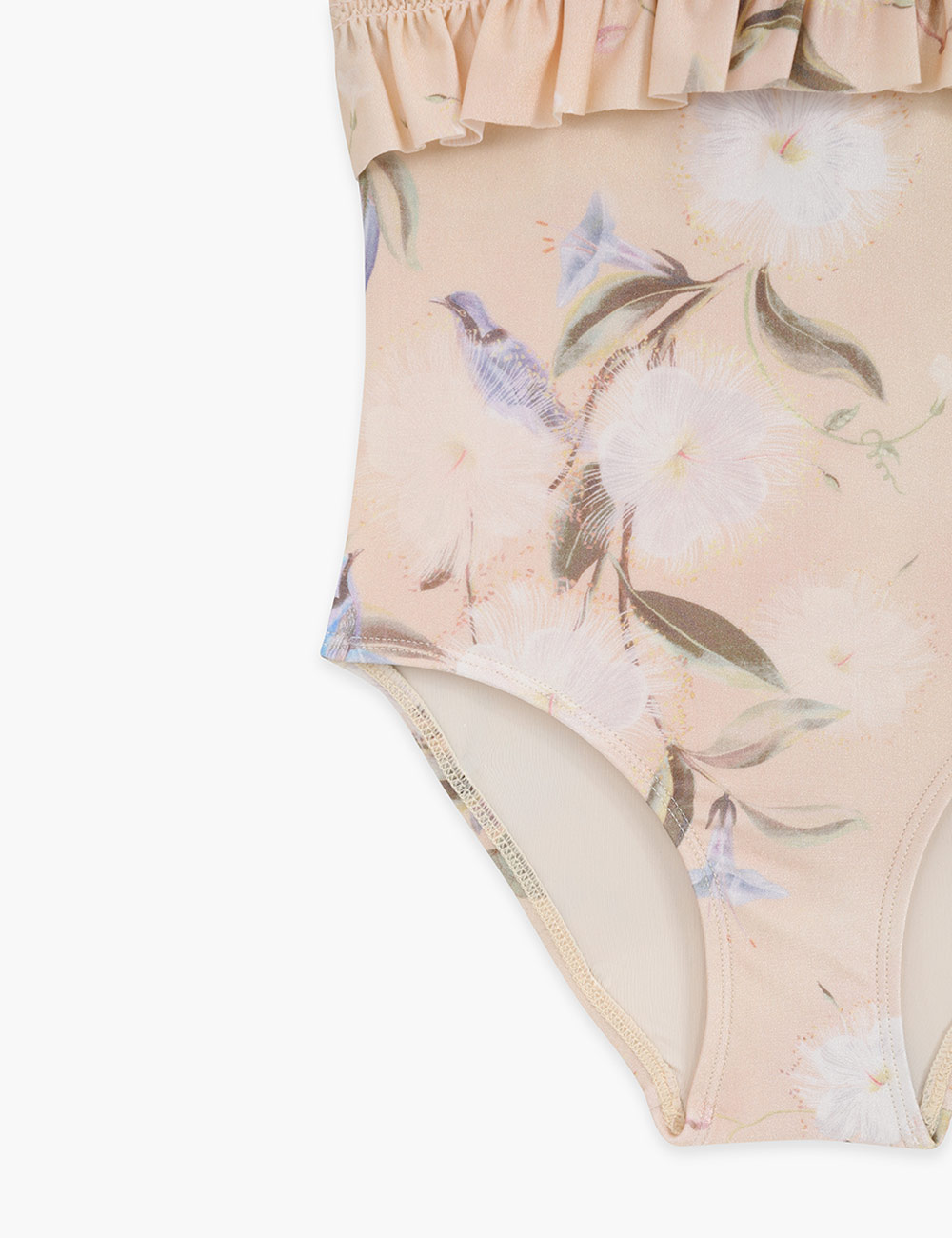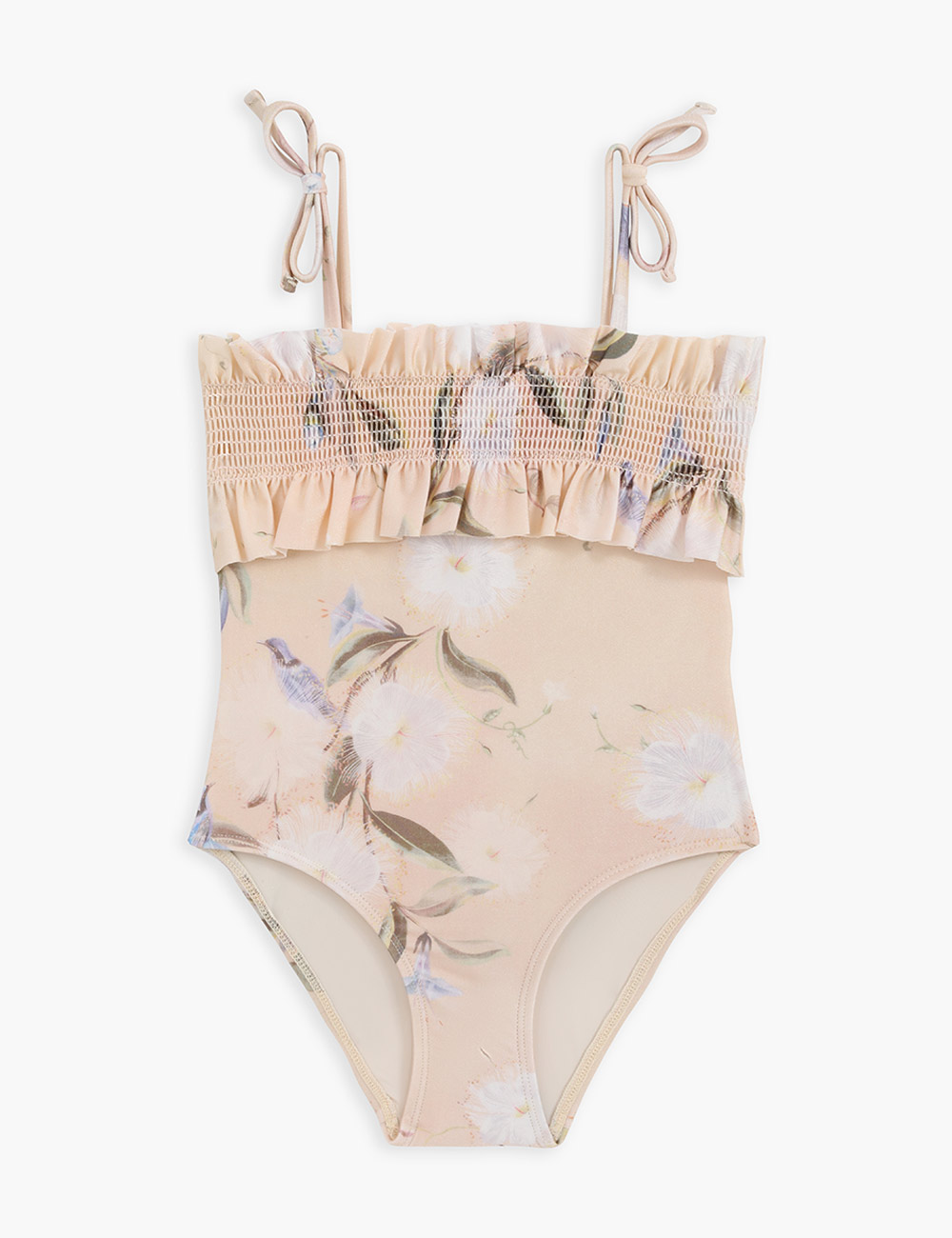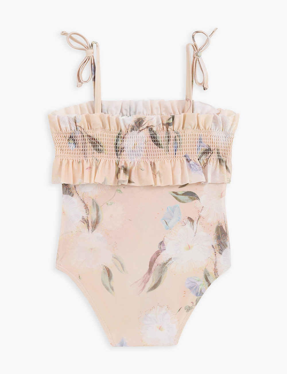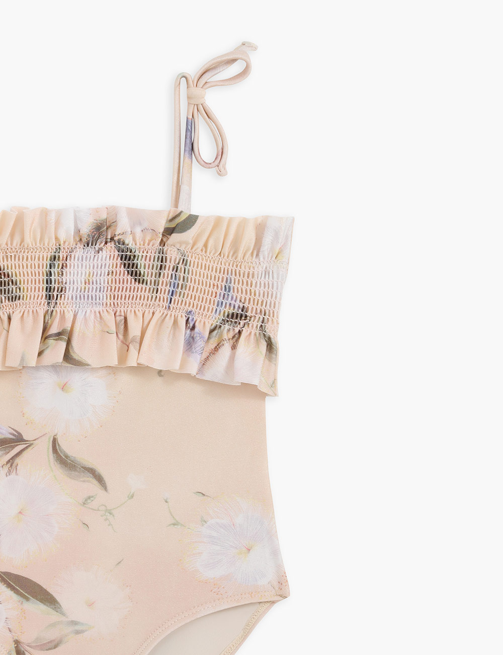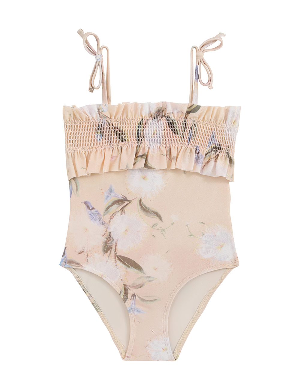The Cascadian Kids Shirred 1PC in Cream Botanical Floral from our Summer Swim 2025 Collection. A kids one piece swimsuit featuring fixed bow tie shoulder straps, shirred bodice and frilled edges. kids lycra one piece with shiny finish, self fixed bow tie at shoulder straps, shirring panel across bodice with frill detailing, lined
