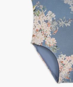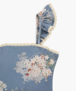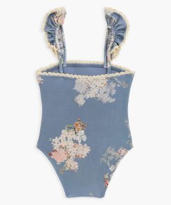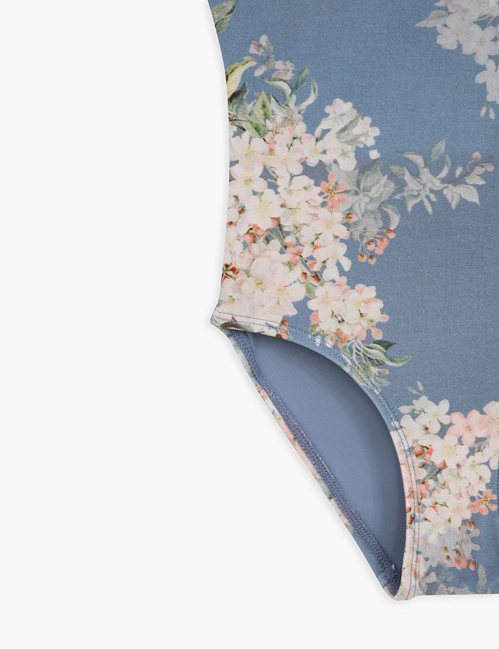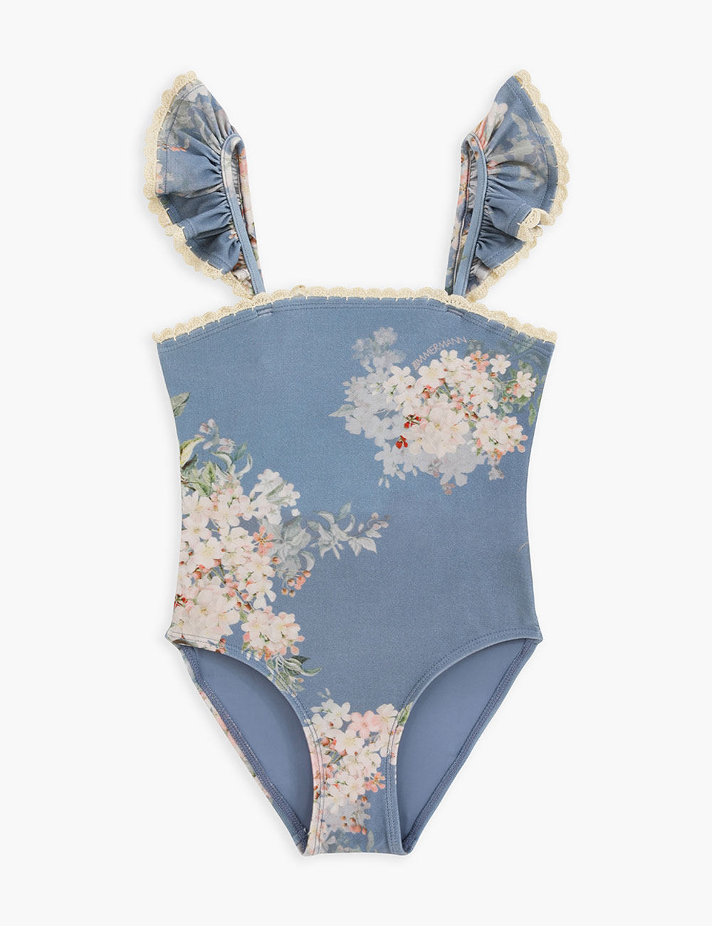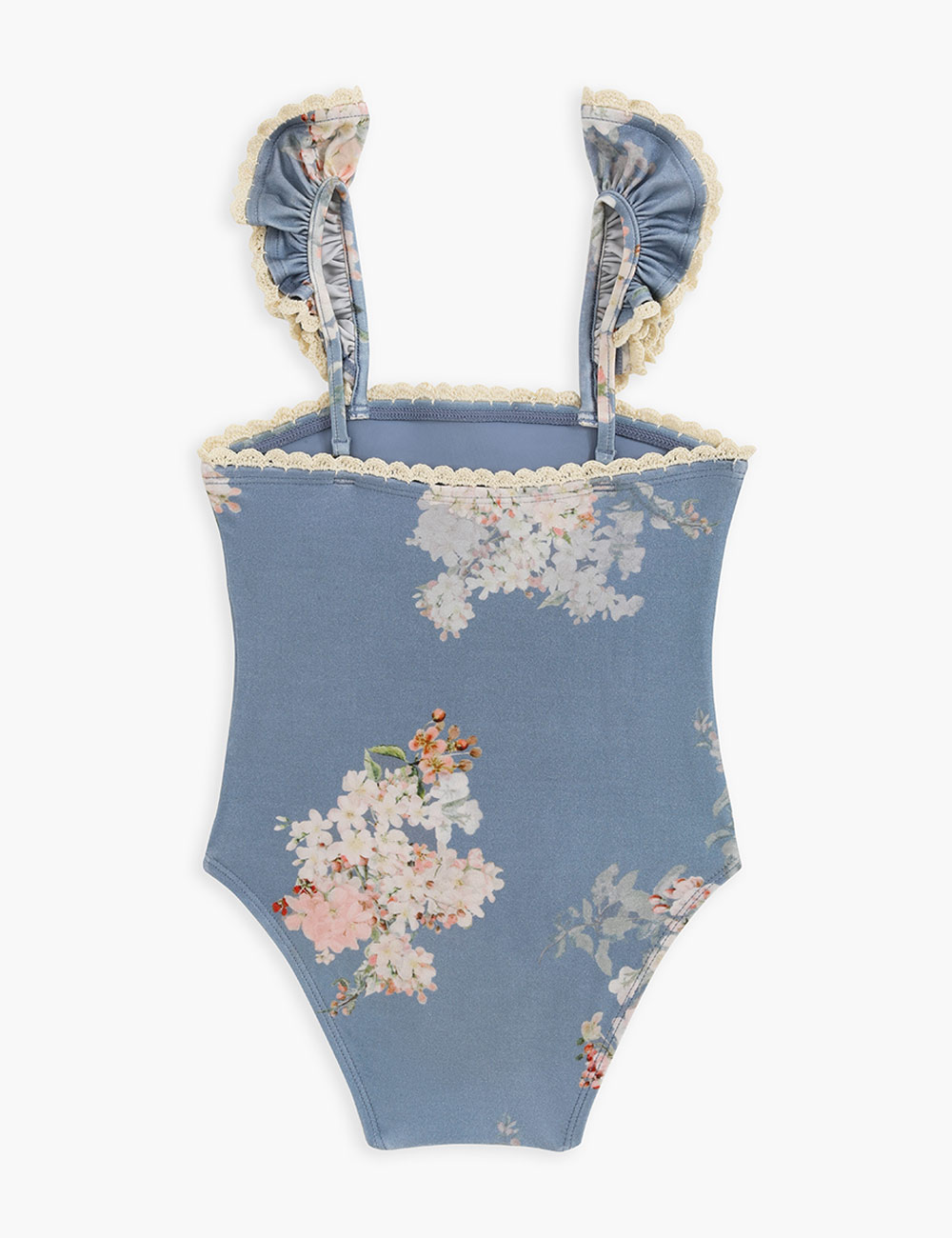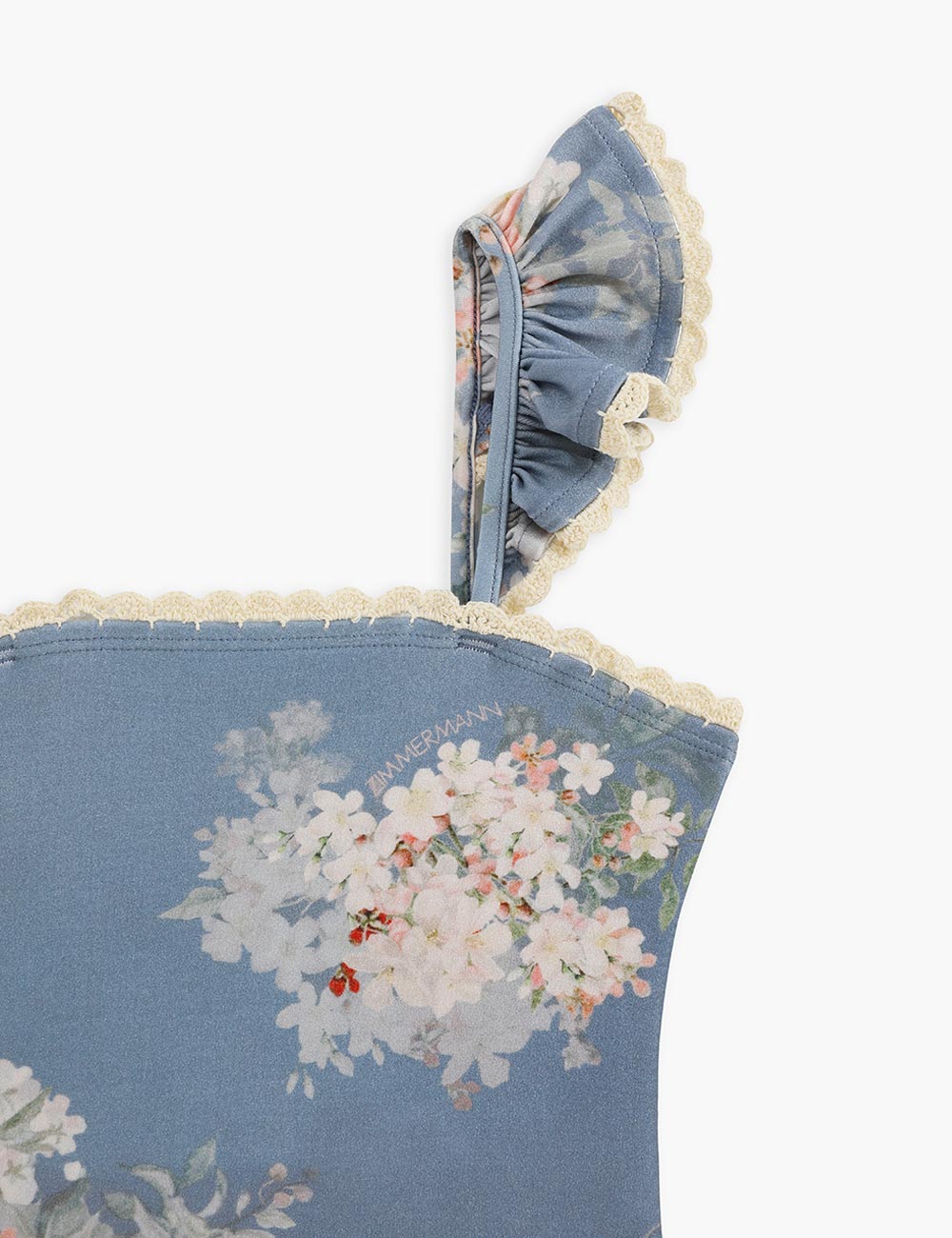 The Cascadian Kids Trim Frill 1PC in Teal Blue Botanical Floral from our Summer Swim 2025 Collection. A kids one piece featuring frilled shoulder straps and scalloped edging throughout. kids lycra one piece with shiny finish, gathered shoulder frill with scalloped edges, crochet trim, lined