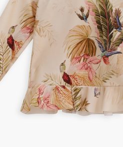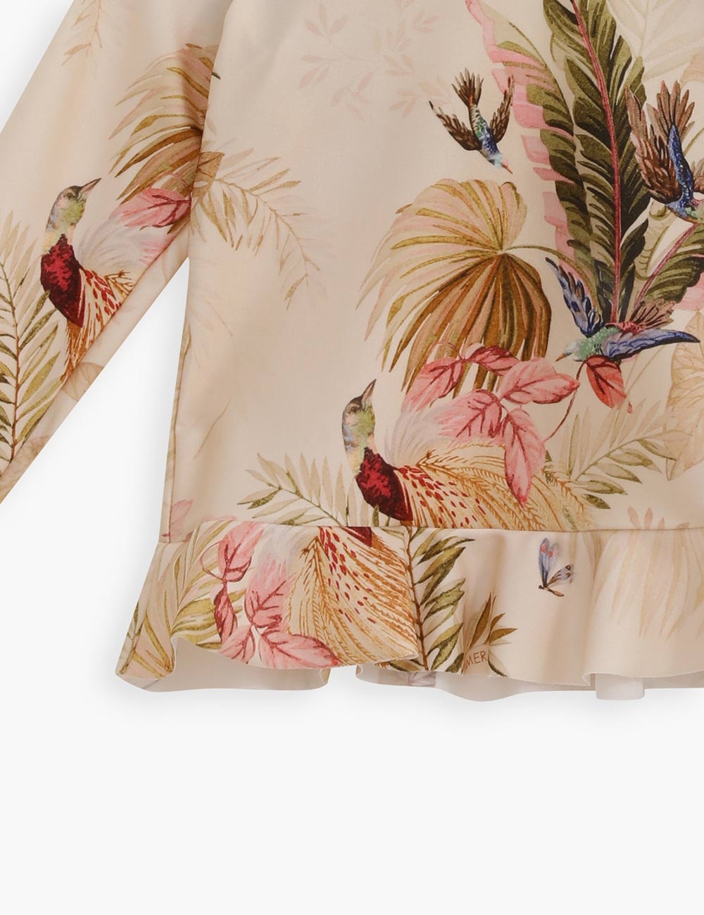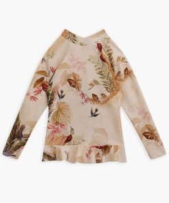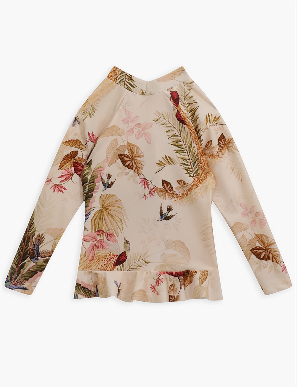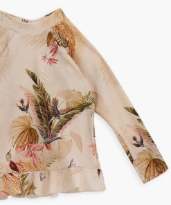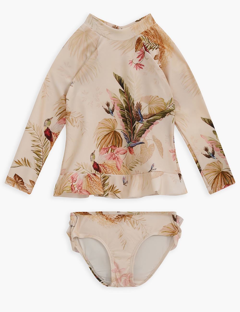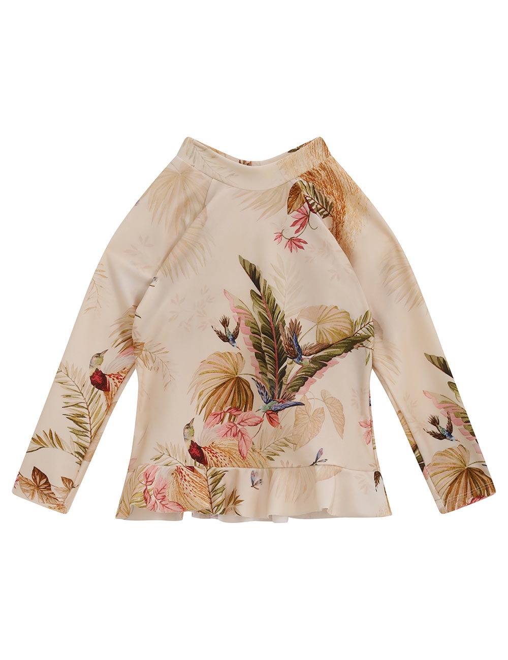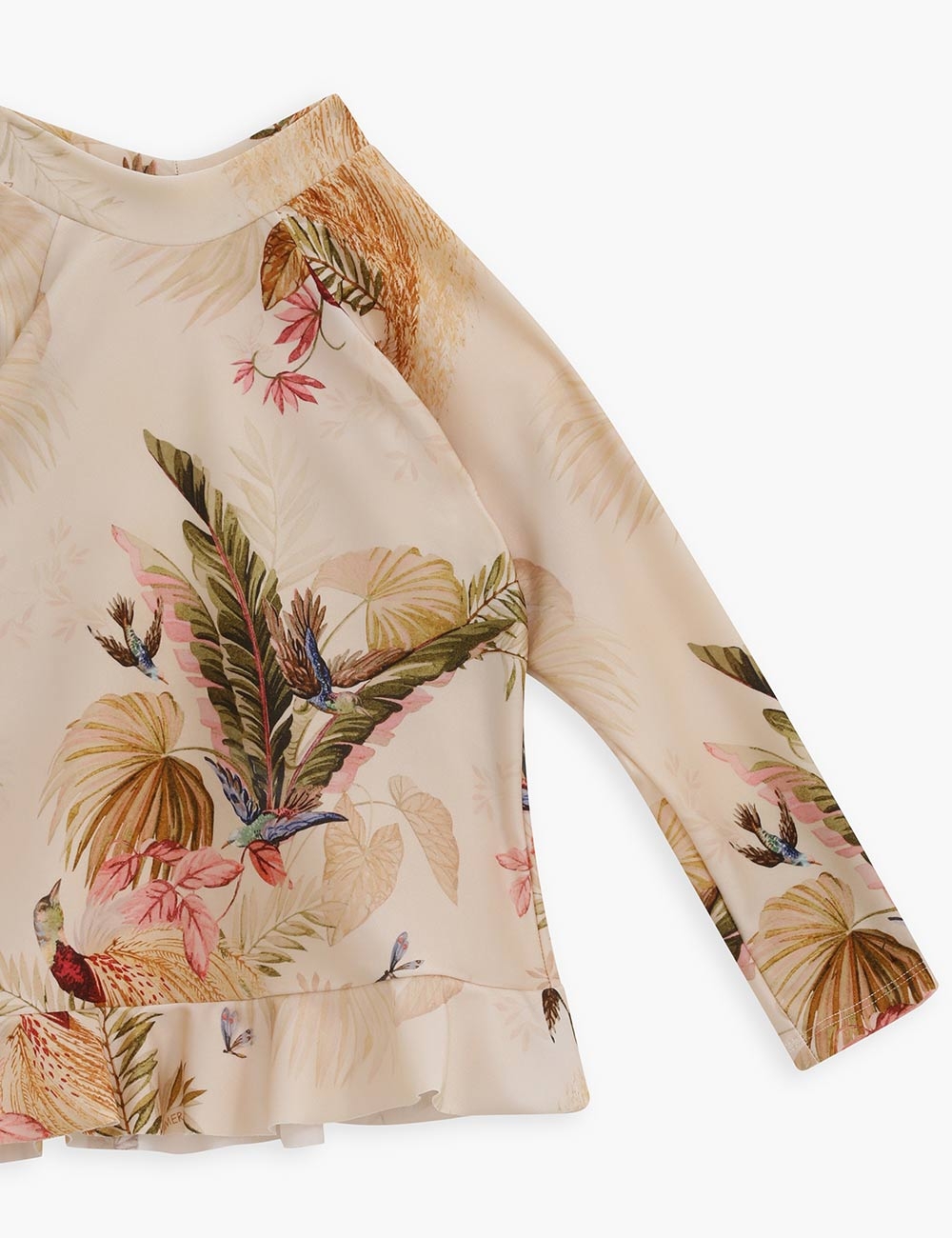 The Rhiannon Kids Frill Rashie in Cream Palm Floral from our Summer Swim 2025 Collection. A long sleeve rash shirt featuring raglan shoulders and playful frill hem. long sleeve rash shirt, raglan shoulders, frill hem, round neckline