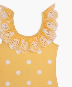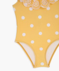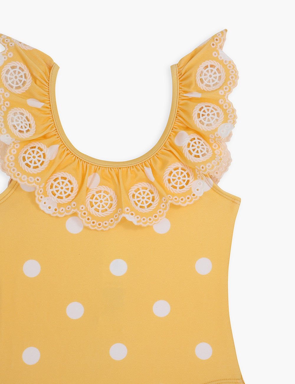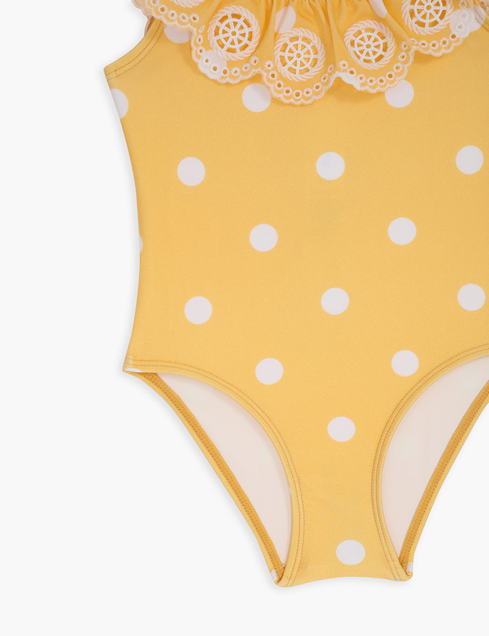 The Scarborough Kids 1PC in Yellow/Ivory Polka Dot from our Summer Swim 2025 Collection. A kids one piece swimsuit featuring a frilled neckline with scalloped trim and gathering.kids one piece swimwear, crochet trim with scalloped edges, frill detailing across neckline and back, lined