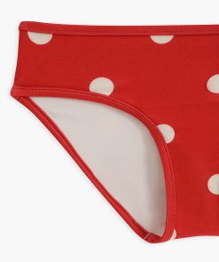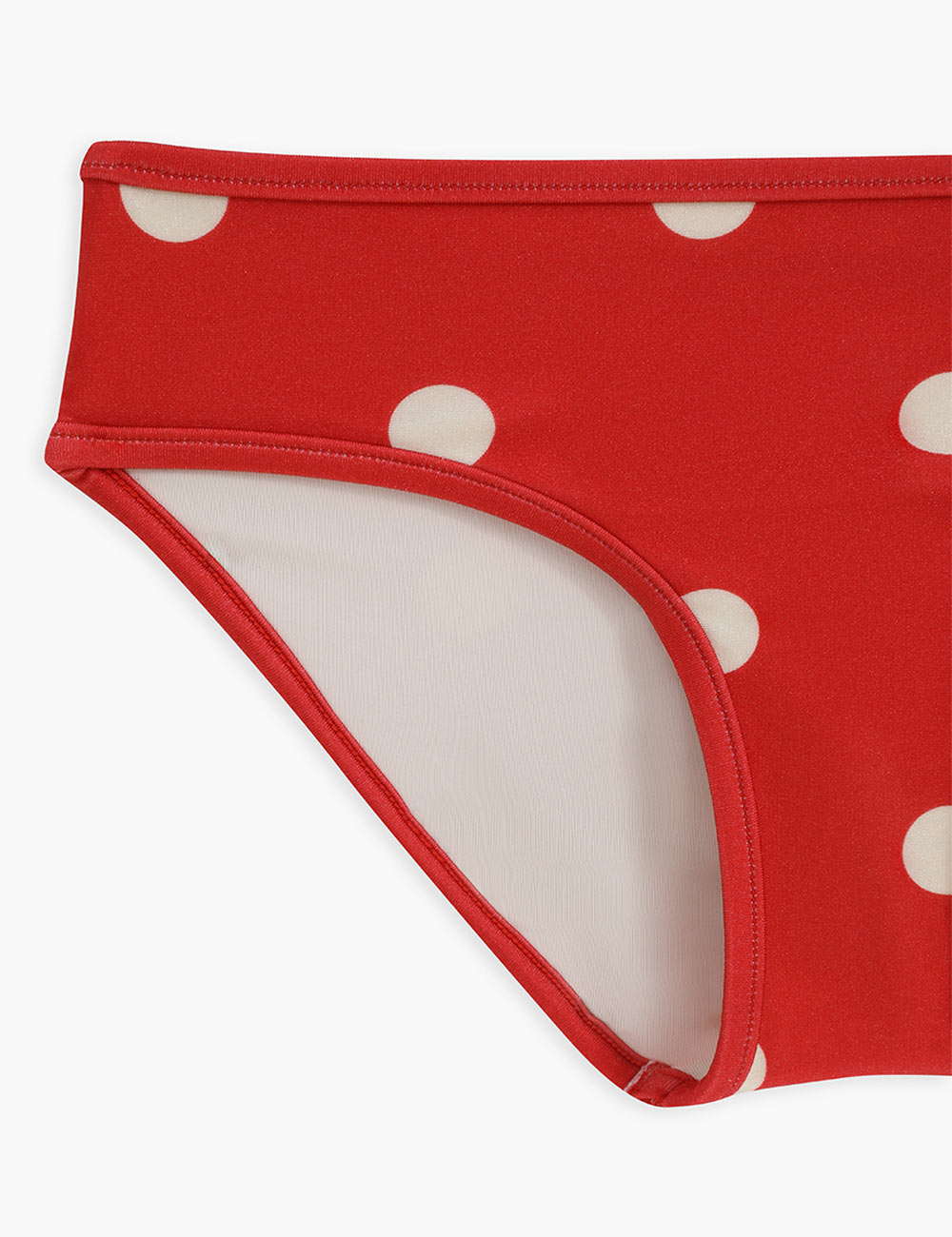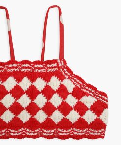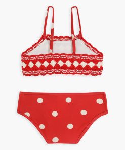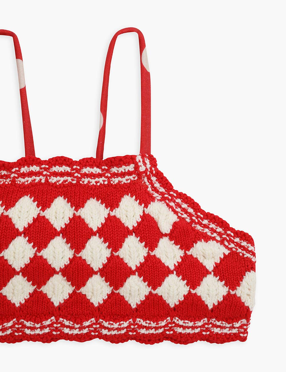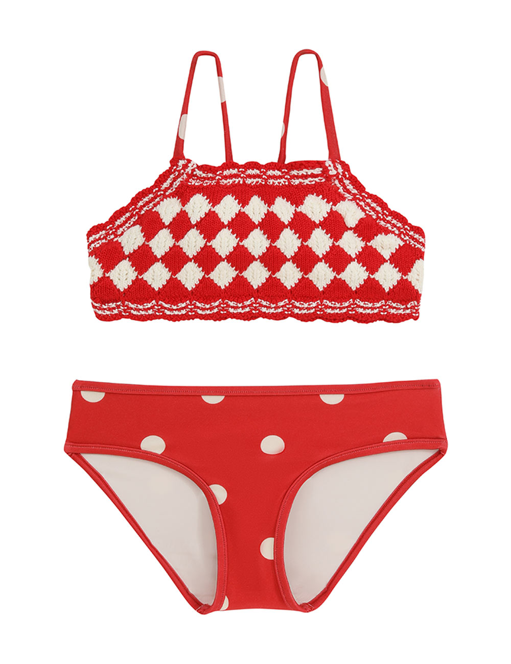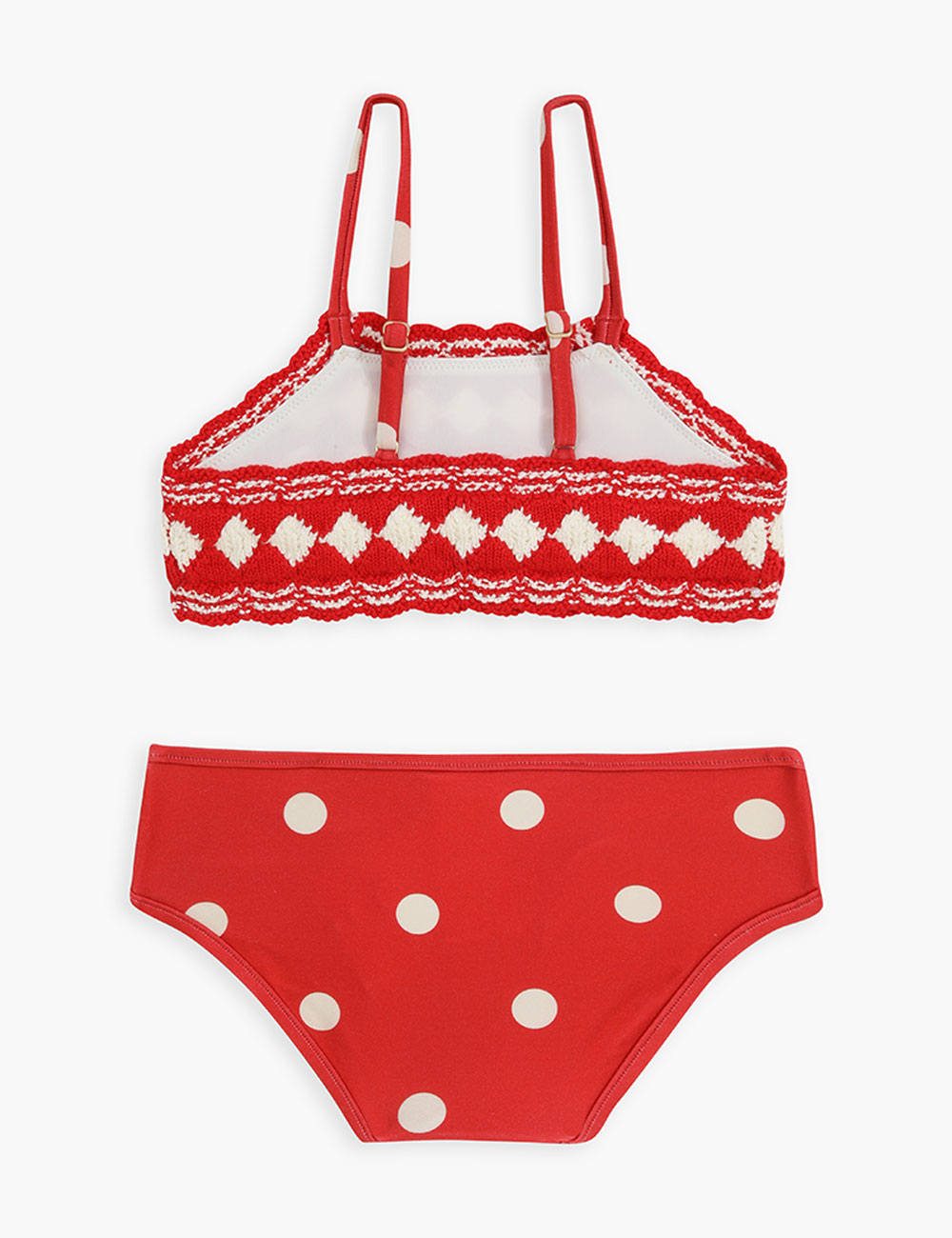 The Scarborough Kids Knit Bandeau in Red/Ivory from our Summer Swim 2025 Collection. A kids bikini set featuring crochet detailing across top and scalloped edges.kids bikini set, crochet trim, adjustable criss-cross straps, lined