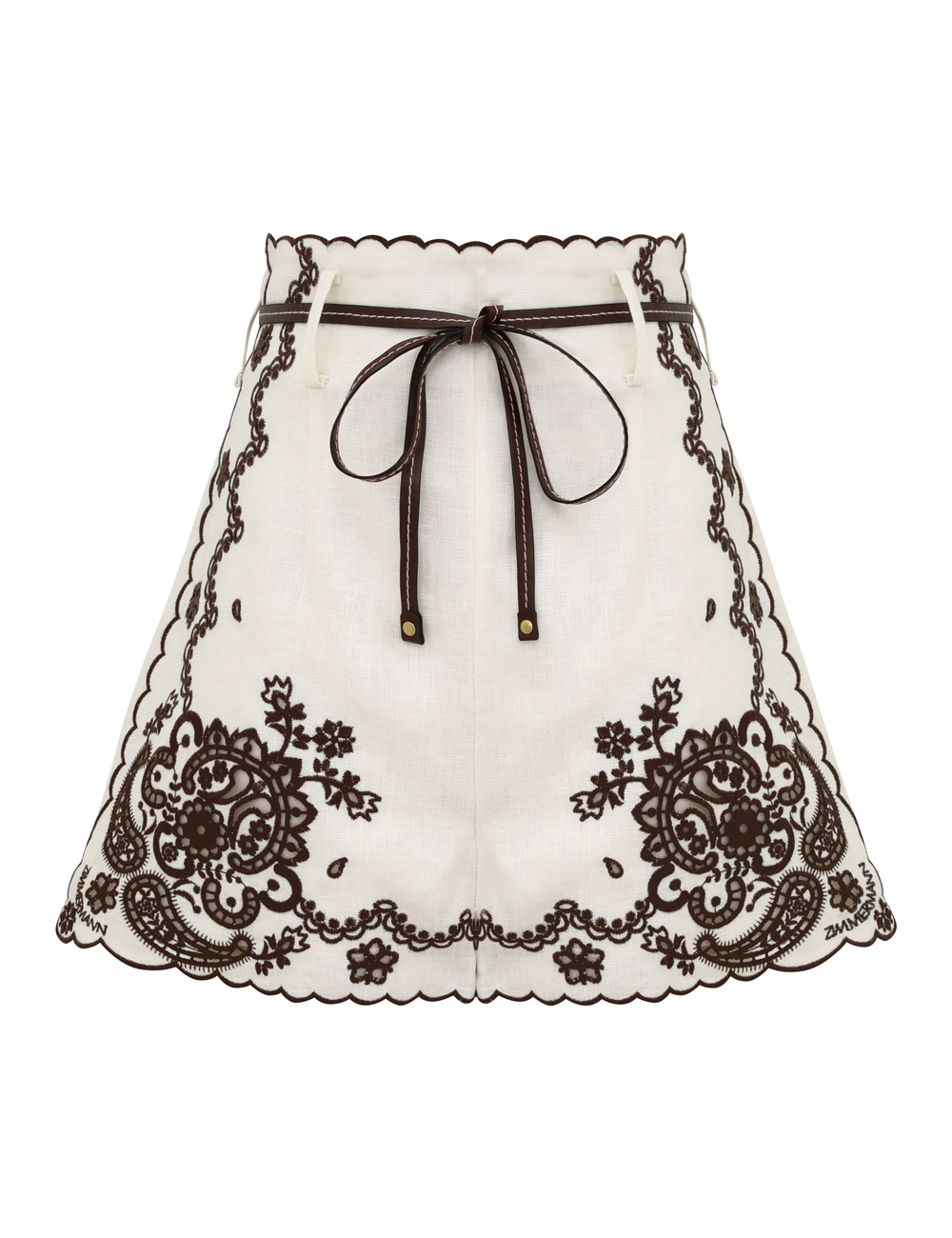 The Ascension Embroidered Short in Ivory/Chocolate from our Summer Swim 2025 Collection. A high waisted linen short featuring a removable leather belt, scalloped edging and an invisible centre back zip closure. 100% linen fabric, belt loops with removable self tie belt, invisible zip closure at centre back, scalloped embroidery along the waist, sides and hem, lined