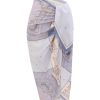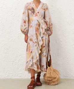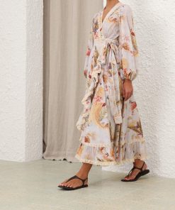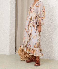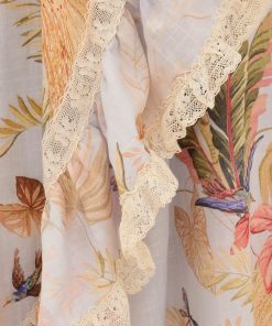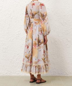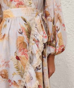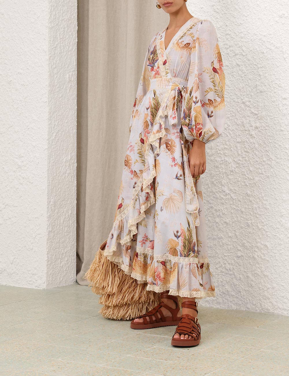 The Ascension Frill Midi Dress in Light Blue Palm Floral from our Summer Swim 2025 Collection. A cotton midi dress featuring a plunging V-neckline, long billow sleeves with elasticated cuffs and a self-tie waist, finished with frill pleated detailing throughout.100% cotton fabric, loose sleeves gathered at cuffs, self-tie belt sewn at the waist, lace trim throughoutfrilled hem, lined skirt