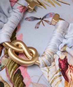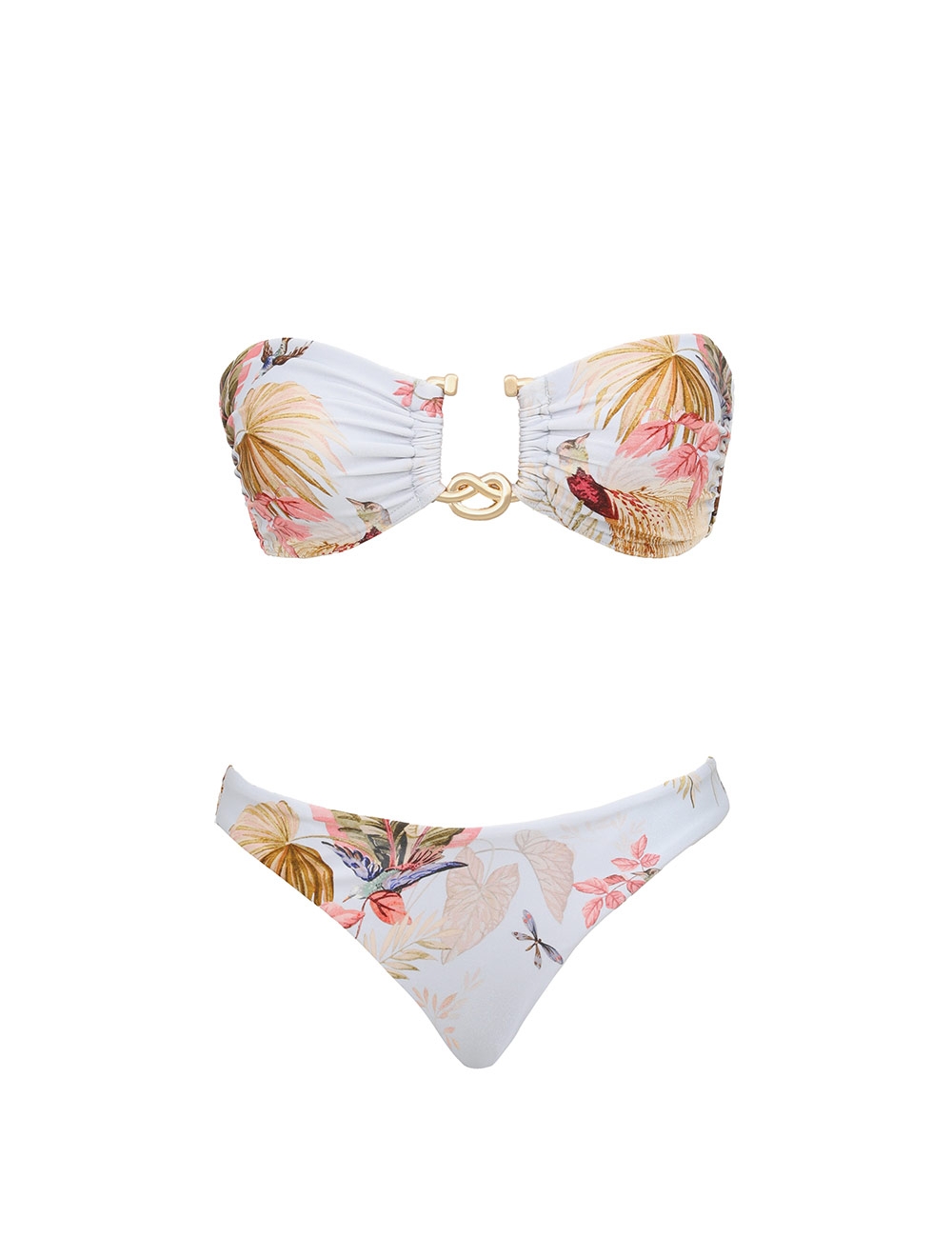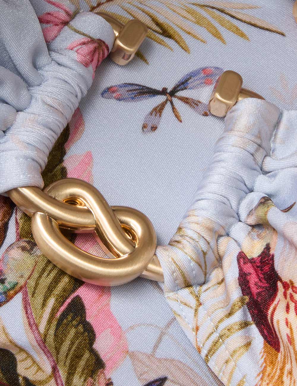The Ascension Knot Trim Bikini in Aqua Palm Floral from our Summer Swim 2025 Collection. A lycra bikini set featuring a wire knot detail, gathering at the bust, adjustable straps and boning in the bra.shiny lycra bikini set, underwire and side seam boning, detachable and adjustable seamless straps, gathering at side of front bra between notches, classic pant, lined
