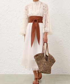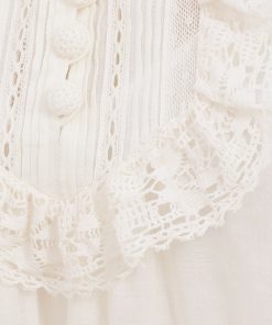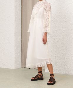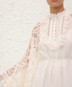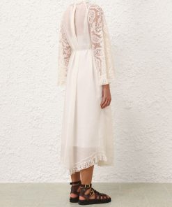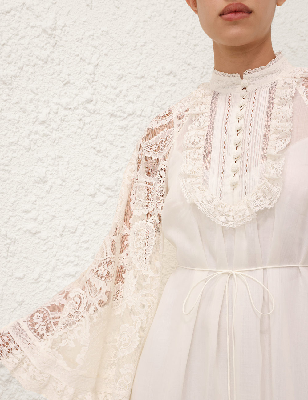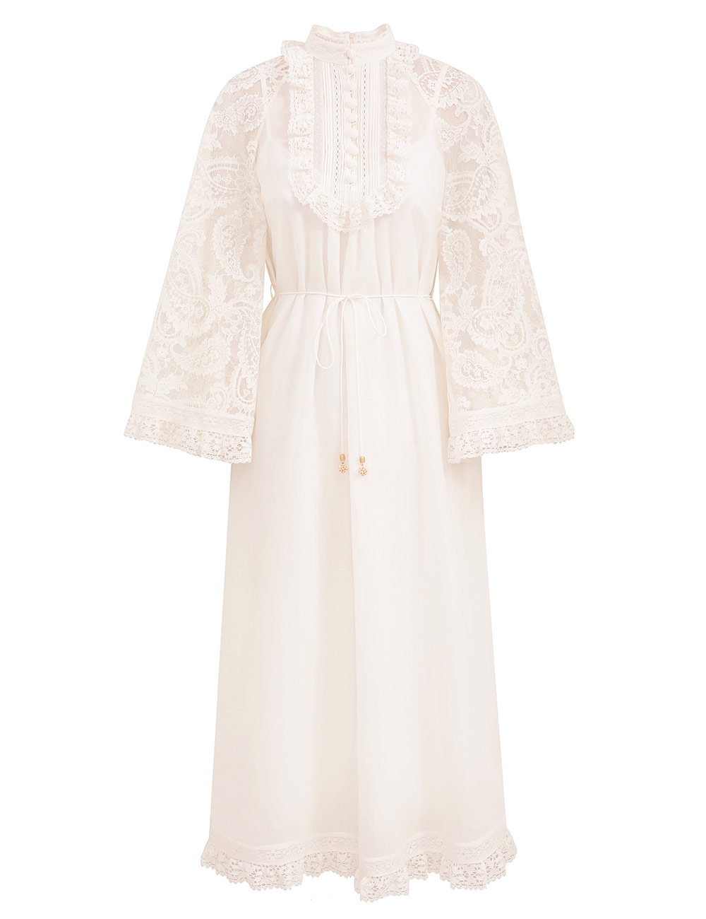 The Ascension Lace Yoke Midi Dress in Cream from our Summer Swim 2025 Collection. A ramie midi dress featuring long, loose sleeves with lace trim, a stand collar and self rouleau buttons down the centre front, finished with a waist tie and frilled hem. 100% ramie fabric, long, wide sleeves, lace trim detailing along collar, sleeves and hem, removable self tie belt at waist, invisible zip closure at center back, comes with separate slip