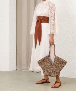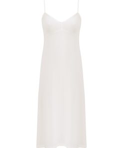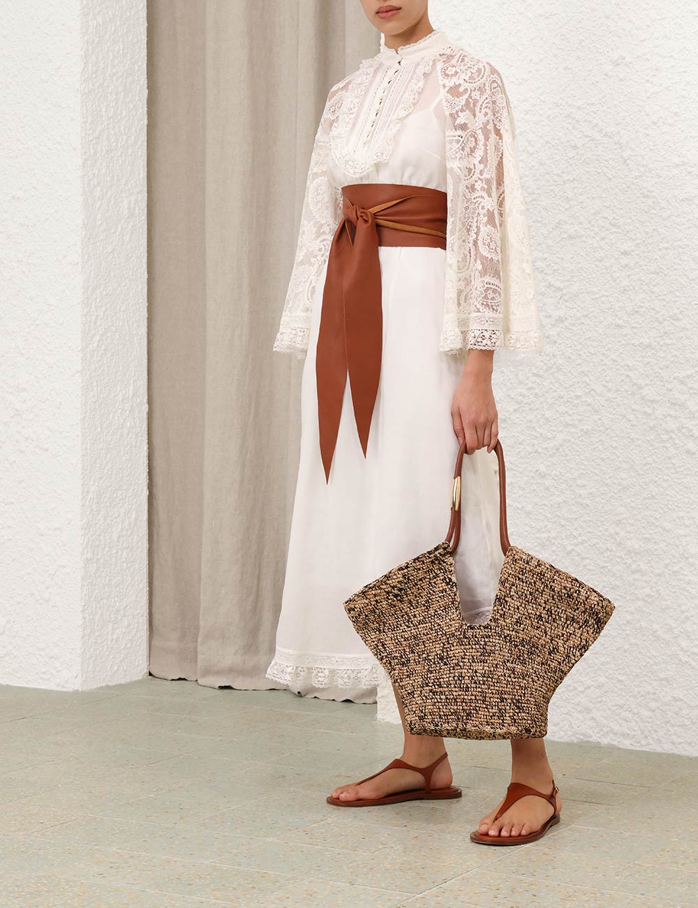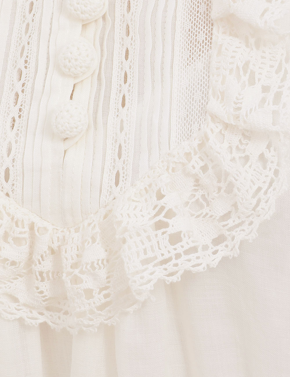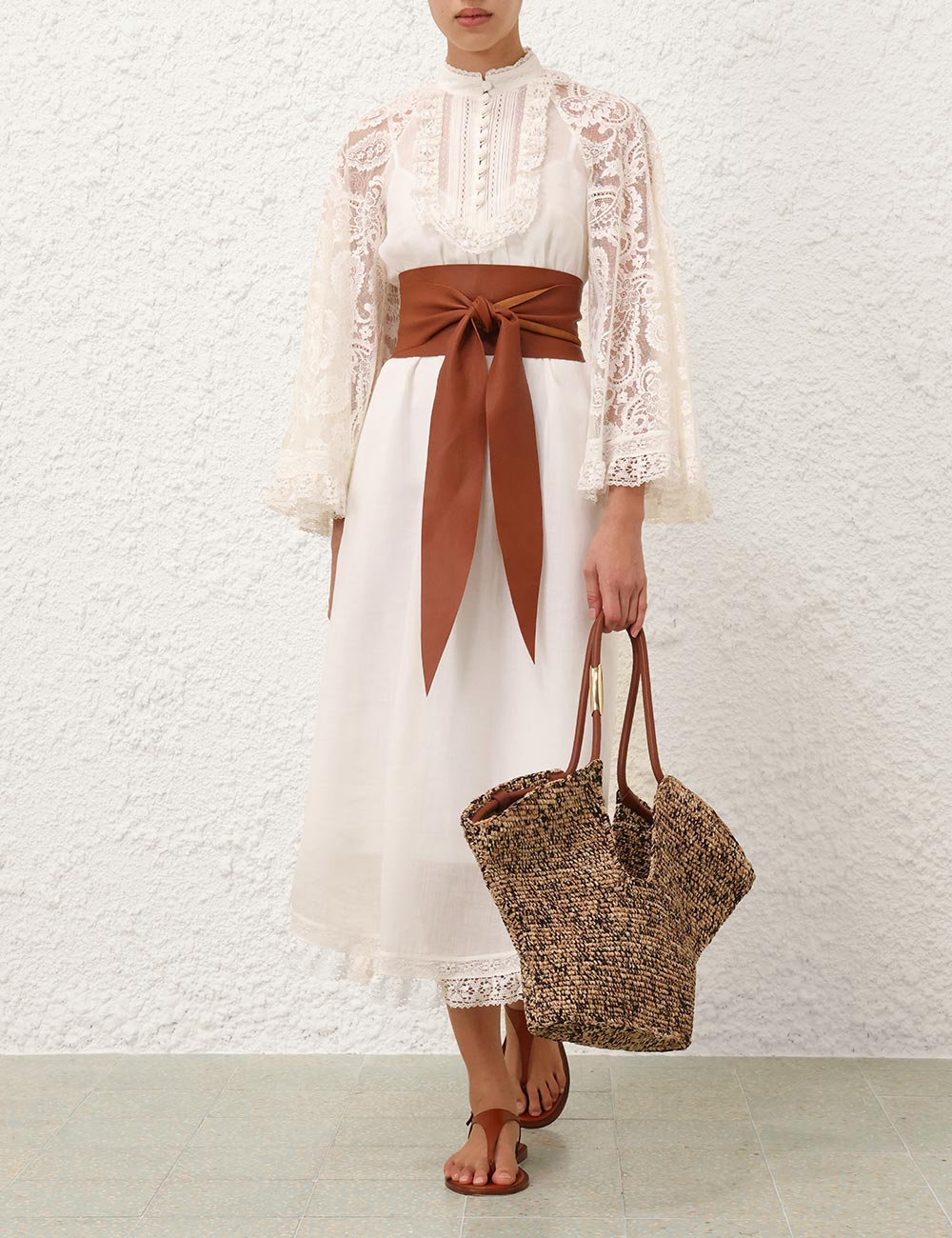 The Ascension Lace Yoke Midi Dress in Cream from our Summer Swim 2025 Collection. A ramie midi dress featuring long, loose sleeves with lace trim, a stand collar and self rouleau buttons down the centre front, finished with a waist tie and frilled hem. 100% ramie fabric, long, wide sleeves, lace trim detailing along collar, sleeves and hem, removable self tie belt at waist, invisible zip closure at center back, comes with separate slip