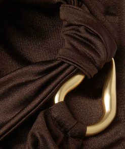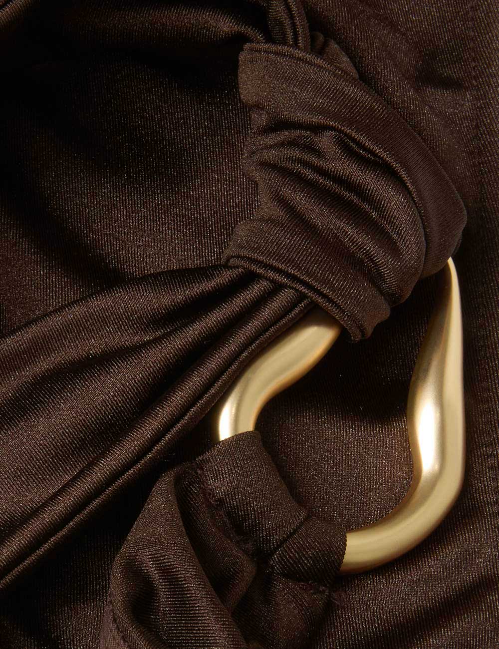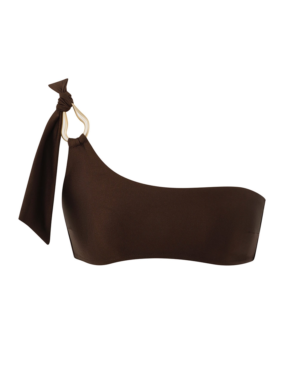 The Ascension Trim Bikini Top in Chocolate from our Summer Swim 2025 Collection. A lycra bikini top featuring a knot strap with gold detailing at the shoulder, adjustable strap and boning at the sides, finished with the classic ZIMMERMANN clasp. lycra bikini top with shiny finish, one shoulder knot feature, boning inserted at side seam, lined, top only, pant sold separately