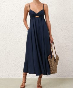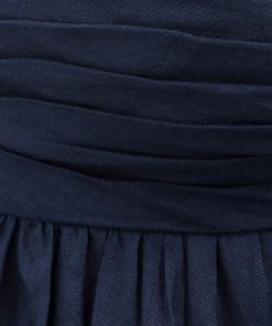 The Ascension Twist Front Dress in Dark Blue from our Summer Swim 2025 Collection. A linen midi dress featuring a sweetheart neckline, twist front feature detail and wooden bead detailing on the straps, finished with a pleated drop style skirt.100% linen fabric, adjustable straps with wooden beaded trim, shirred elastic across back, hook and bar closure, scooped lower back, boning in the bodice , invisible zip closure at lower back