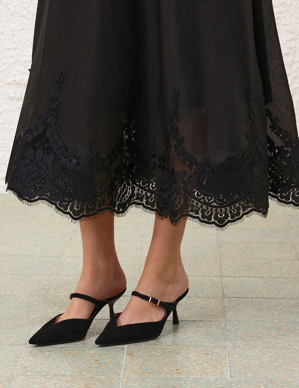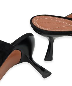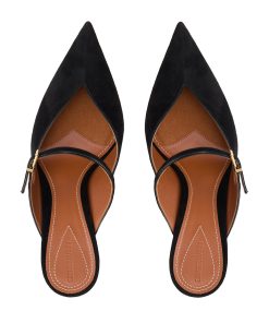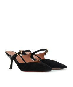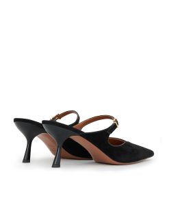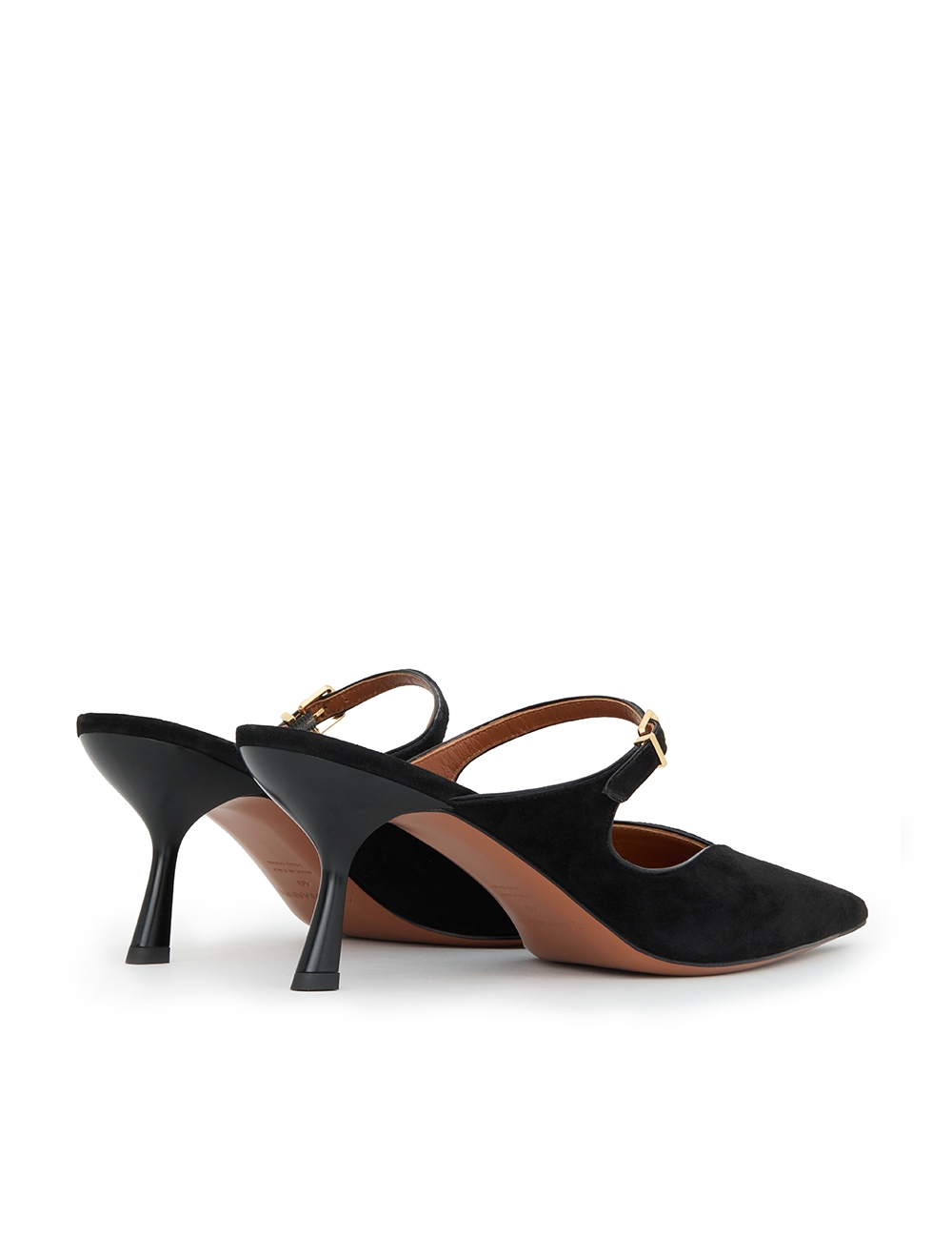 The Aura Mule 65 in Black from our Fall 2025 Collection, Hypnotic. Crafted in Italy, Aura adds effortless elegance to every occasion. suede mule, sweetheart silhouette, pointed toe, adjustable gold buckle hardware, 65mm stiletto heel, made in italy