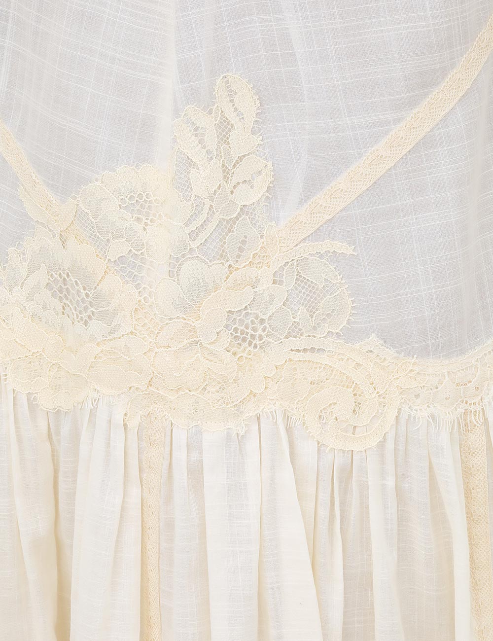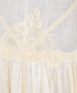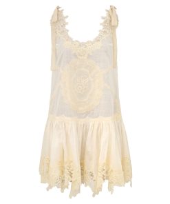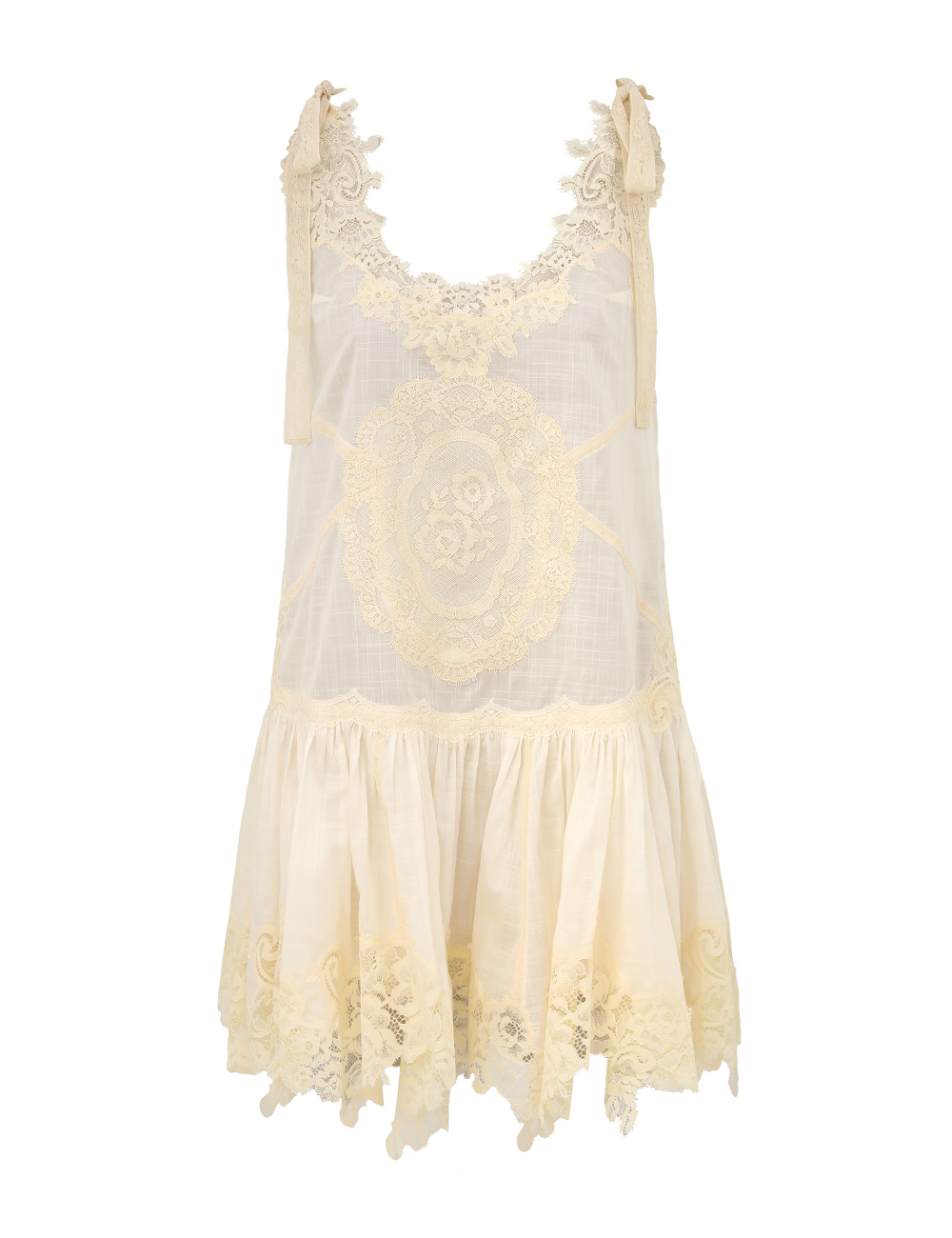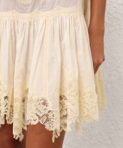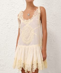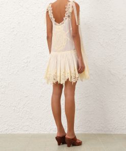 The Cascadian Lace Mini Dress in Cream from our Summer Swim 2025 Collection. A cotton mini dress featuring a scoop neckline, bow tie shoulder straps and contrasting lace trim throughout.100% cotton fabric, self-tie shoulder straps for flexible fit, spliced fabric with spliced trims, gathered skirt, scalloped edging