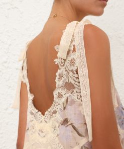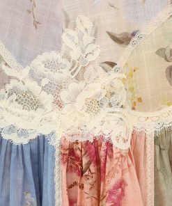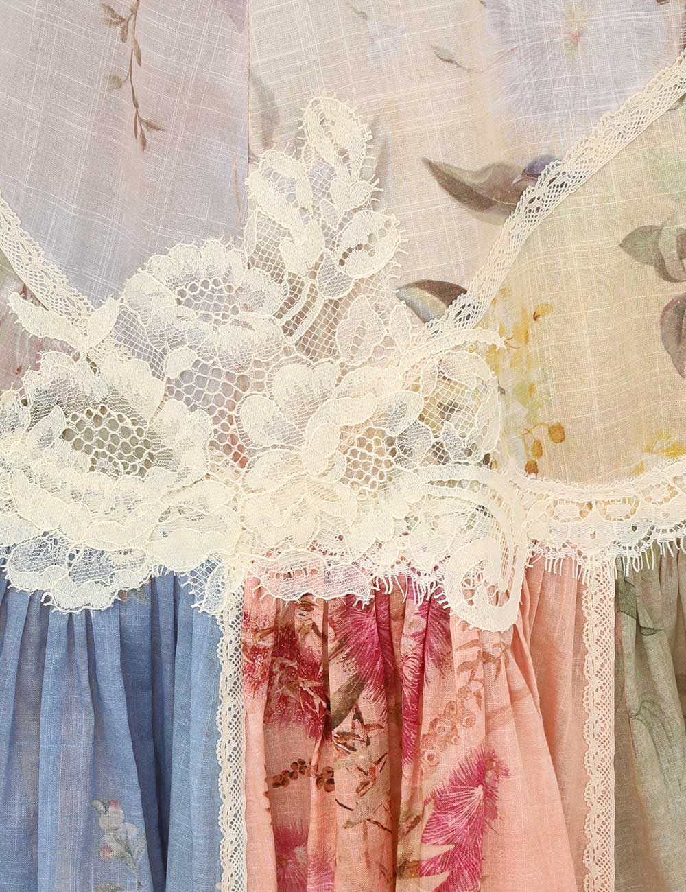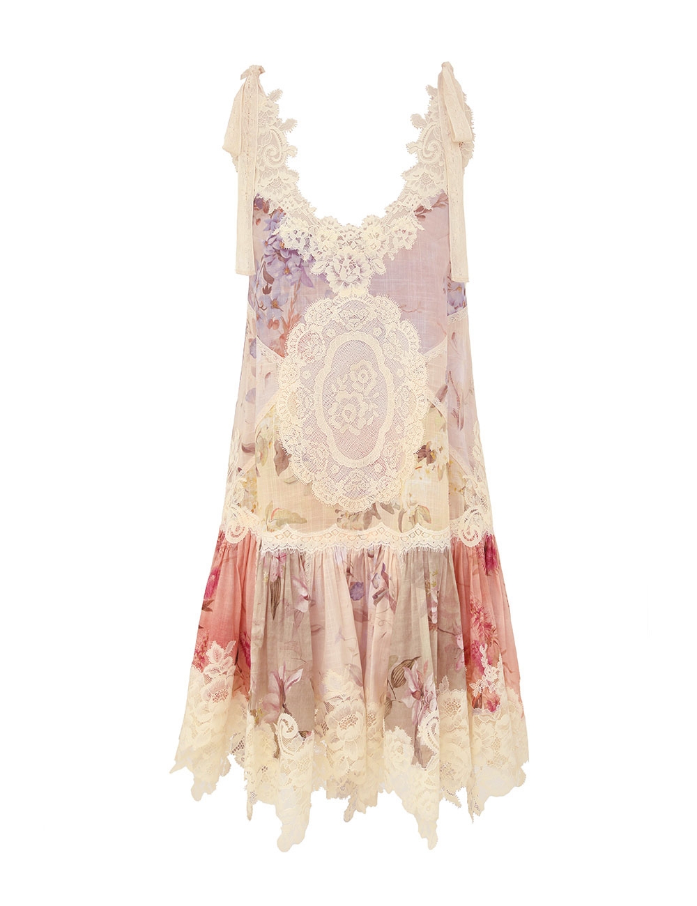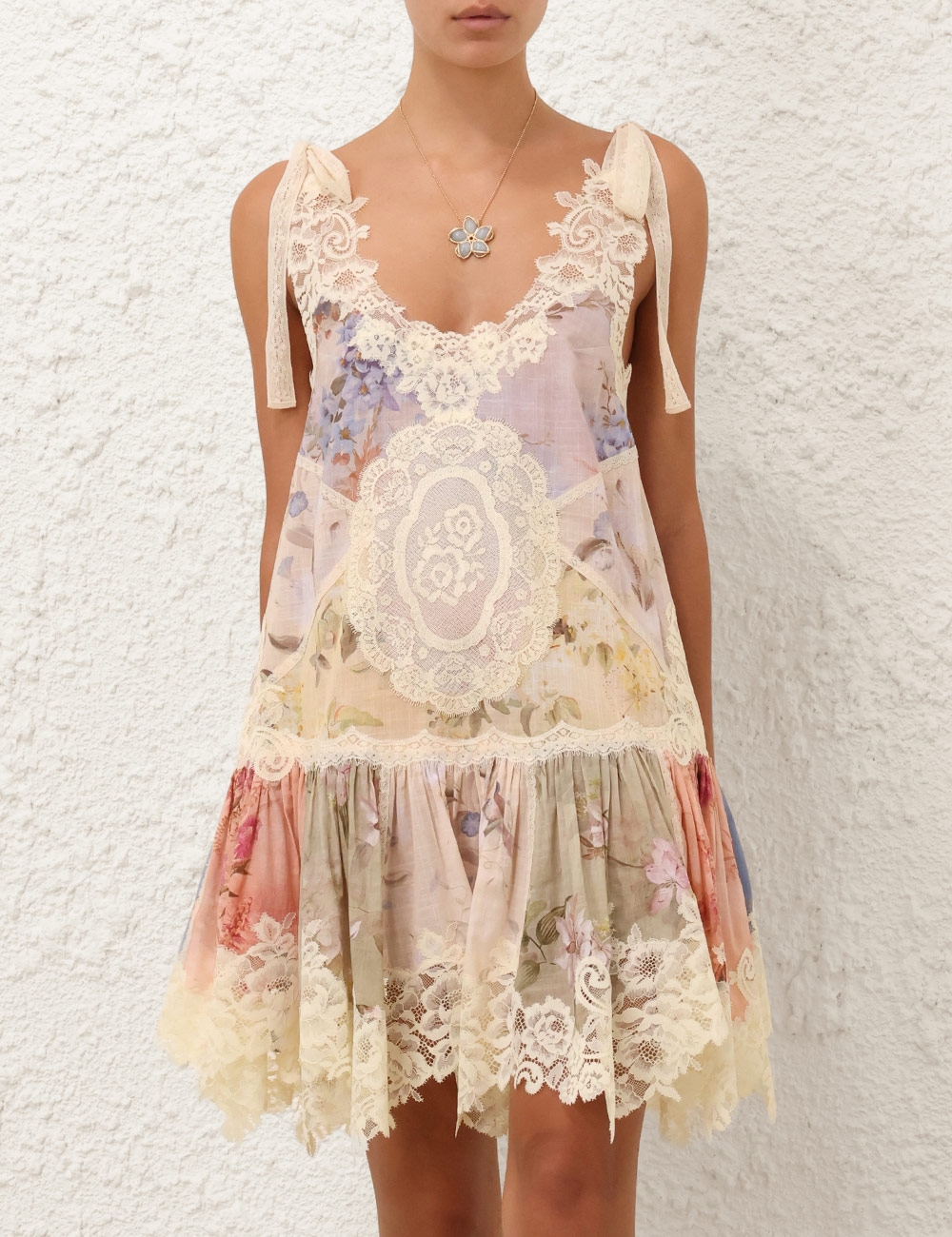 The Cascadian Lace Mini Dress in Spliced from our Summer Swim 2025 Collection. A cotton mini dress featuring a scoop neckline, bow tie shoulder straps and contrasting lace trim throughout.100% cotton fabric, self-tie shoulder straps for flexible fit, spliced fabric with spliced trims, gathered skirt, scalloped edging