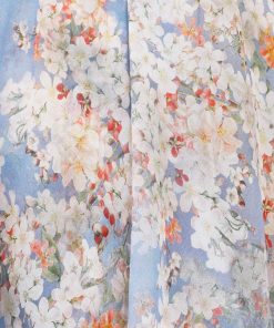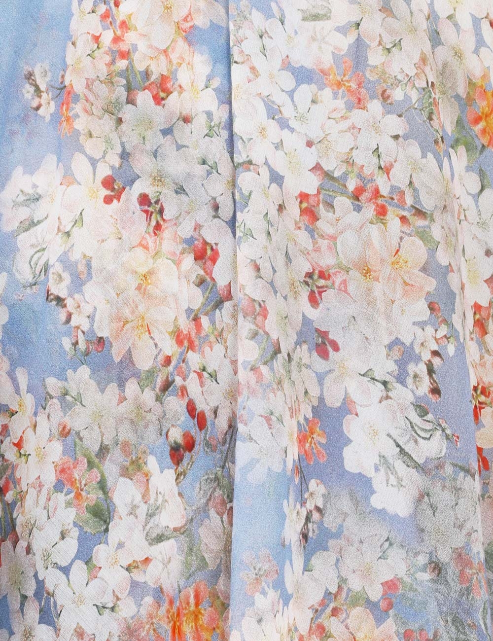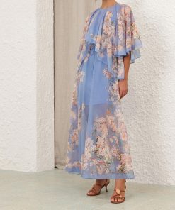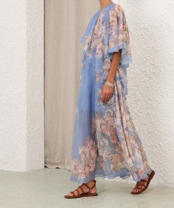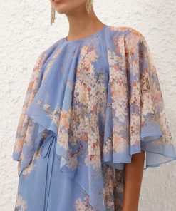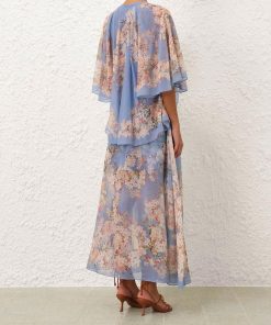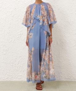 The Cascadian Tiered Maxi Dress in Teal Blue Botanical Floral from our Summer Swim 2025 Collection. A silk maxi dress featuring a boat neckline, removable waist tie and loose sleeves, finished with a tiered ruffle detailing.silk cotton georgette fabric, raglan sleeve dress, rouleau loop at sides and waist belt with toggle ends, tiered ruffle detailing at centre front and back, invisible zip closure at centre back, comes with separate slip