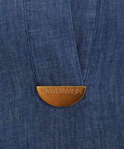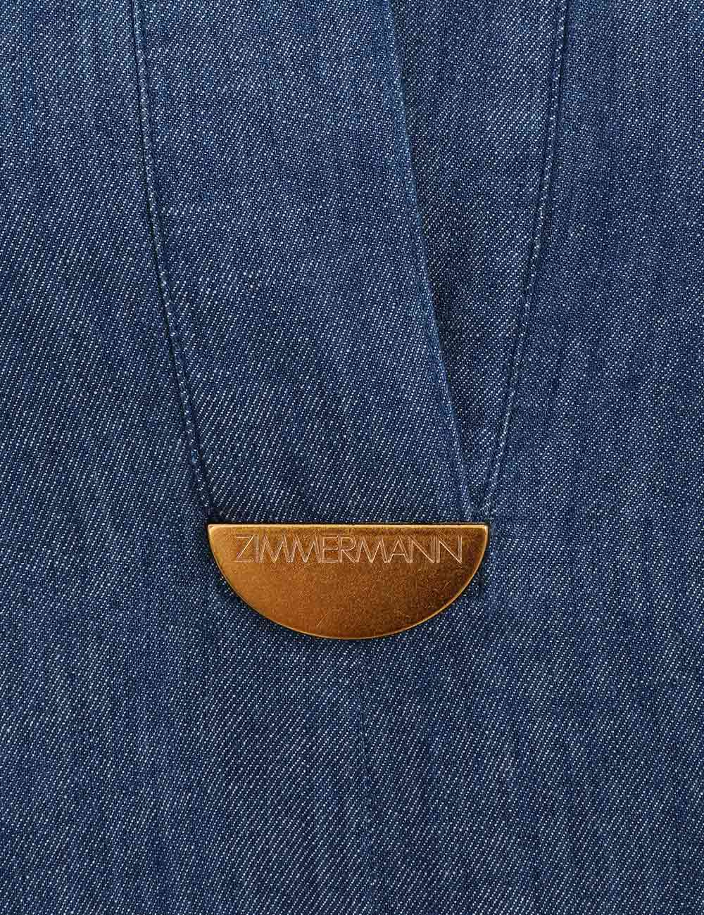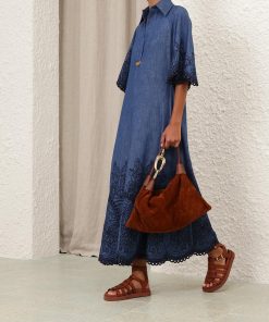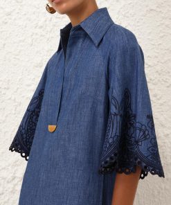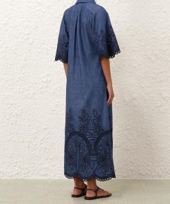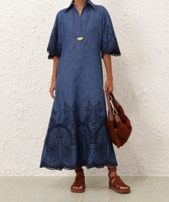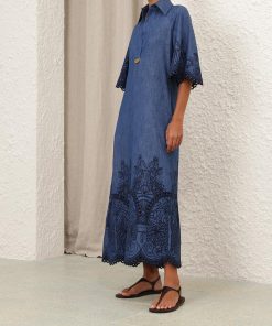 The Coco Embroidered Denim Dress in Railway Blue from our Summer Swim 2025 Collection. A denim maxi dress featuring a classic collar, V-neckline and raglan sleeves, finished with a pleated skirt.denim tunic dress, quarter length raglan sleeves with lace trim, gathered skirt, scalloped edging, functional side pockets, embroidered throughout, slip on style
