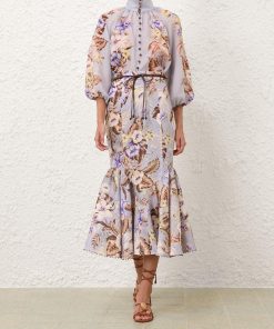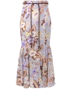 The Coco Fit and Flare Midi Skirt in Powder Blue Multi Floral from our Summer Swim 2025 Collection. A fitted linen midi skirt featuring a removable waist belt and frill detailing at the hem, finished with a wooden bead edge trim.100% linen fabric, fitted skirt with panel seams at the front and back, removable wooden beaded belt, invisible zip at centre back with hook and eye, gather side hem frills, unlined skirt