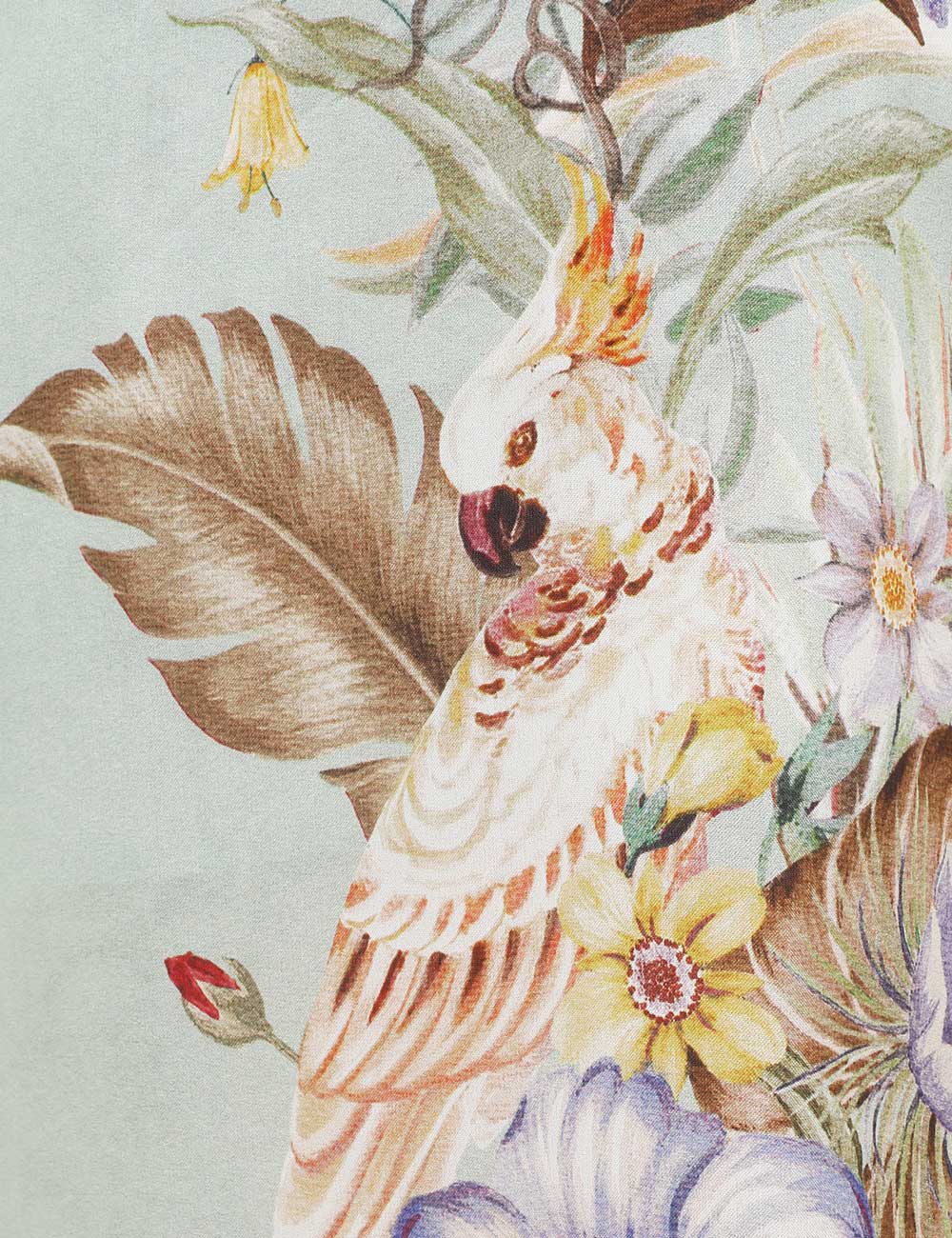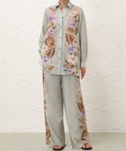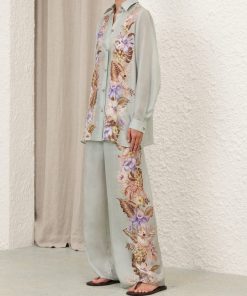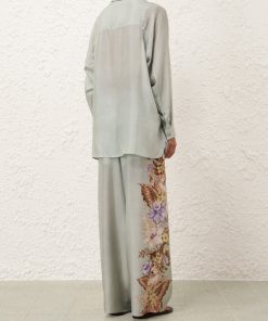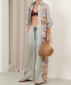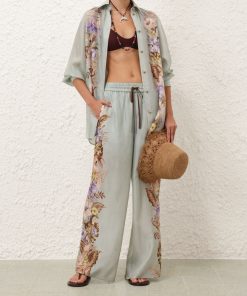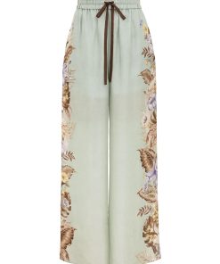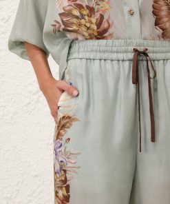 The Coco Relaxed Pant in Sage Multi Floral from our Summer Swim 2025 Collection. A silk wide leg pant featuring an elasticated waistband and pockets, finished with a bold print along the sides. 100% silk habutae fabric, full-length pant, drawstring waistband, side seam pockets, pant is fully lined up to short length