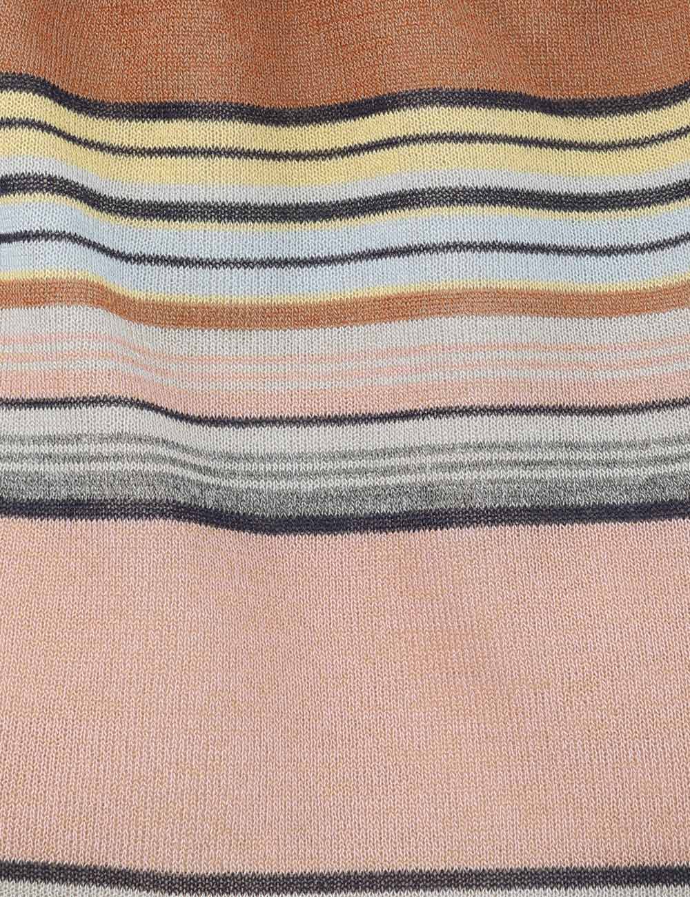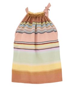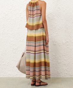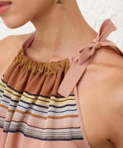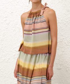 The Coco Stripe Halter Top in Stripe from our Summer Swim 2025 Collection. A knit top featuring a halter silhouette, gathering at the neckline with a self-tie bow and contrasting stripes.knit halter top, elasticated neckline with bow tie, flared hem
