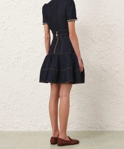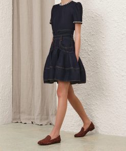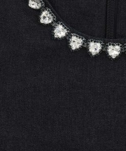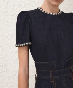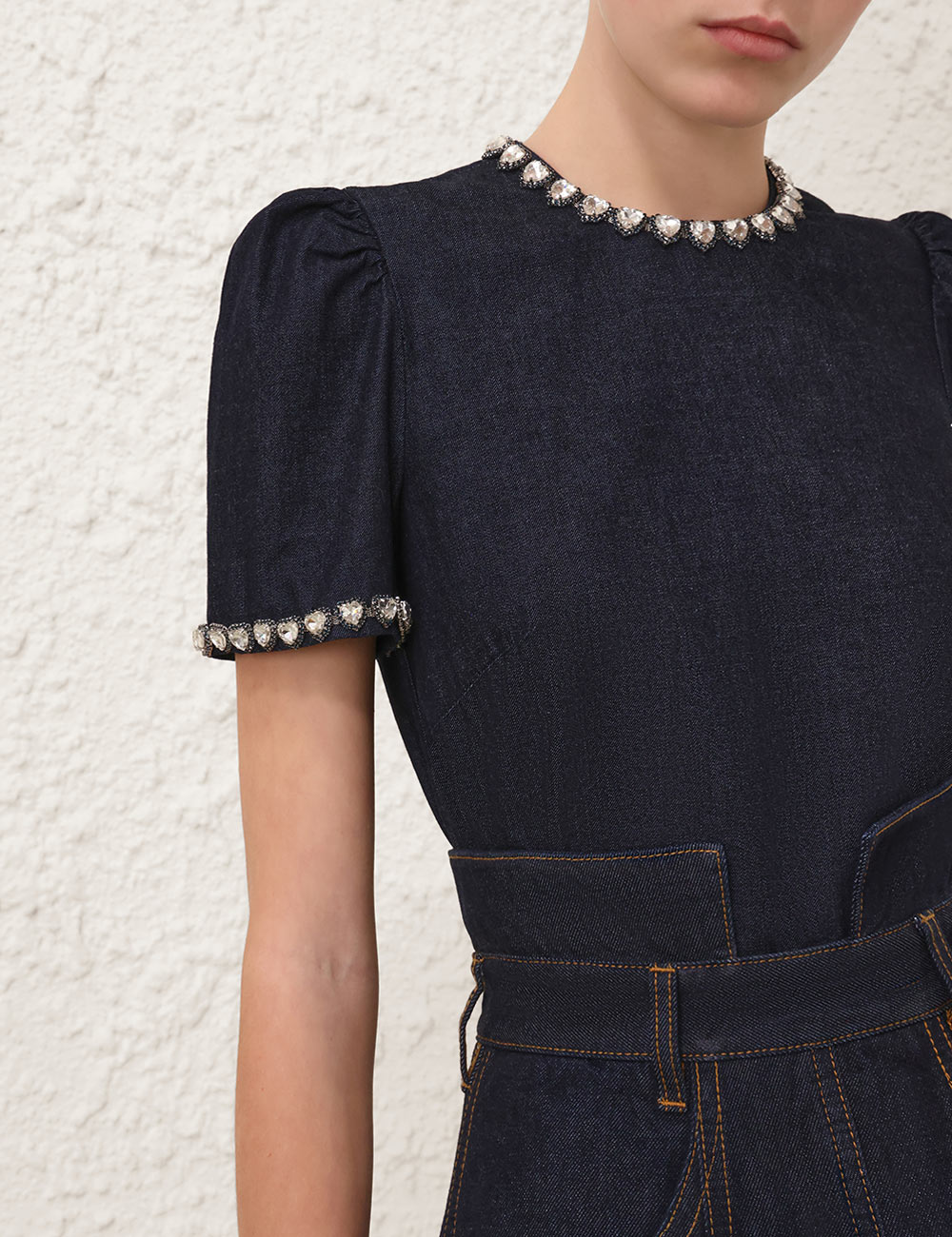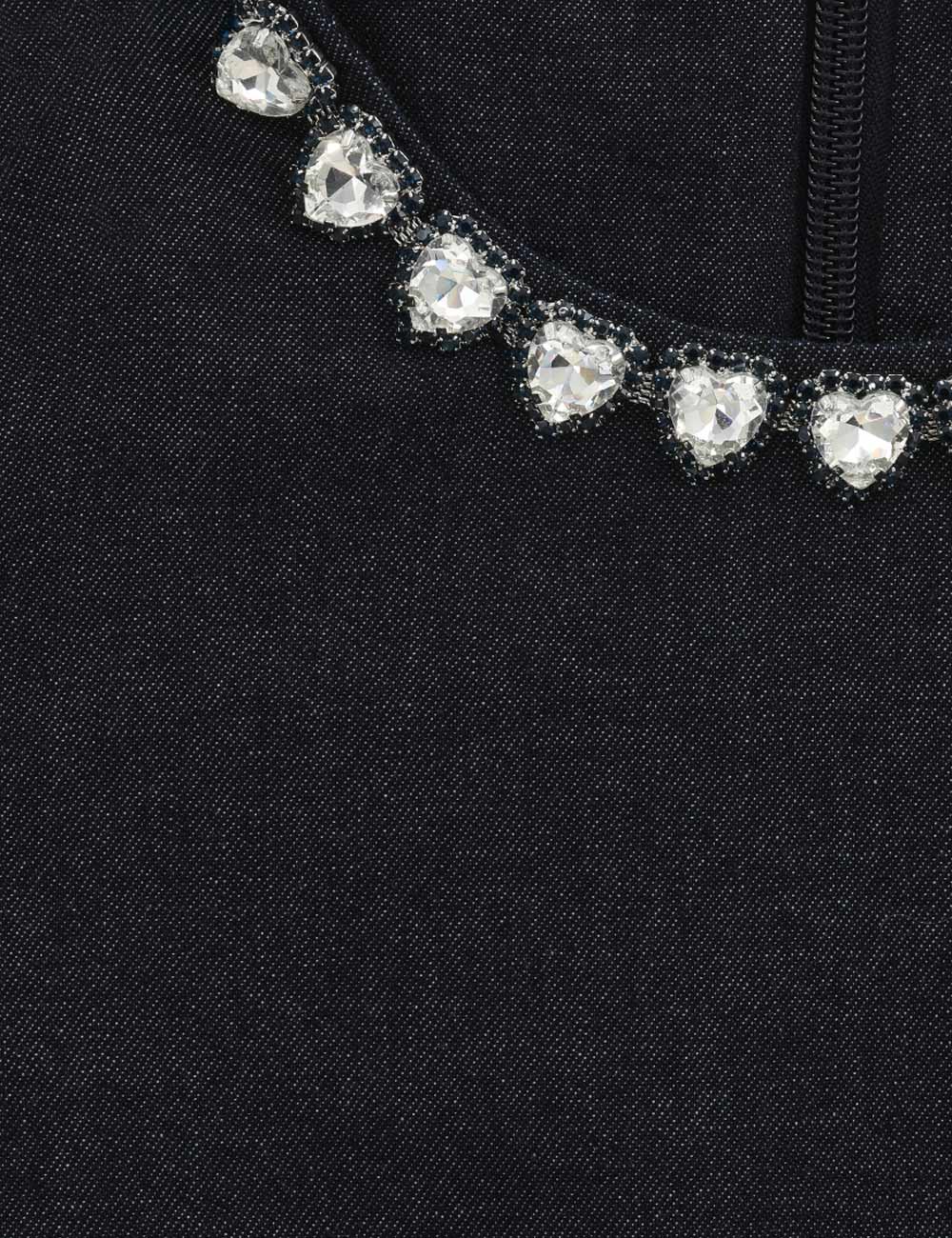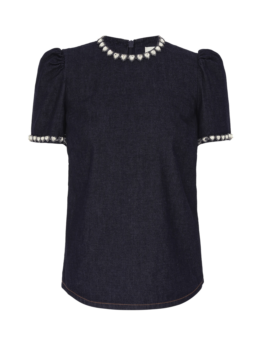 The Embellished Denim Top in Night Sky from our Fall 2025 Collection, Hypnotic. A short sleeve denim top featuring heart crystal trim on the neckline and cuffs, finished with a tulle-inserted sleeve head and invisible zipper at centre back.100% cotton denim, heart-shaped jewel crystal trim at sleeves and neckline, invisible zip closure at centre back, gathered shoulders creating a puffed silhouette