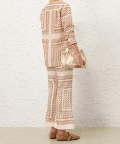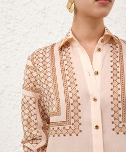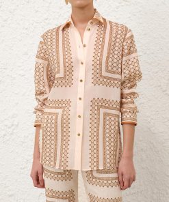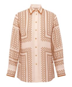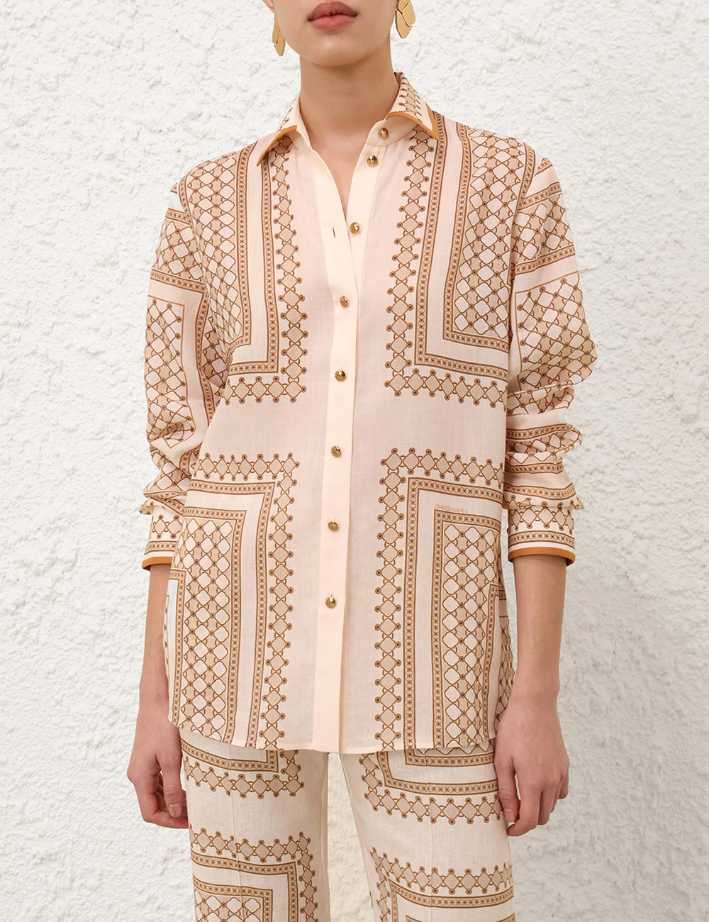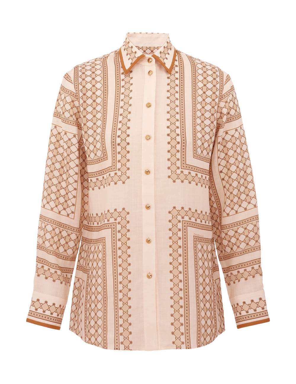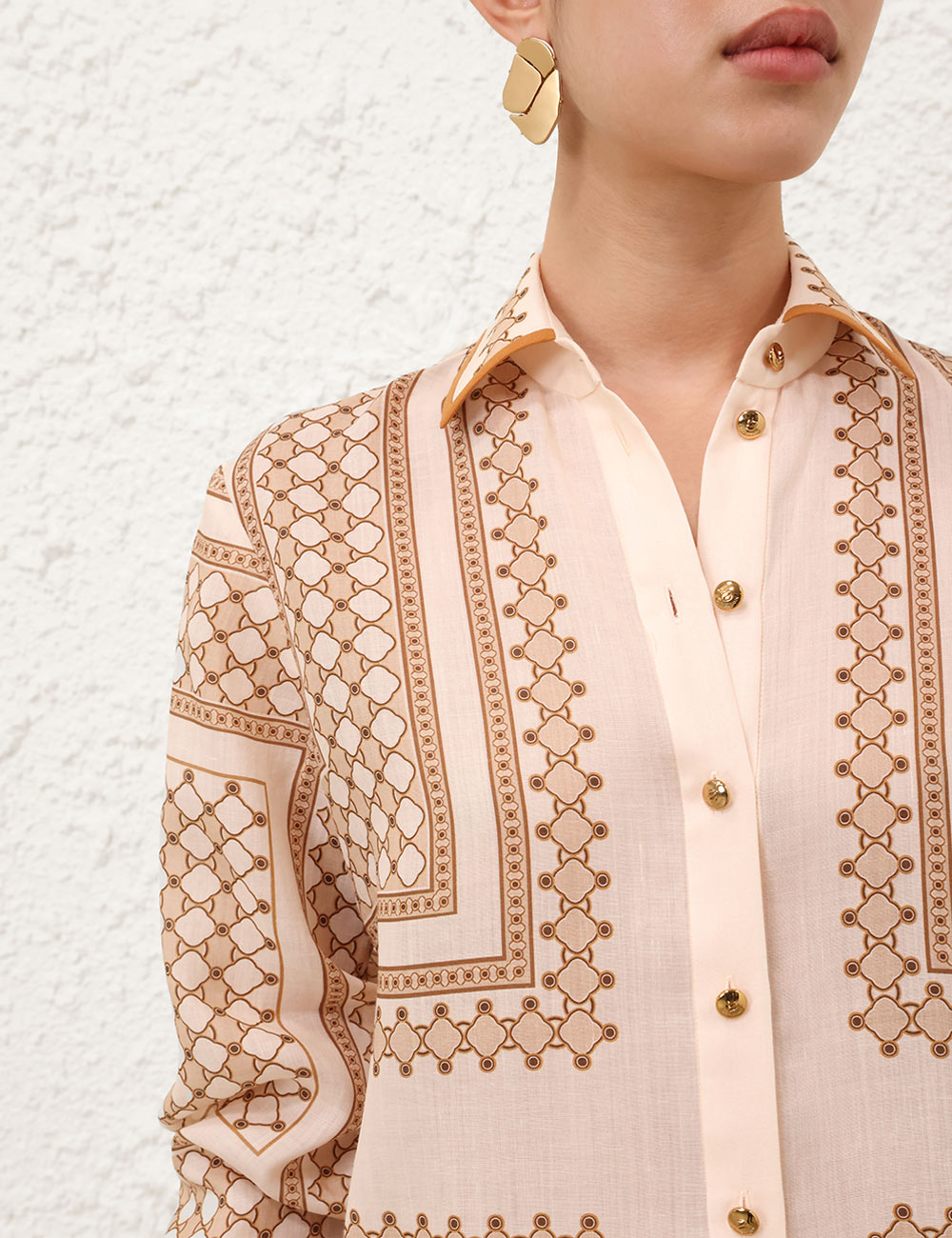 The Fitted Shirt in Cream Geo Print from our Fall 2025 Collection, Hypnotic. A long sleeve ramie shirt featuring a classic collar and buttons down the centre front.100% ramie fabric, long sleeve shirt with loose, buttoned cuffs, classic collar with contrasting trim, buttons down the centre front placket