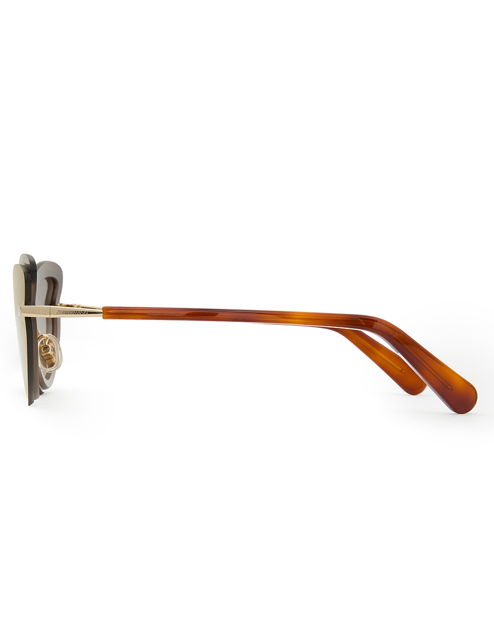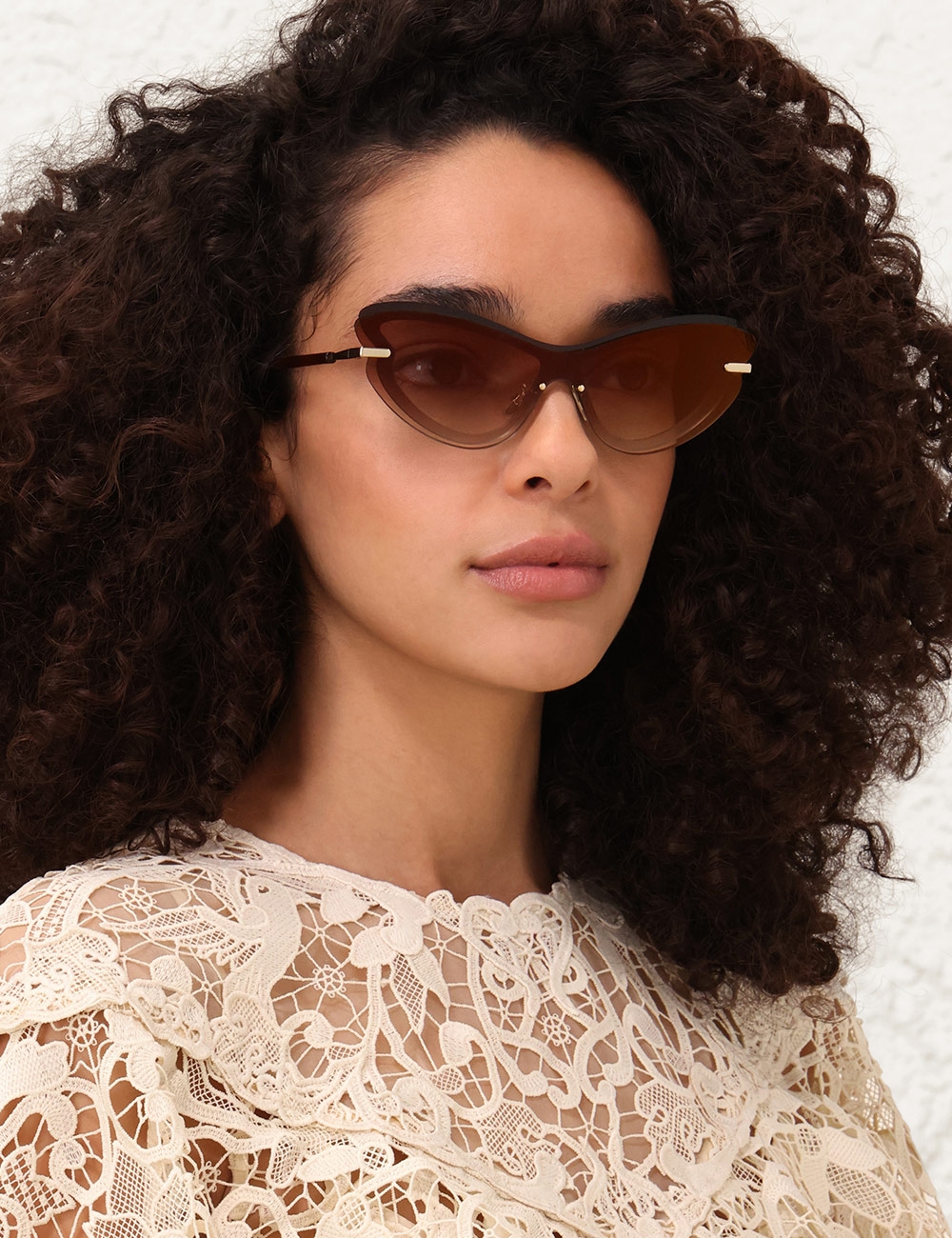 The Gleam Cateye in Havana from our Fall 2025 Collection, Hypnotic. A cateye style frame featuring butterfly detailing, finished with double lenses. partially exposed metal core, acetate temple tips, signature butterfly detail, double lenses, category 3 lenses, comes with zimmermann case, dust bag and storage box