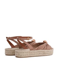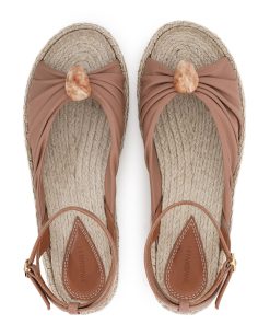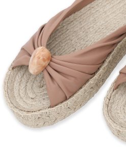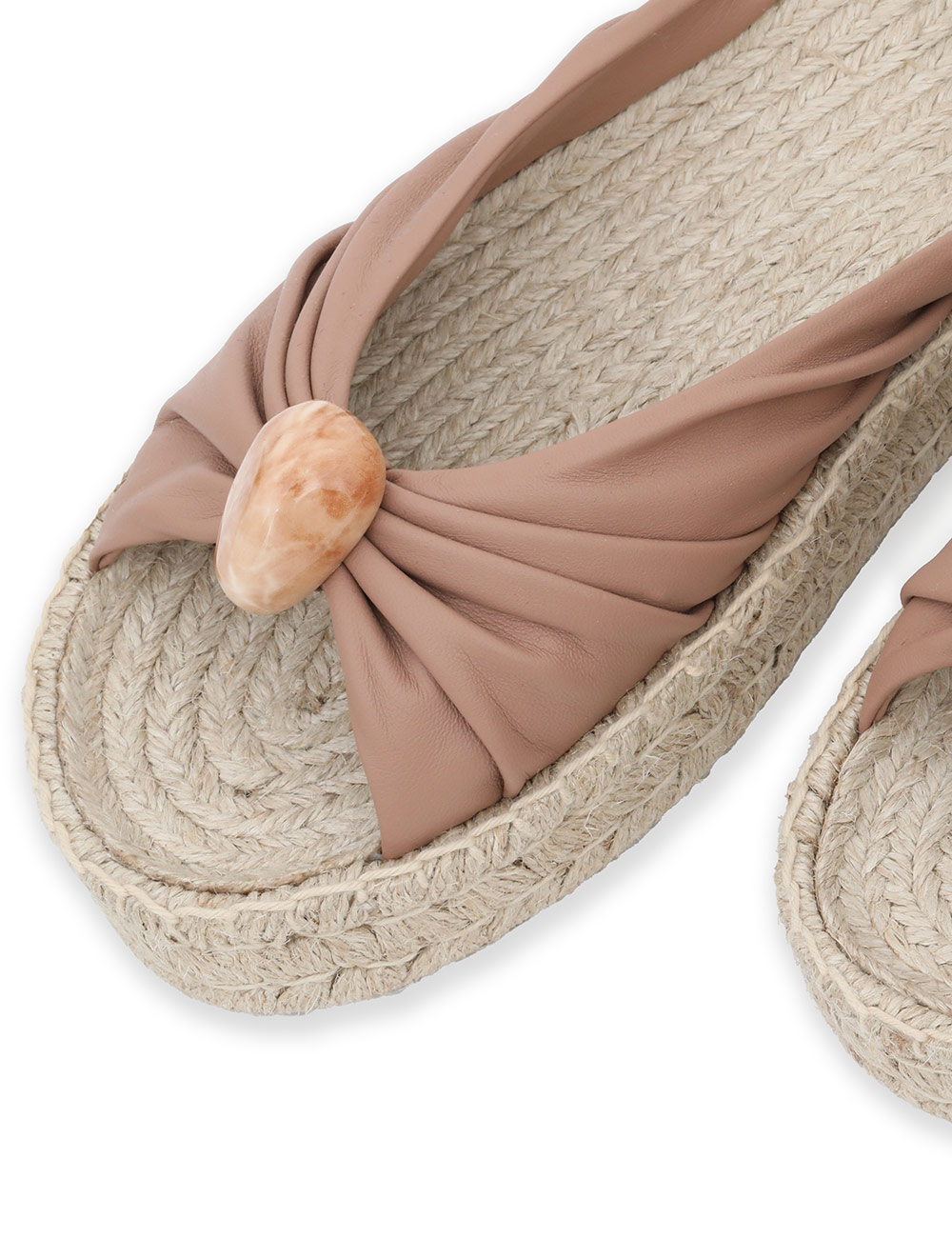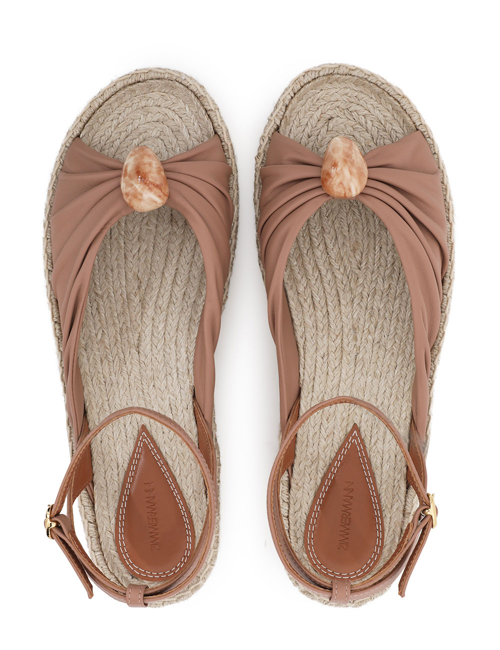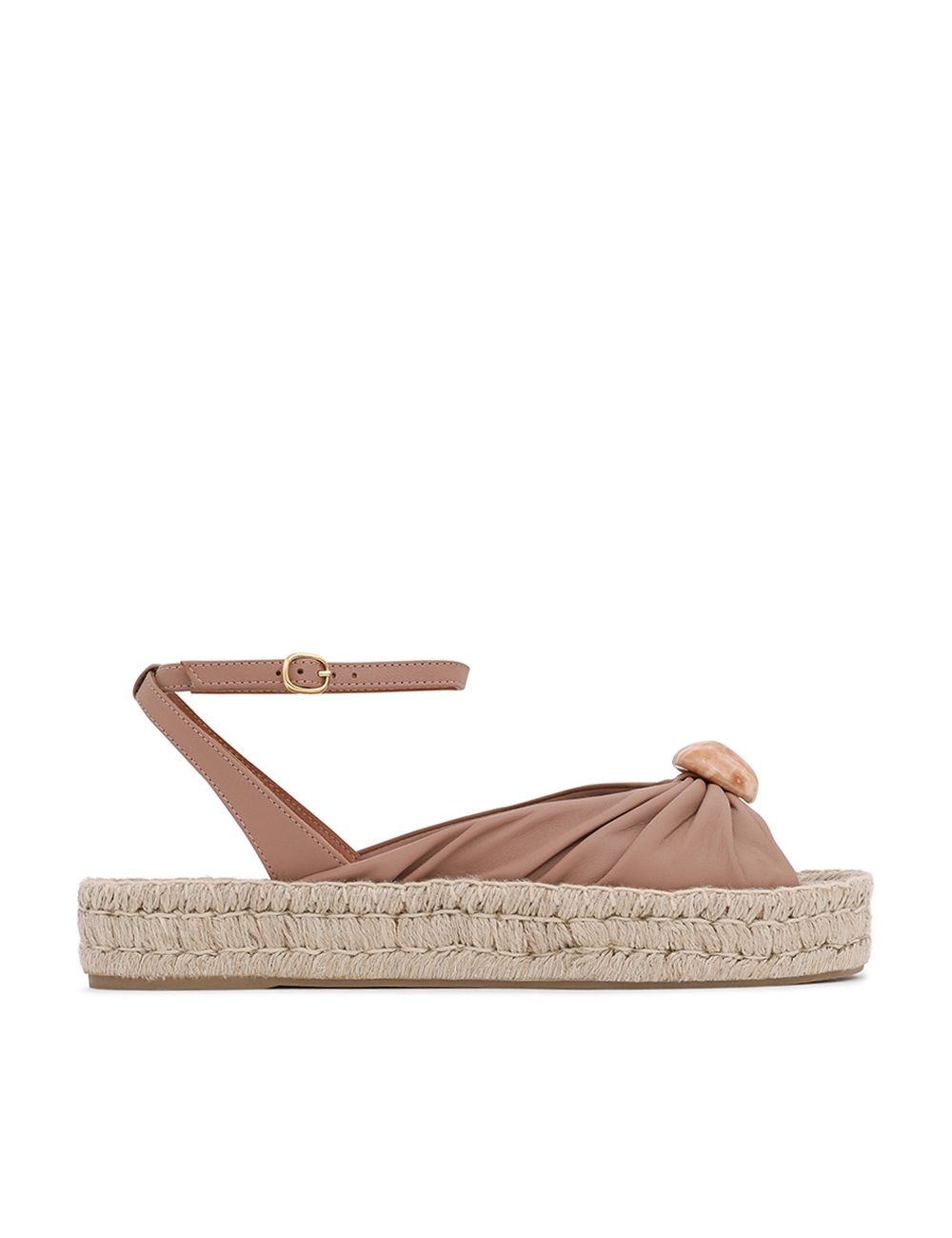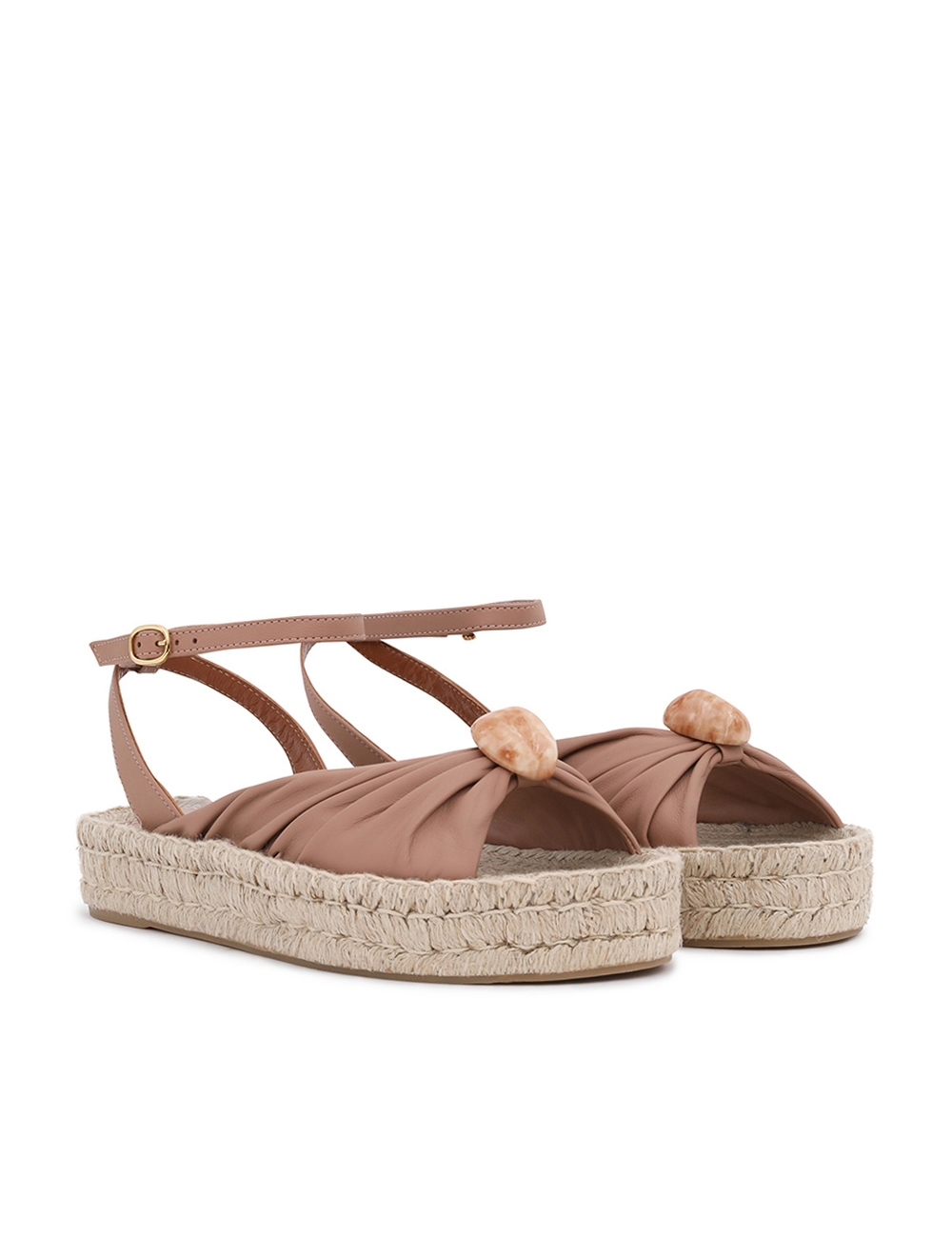 The Gleam Espadrille in Biscuit from our Summer Swim 2025 Collection. A leather espadrille sandal featuring heavy gathering at the front shoe with a statement pebble hardware design. leather espadrille, soft round toe, ankle strap with buckle fastening, 3cm heel, made in spain