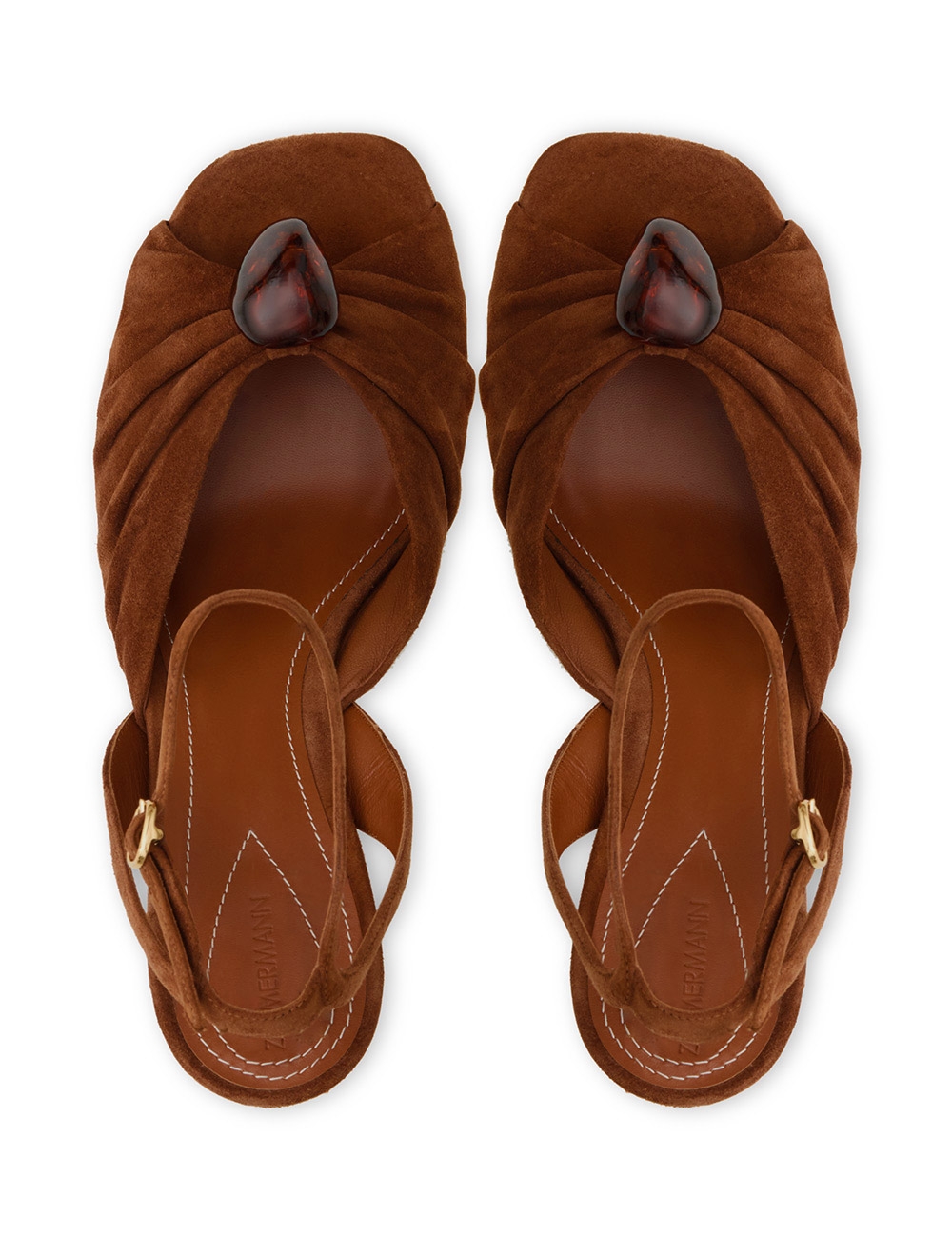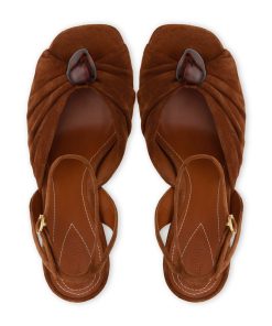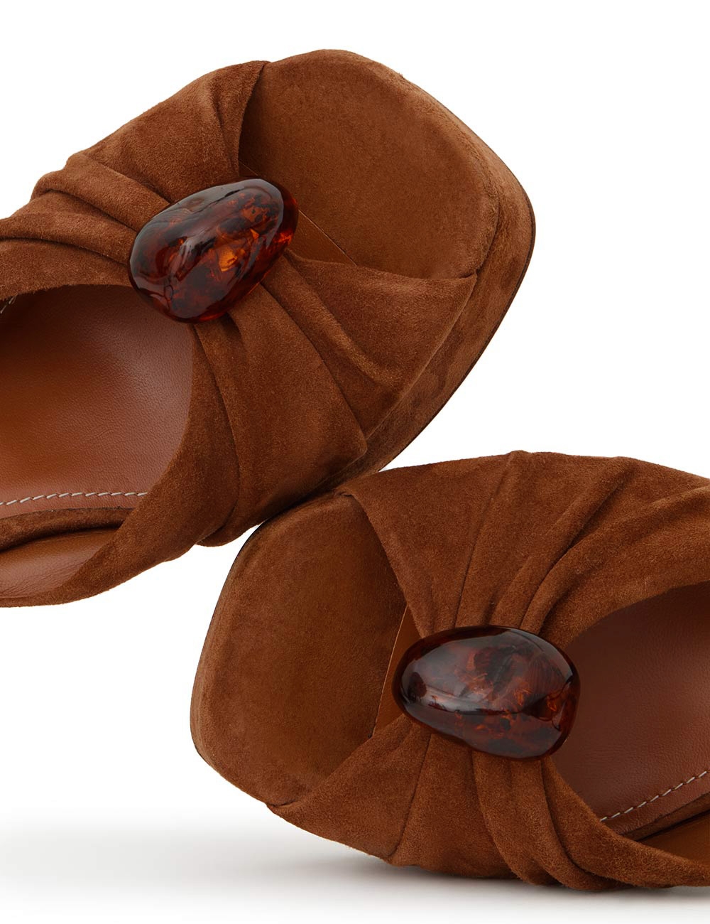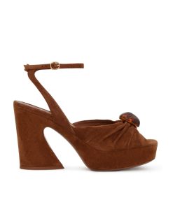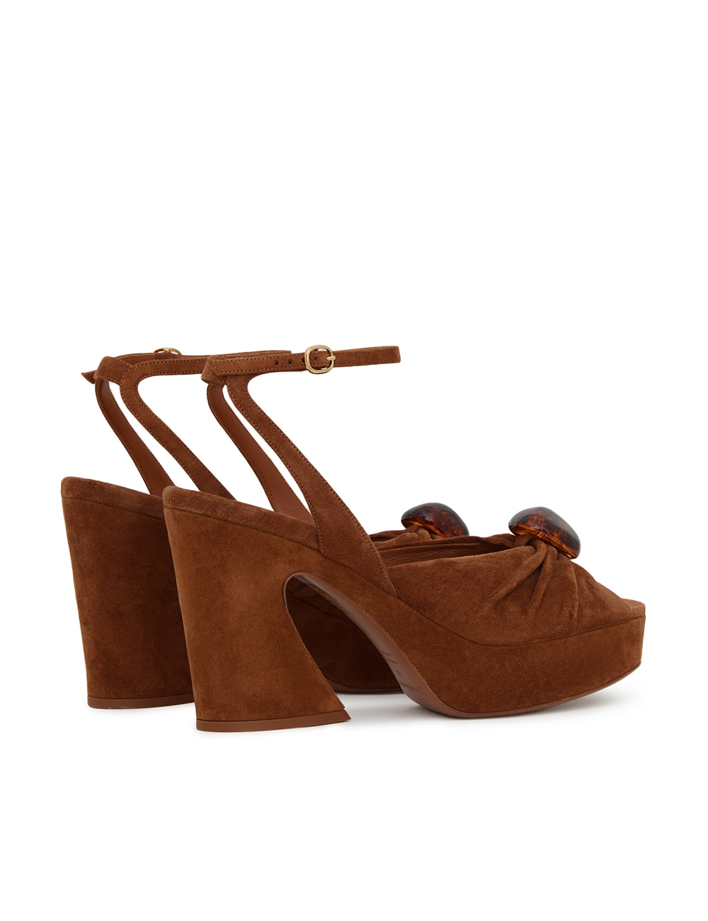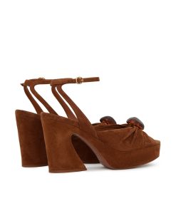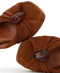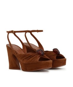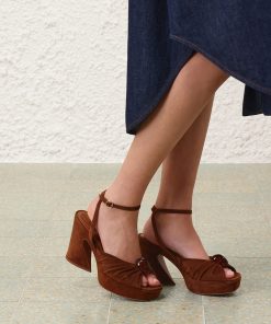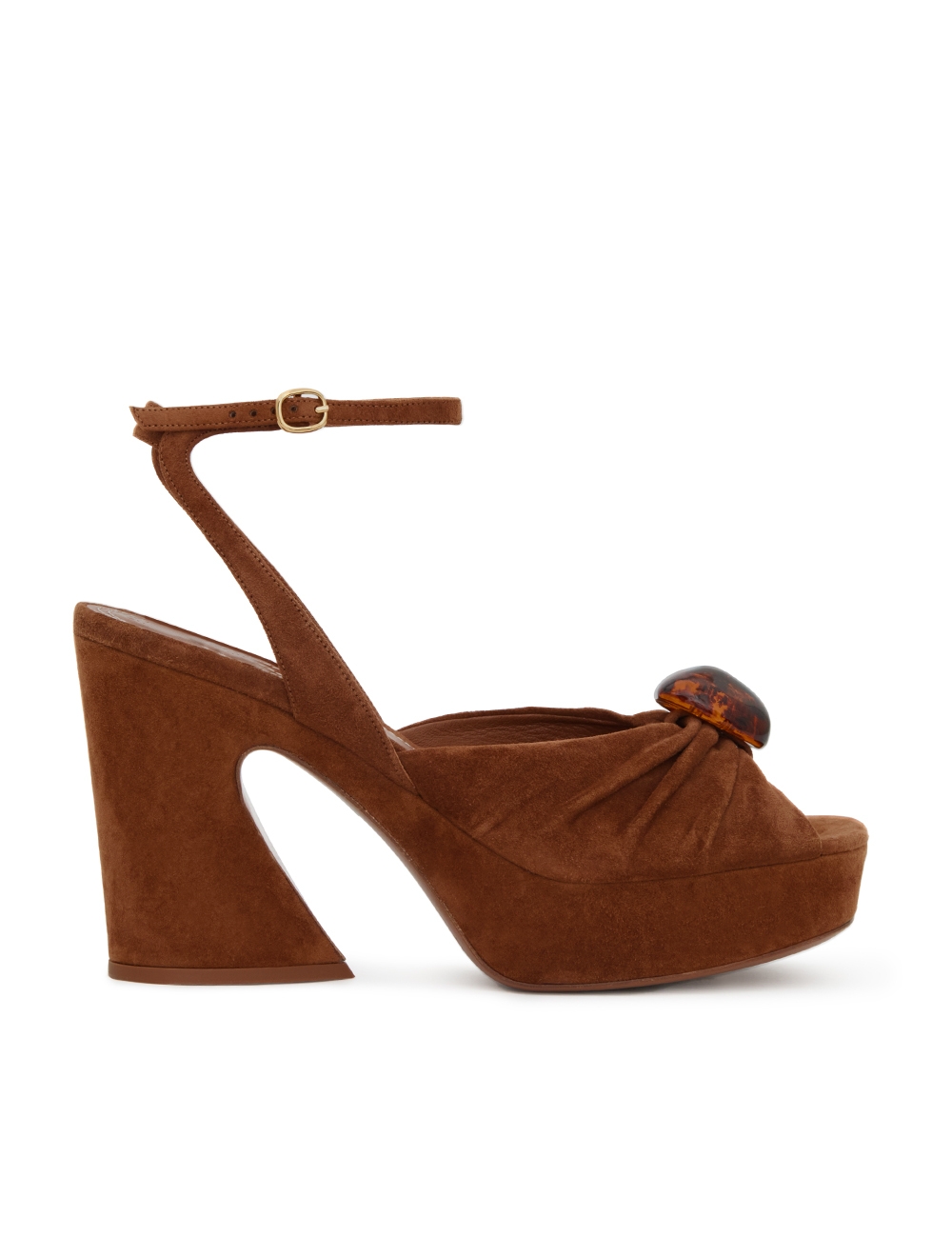 The Gleam Sandal 120 in Hazelnut from our Fall 2025 Collection, Hypnotic. A casually refined take on everyday styling, featuring Gleam’s signature gathering for added depth and texture, and finished with pebble hardware for a refined detail. suede platform sandal, made in italy, gathered detail on upper with adjustable ankle strap, square toe, 120mm block crescent heel