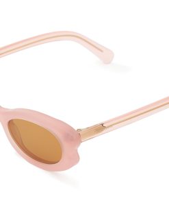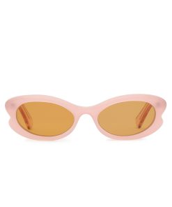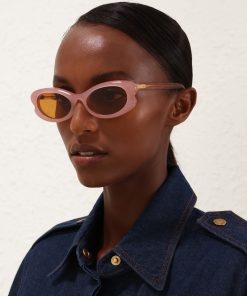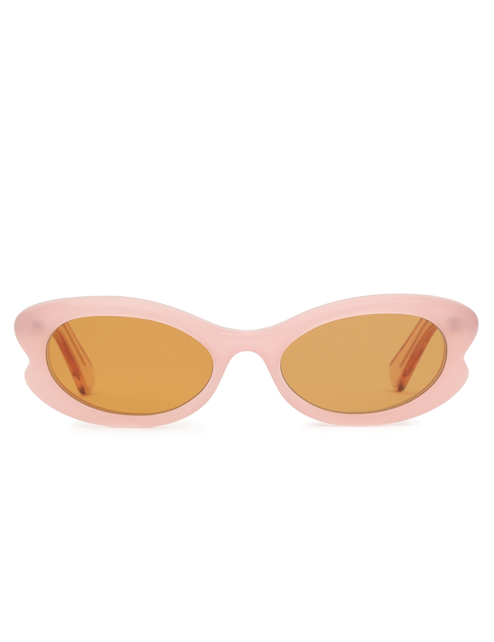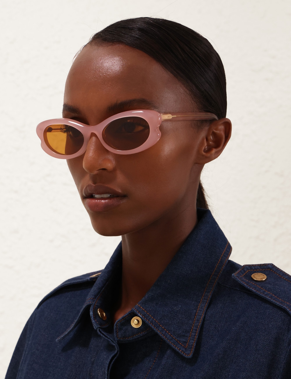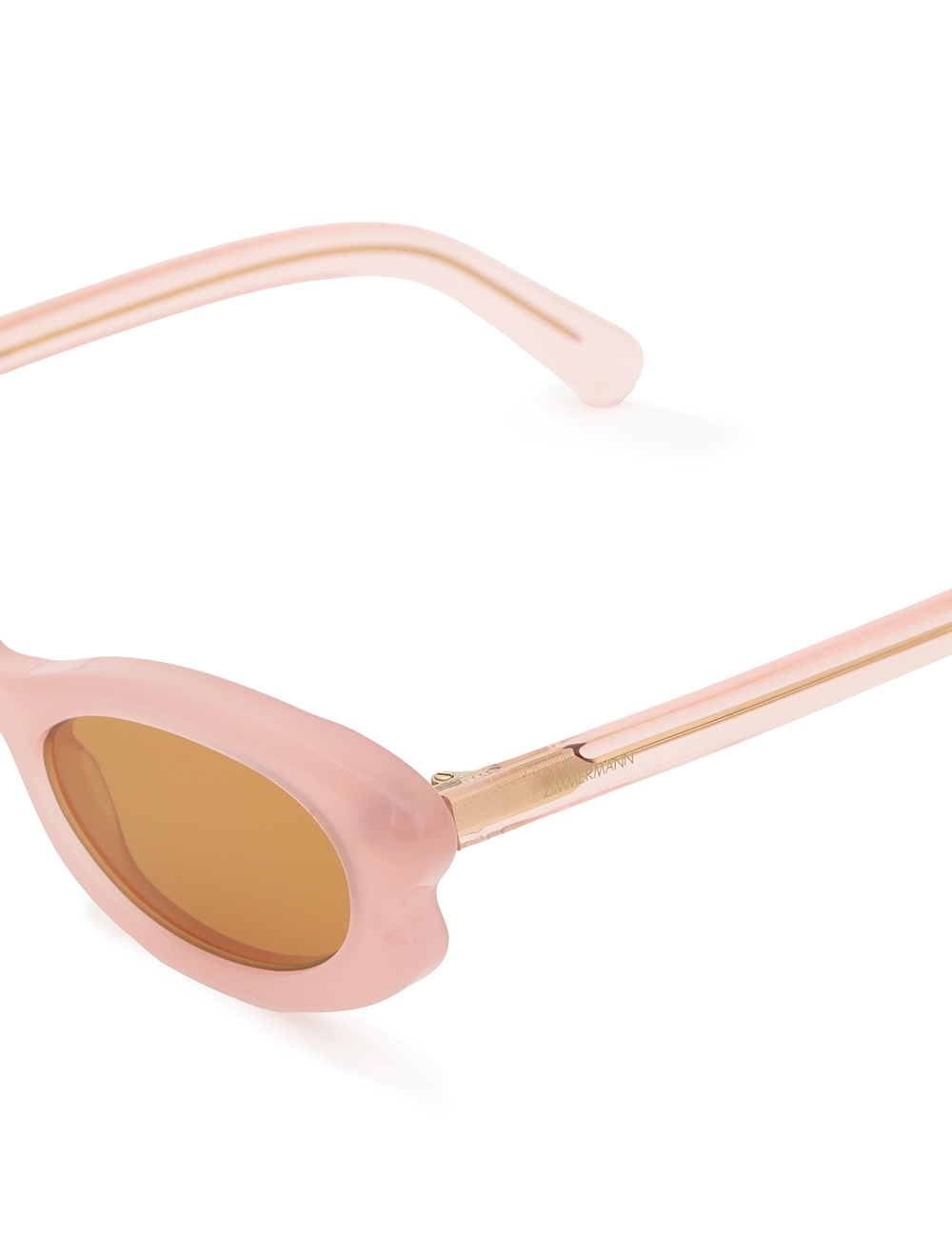 The Goldie Oval in Rose from our Fall 2025 Collection, Hypnotic. An acetate oval frame featuring scalloped detailing, finished with solid lenses. acetate frame, signature scalloped detail, solid coloured lenses, category 2 lenses, comes with zimmermann case, dust bag and storage box