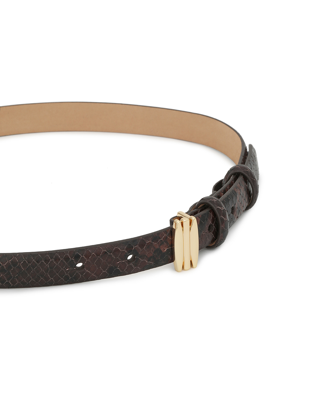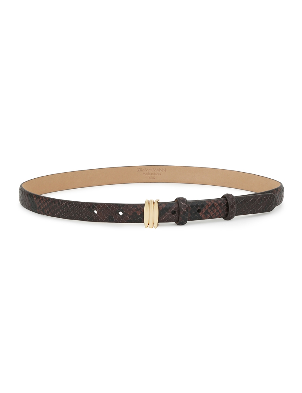 The Halcyon Belt 20 in Dark Brown from our Fall 2025 Collection, Hypnotic. A leather belt featuring a statement gold hardware at the centre front. waist belt, full-grain leather, gold metal detailing, 20mm wide