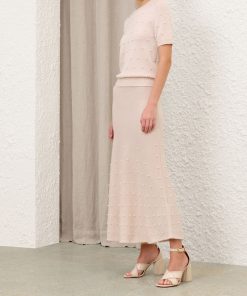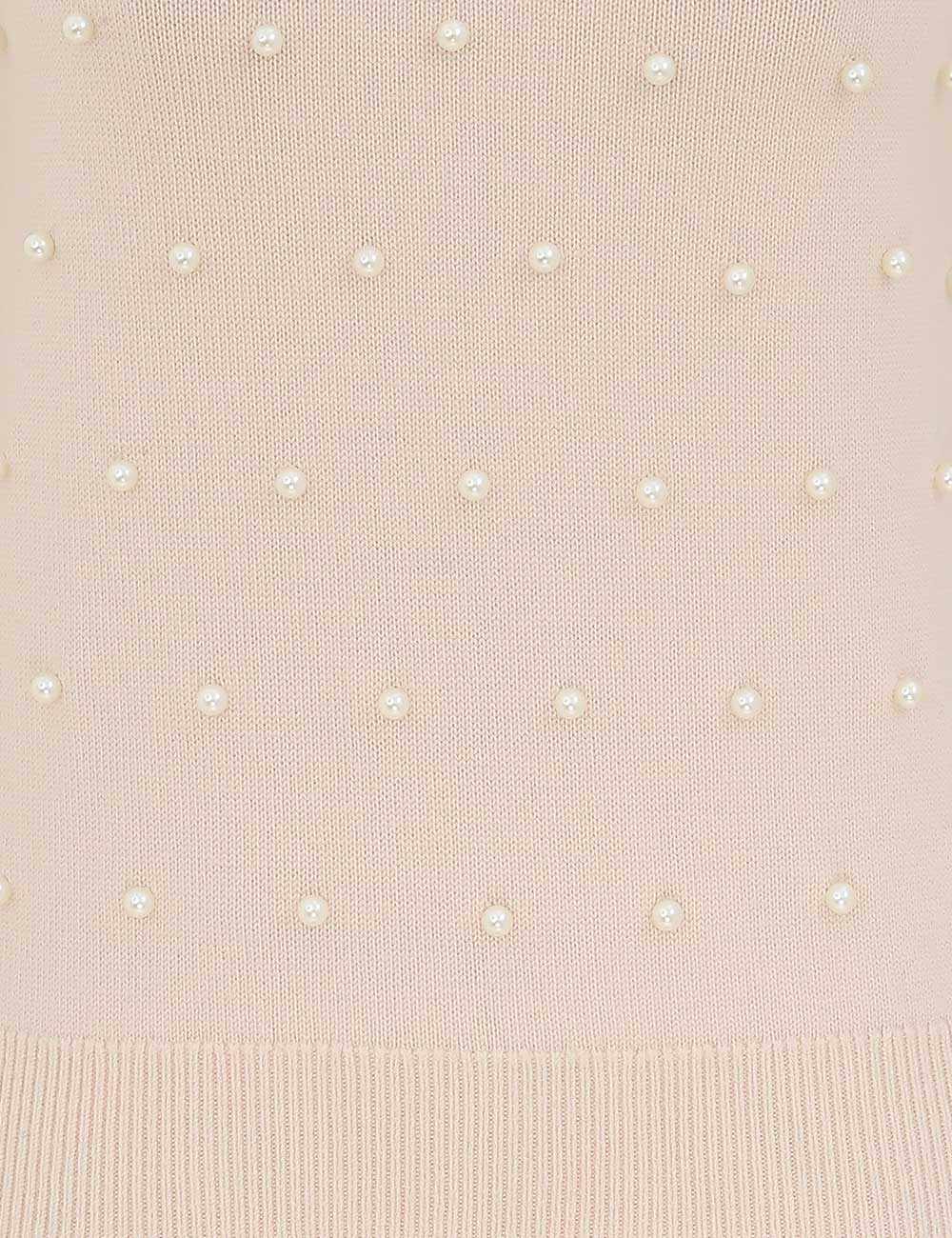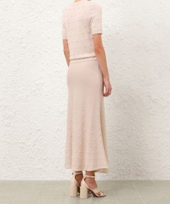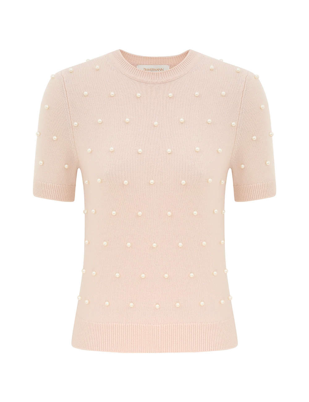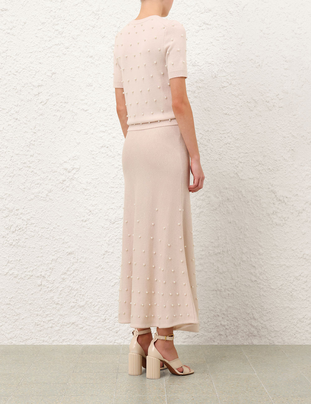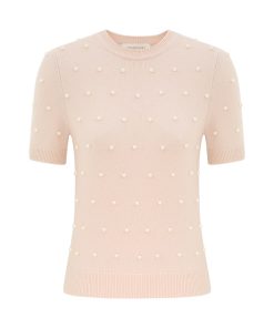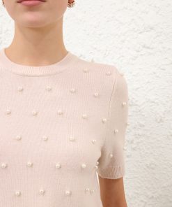 The Hypnotic Beaded Knit Tee in Chalk from our Fall 2025 Collection, Hypnotic. A short sleeve wool t-shirt featuring a round neckline, ribbed trim and bead detailing throughout.100% merino wool, slim fit tee, ribbed neckline, cuffs and hem, beaded detailing across the front and back