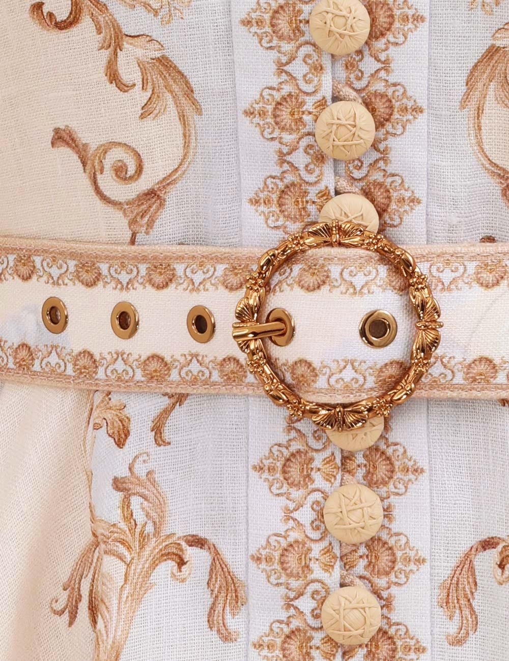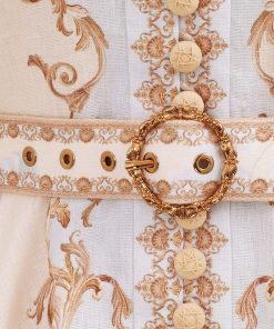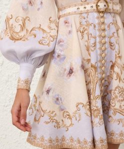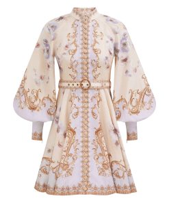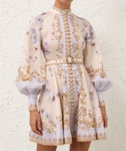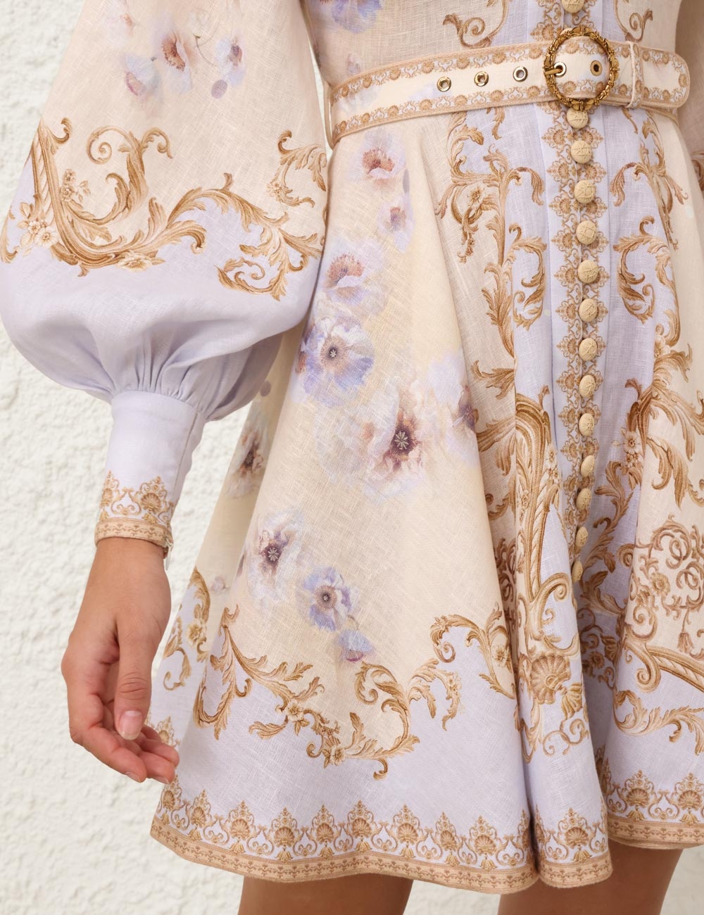 The Hypnotic Buttoned Mini Dress in Blue Floral from our Fall 2025 Collection, Hypnotic. A linen mini dress featuring a placement print, long blouson sleeves with zippers at the cuffs and raffia buttons down the centre front.100% linen fabric, self covered removable belt with buckle, rouleau loops with raffia buttons down the front, centre back zip closure, exaggerated sleeves, stand collar