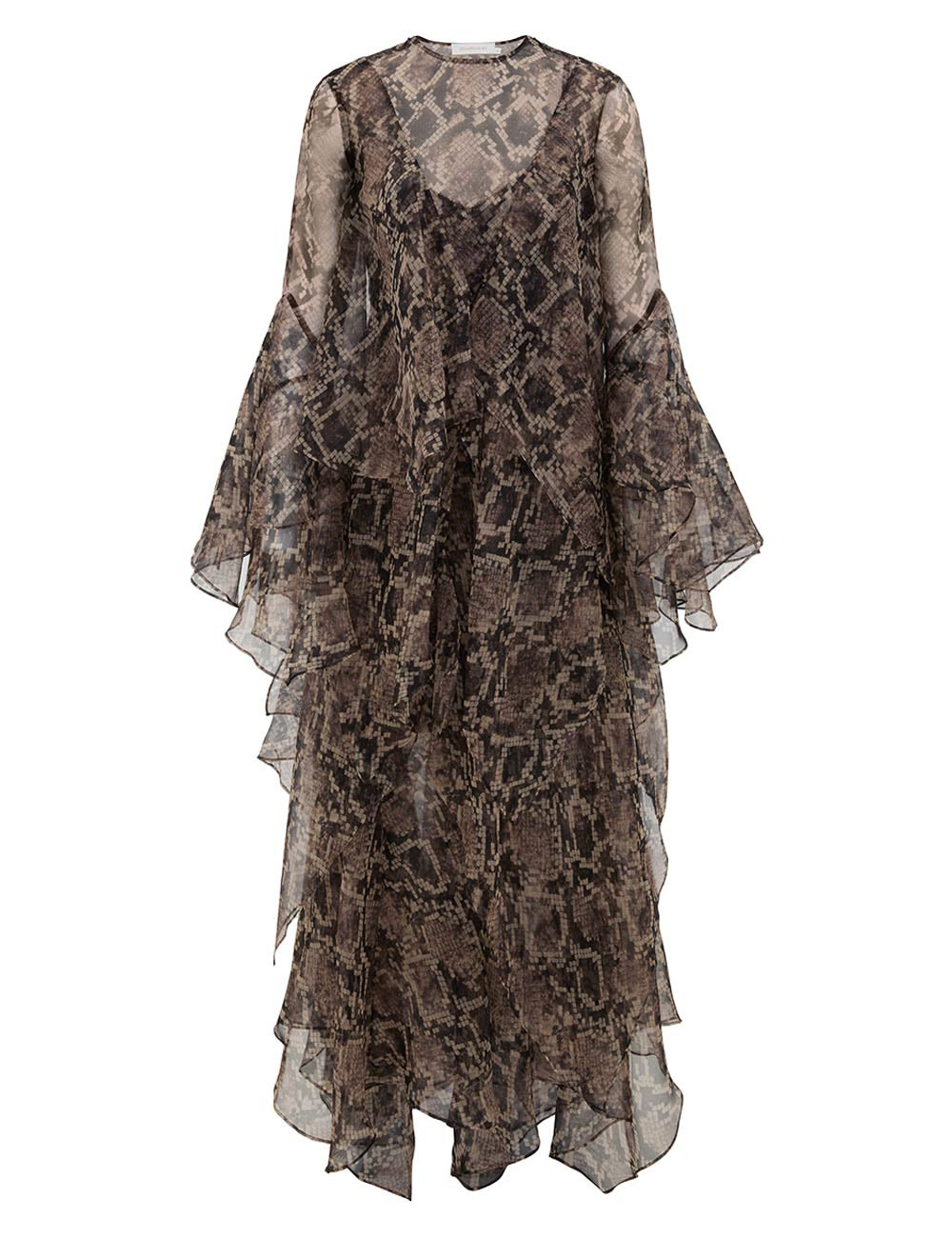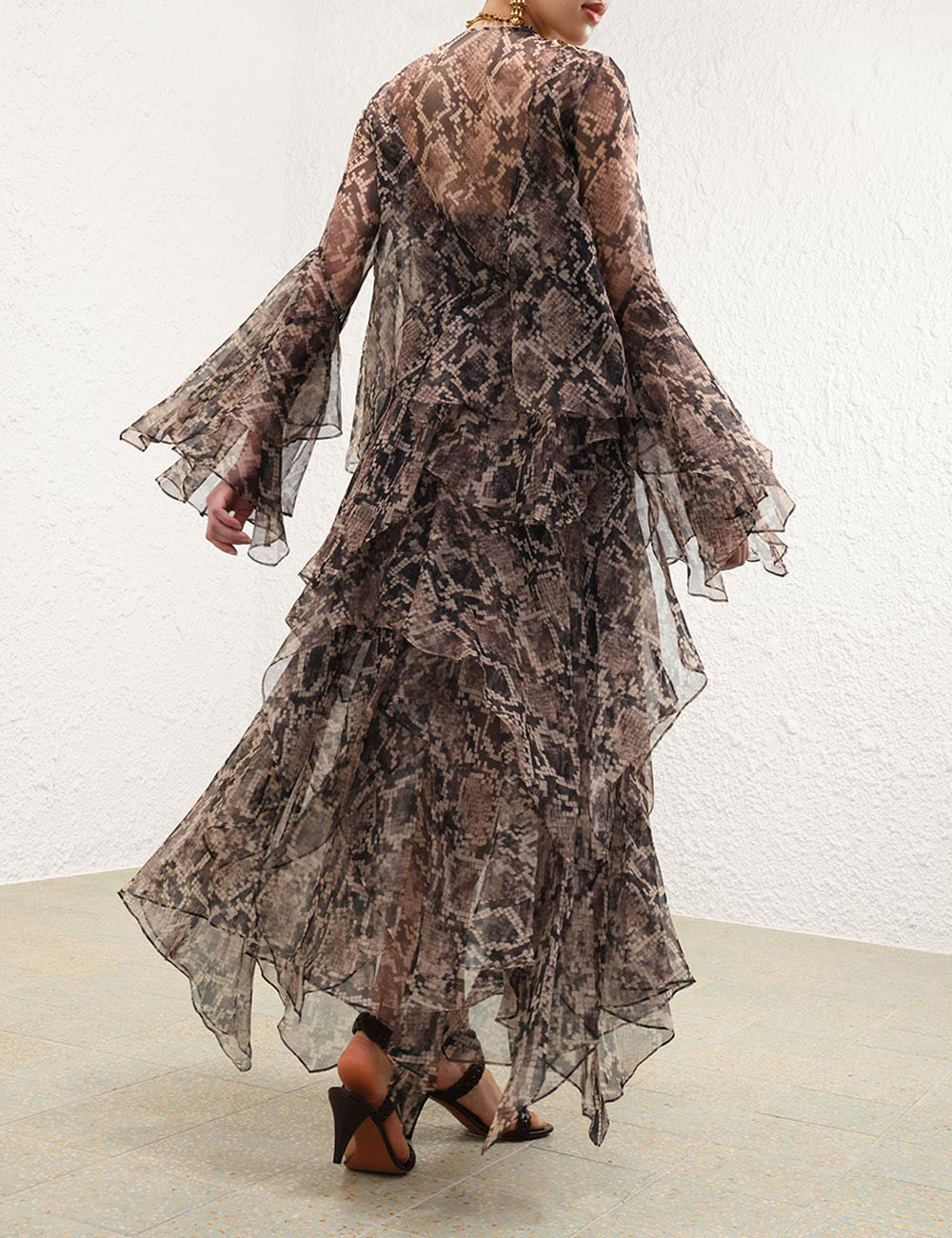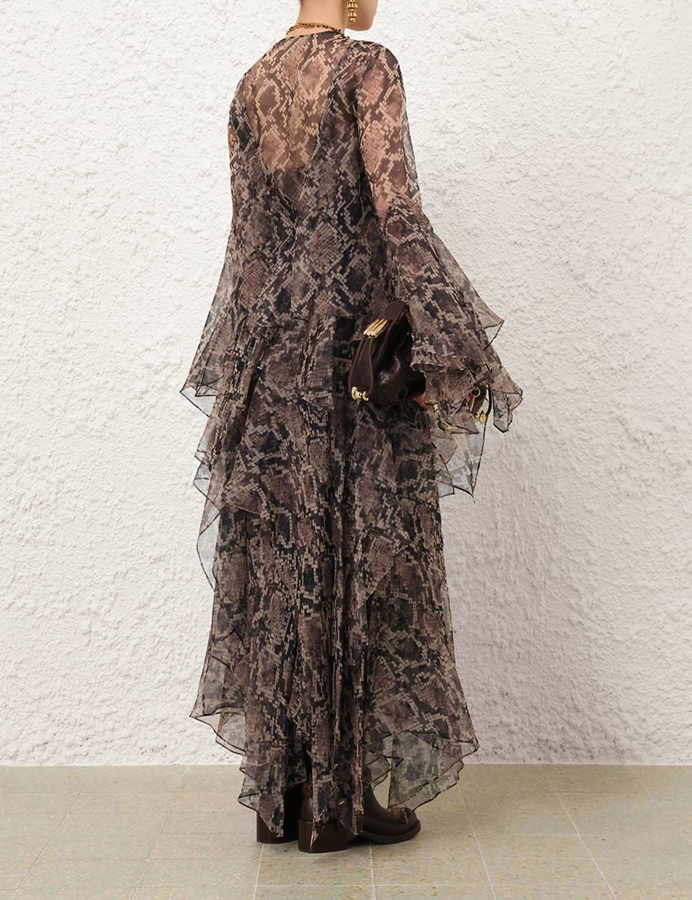The Hypnotic Cascading Maxi Dress in Dark Snake from our Fall 2025 Collection, Hypnotic. A full-length silk organza dress featuring cascading ruffle layers and exaggerated sleeves. 100% silk fabric, cascading ruffles throughout, invisible zip closure at shoulders and left side seam, round neckline, sheer bodice, comes with separate slip