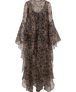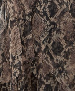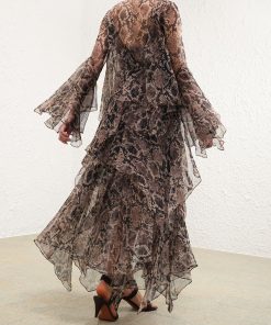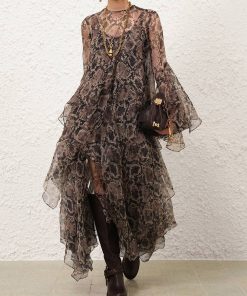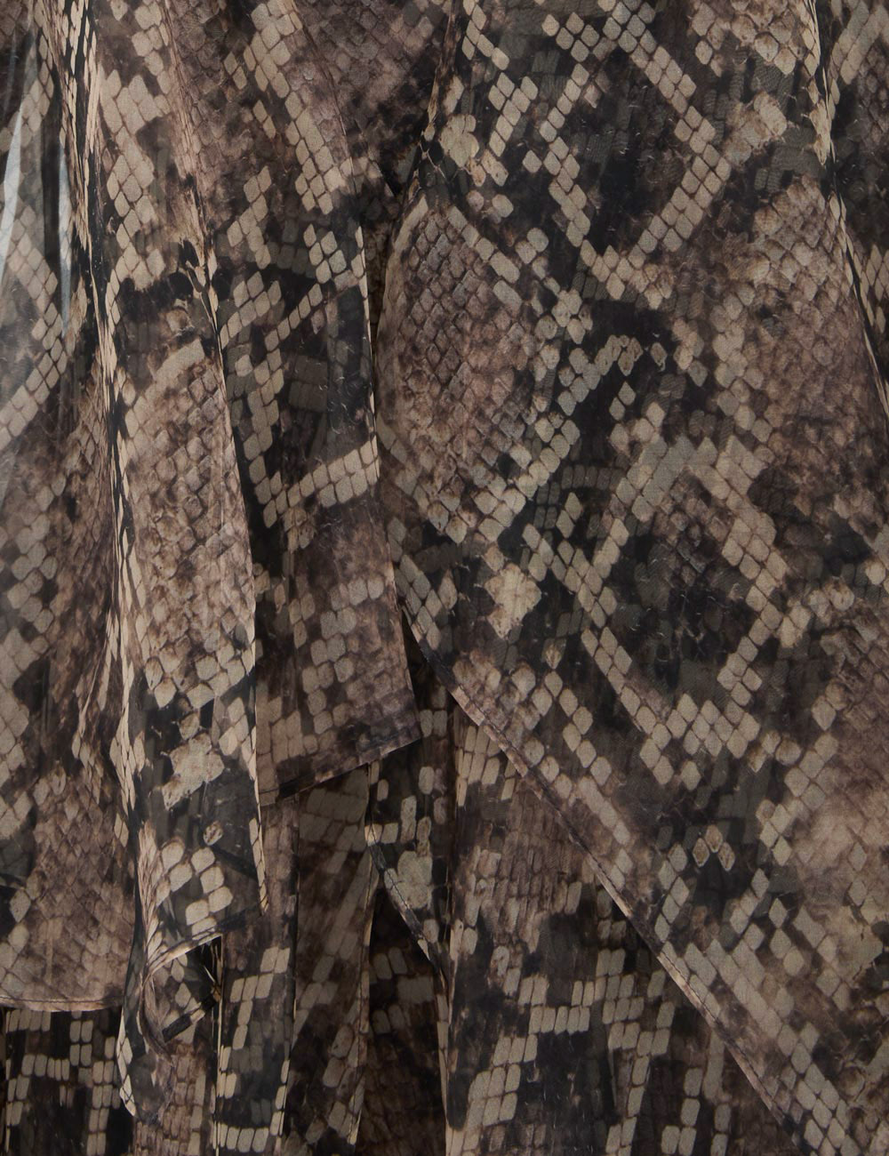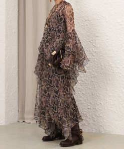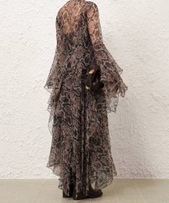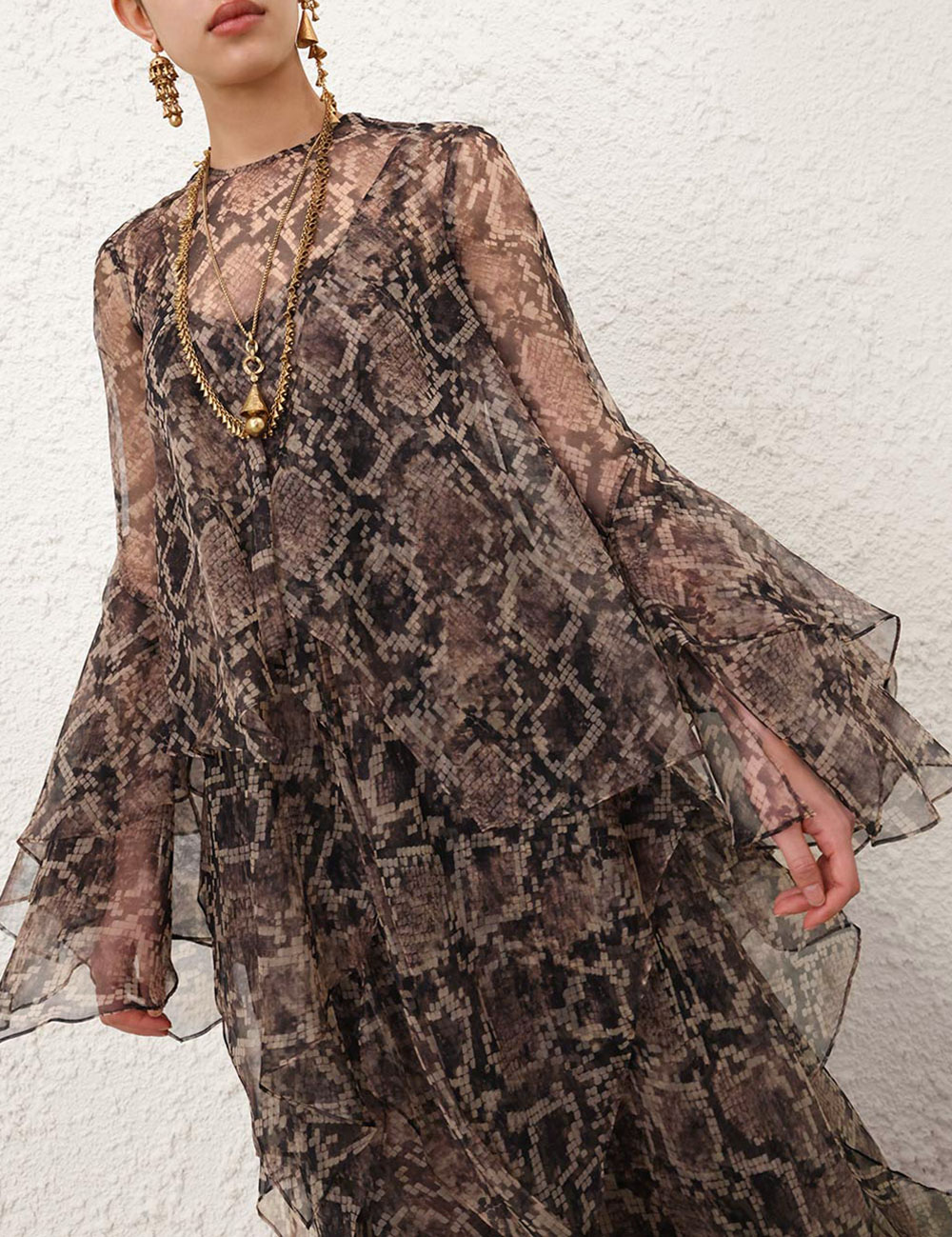 The Hypnotic Cascading Maxi Dress in Dark Snake from our Fall 2025 Collection, Hypnotic. A full-length silk organza dress featuring cascading ruffle layers and exaggerated sleeves. 100% silk fabric, cascading ruffles throughout, invisible zip closure at shoulders and left side seam, round neckline, sheer bodice, comes with separate slip