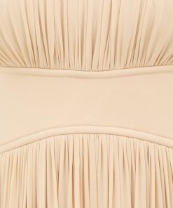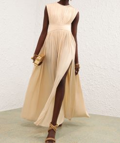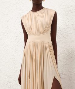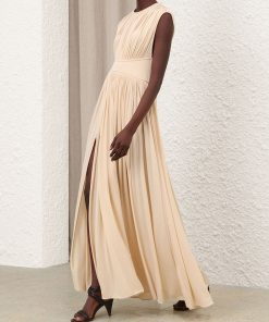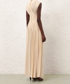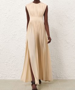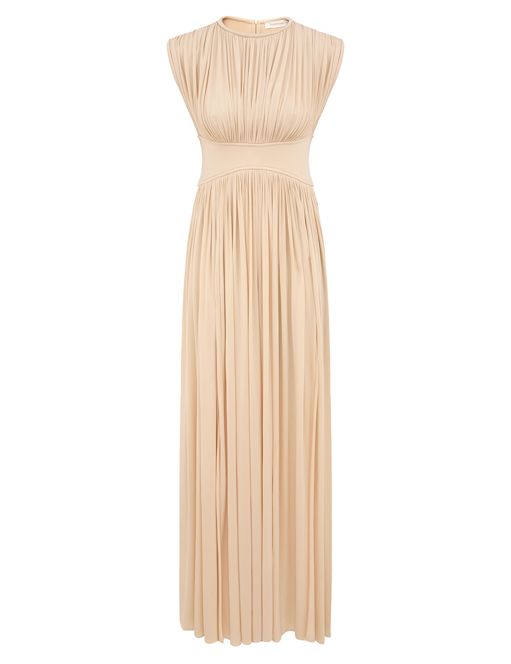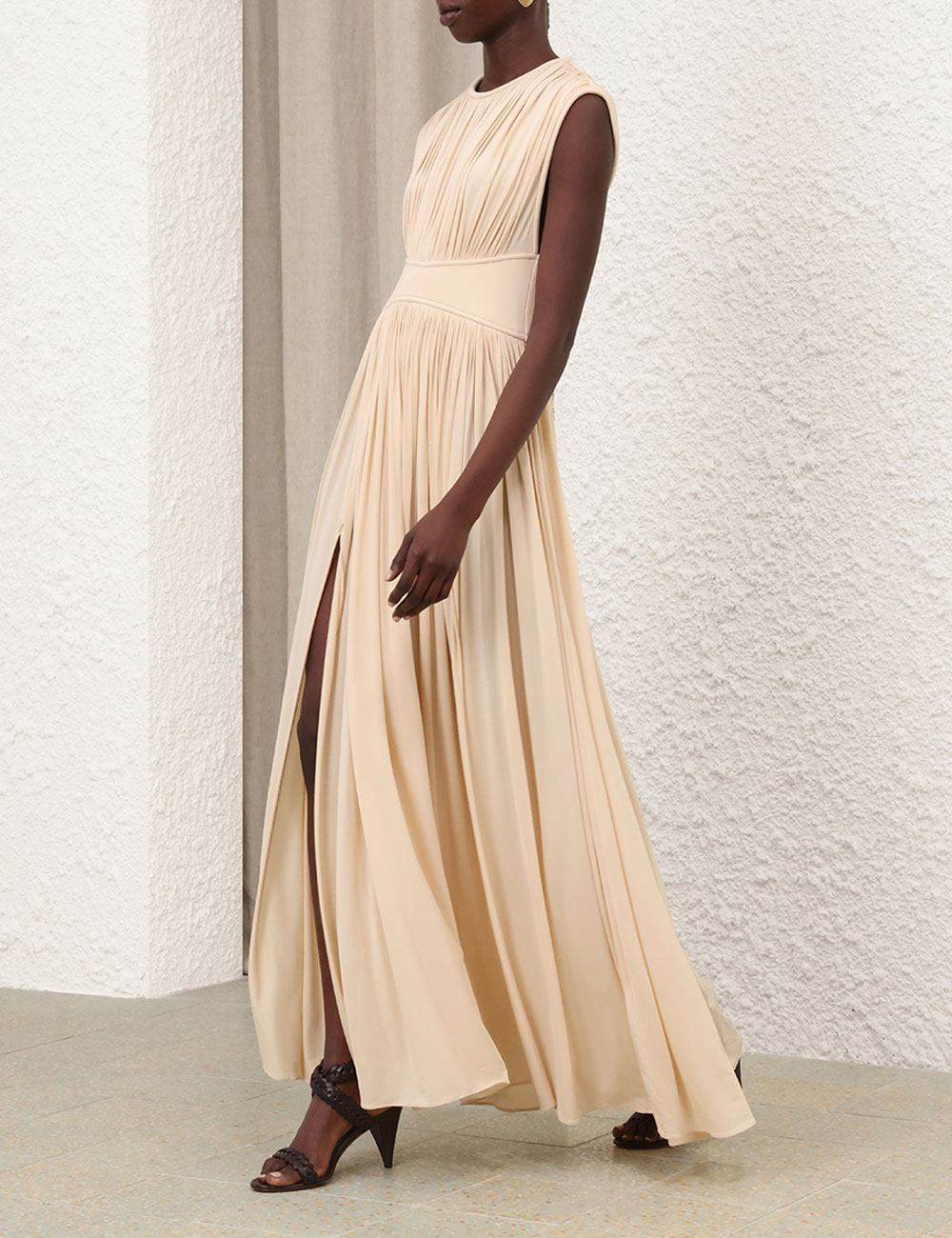 The Hypnotic Column Dress in Cream from our Fall 2025 Collection, Hypnotic. A maxi dress featuring a fixed waistband, heavy gathering at the neckline and waist, and front skirt splits, finished with a centre back zip.rounded neckline, front skirt splits, fixed waistband, gold metal zip at centre back, heavily pleated skirt with front splits
