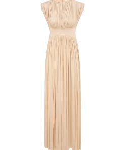 The Hypnotic Column Dress in Cream from our Fall 2025 Collection, Hypnotic. A maxi dress featuring a fixed waistband, heavy gathering at the neckline and waist, and front skirt splits, finished with a centre back zip.rounded neckline, front skirt splits, fixed waistband, gold metal zip at centre back, heavily pleated skirt with front splits