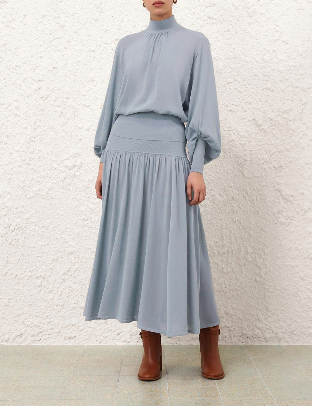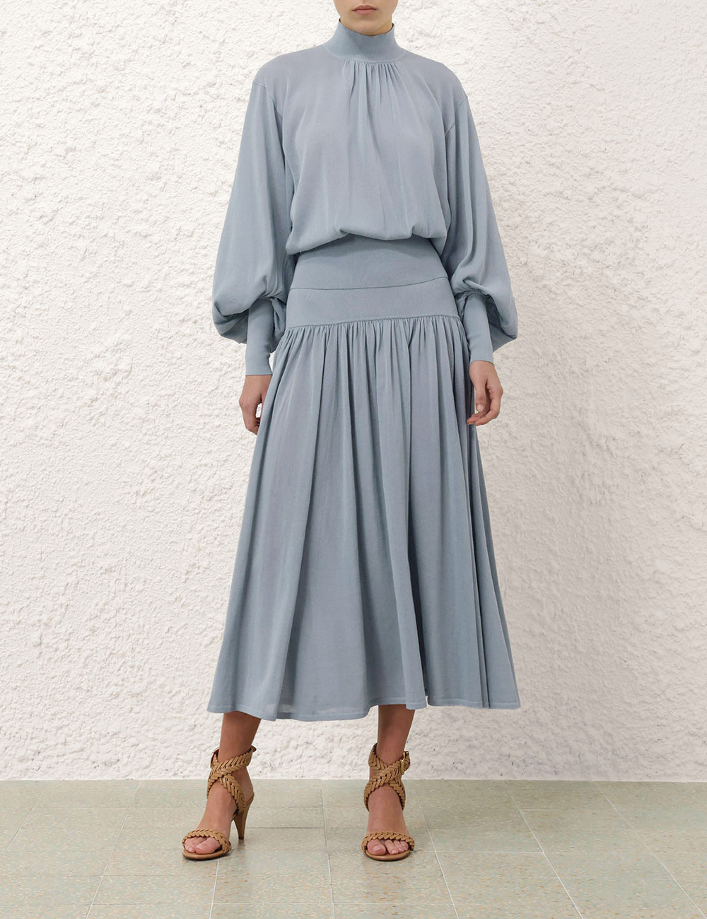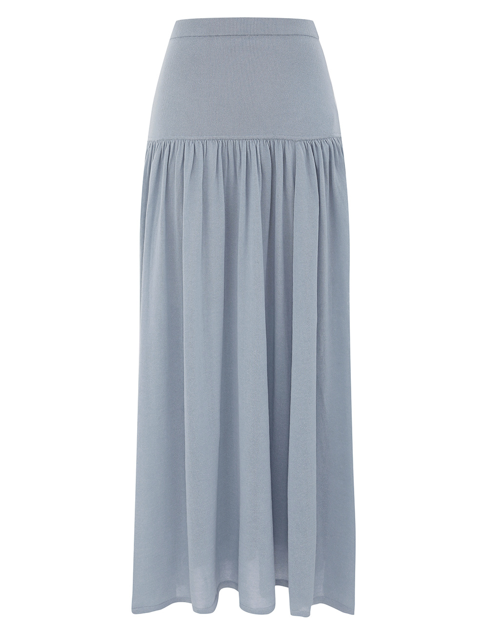The Hypnotic Gathered Midi Skirt in Dusty Blue from our Fall 2025 Collection, Hypnotic. A knit midi skirt featuring a wide elasticated waistband, heavy gathering at the hips and a soft A-line silhouette. knit midi skirt with elongated waistband, soft a-line silhouette, gathered detailing at the hips, high-rise fit, slip on style
