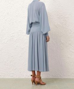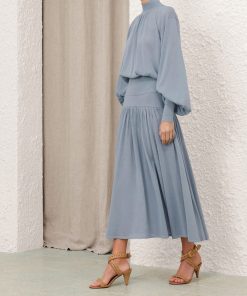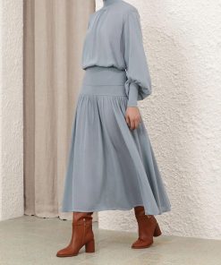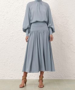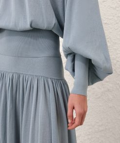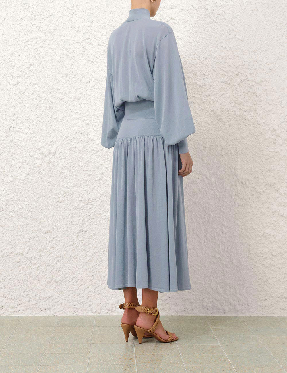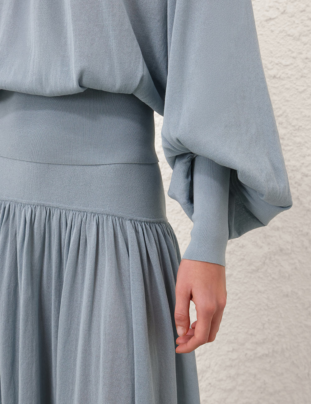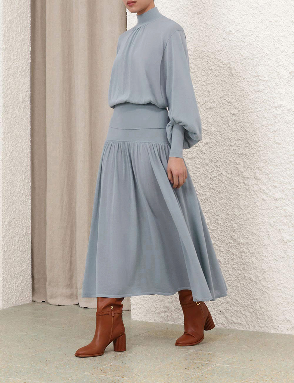 The Hypnotic Gathered Midi Skirt in Dusty Blue from our Fall 2025 Collection, Hypnotic. A knit midi skirt featuring a wide elasticated waistband, heavy gathering at the hips and a soft A-line silhouette. knit midi skirt with elongated waistband, soft a-line silhouette, gathered detailing at the hips, high-rise fit, slip on style