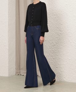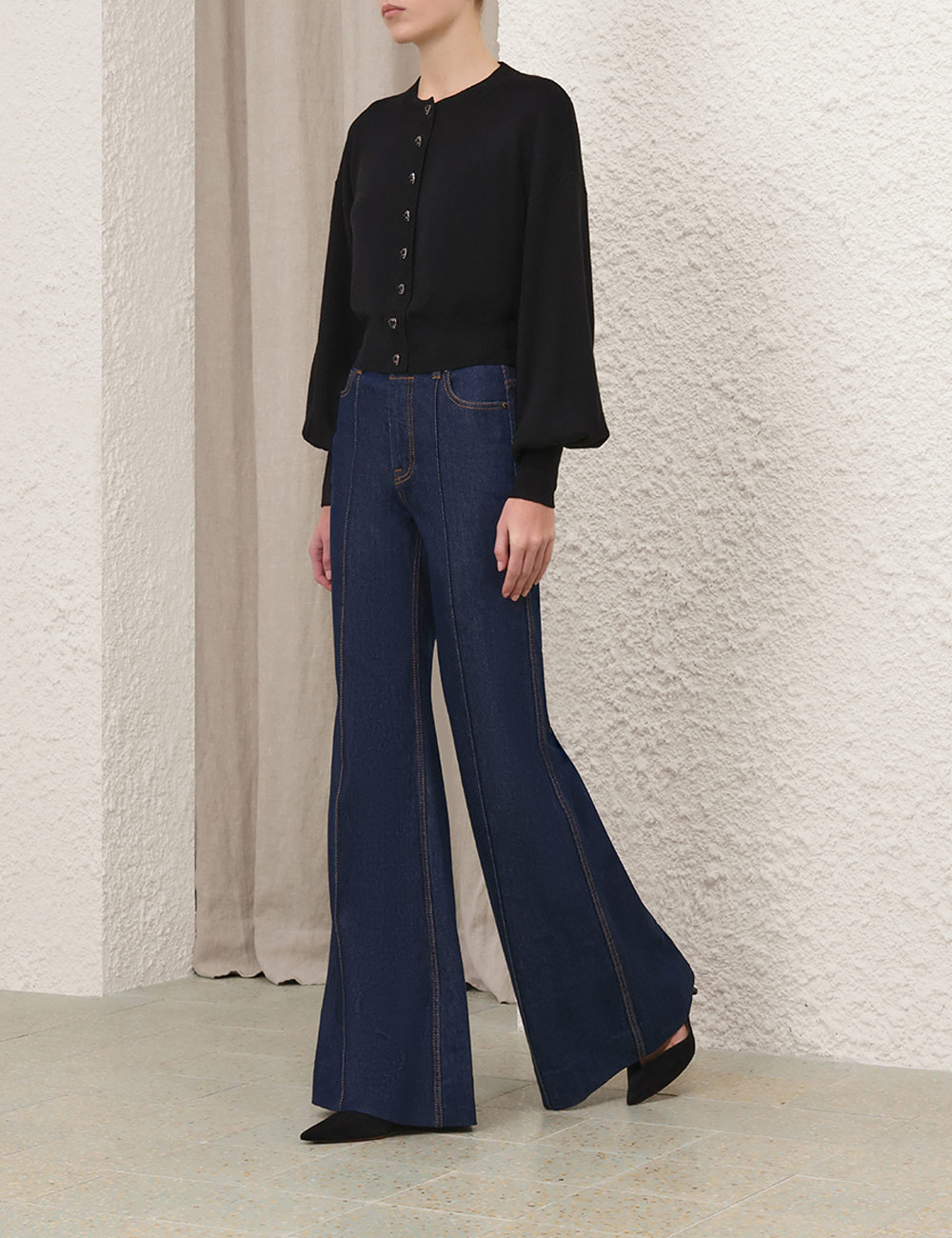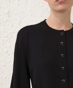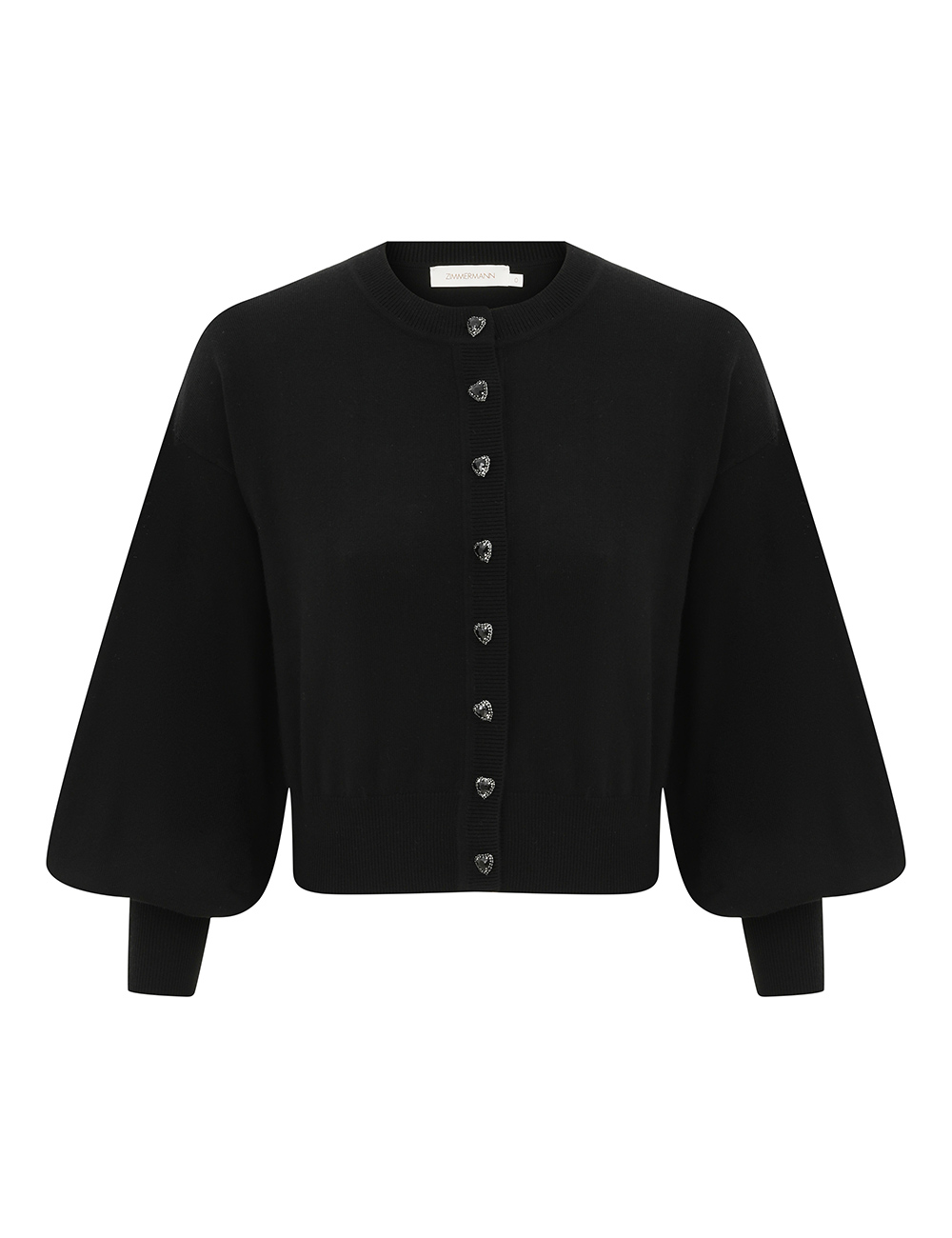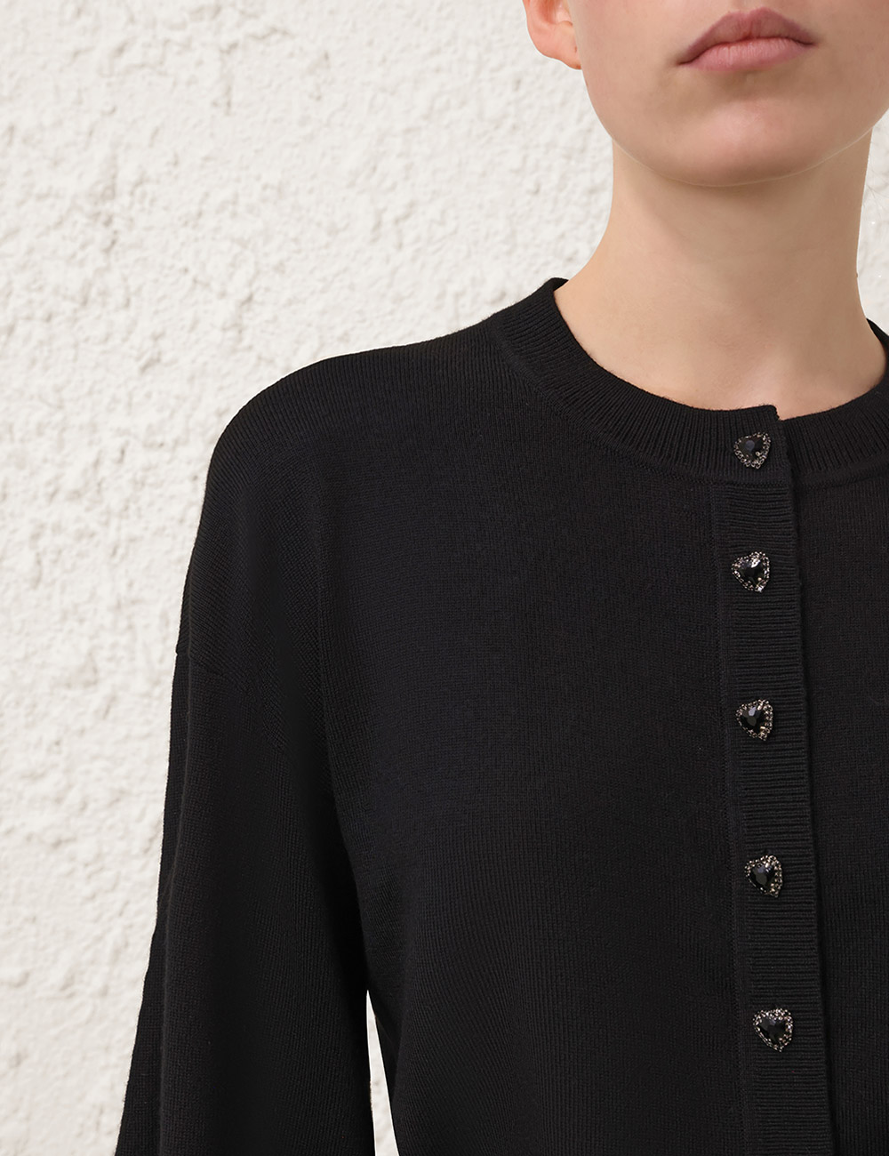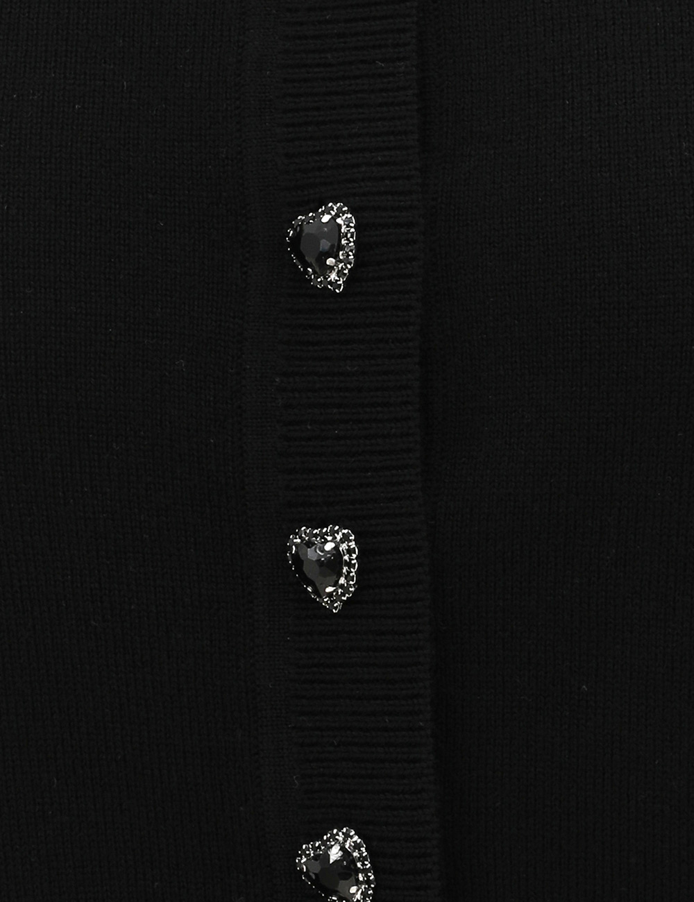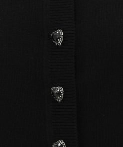 The Hypnotic Jewel Button Cardigan in Black from our Fall 2025 Collection, Hypnotic. A wool cardigan featuring a rounded neckline, long sleeves and functional jewel buttons down the centre front.100% wool, long sleeve cardigan, ribbed neckline, cuffs and hem, heart embellished buttons down the centre front, elongated cuffs