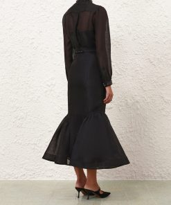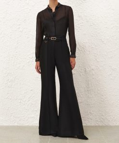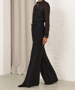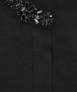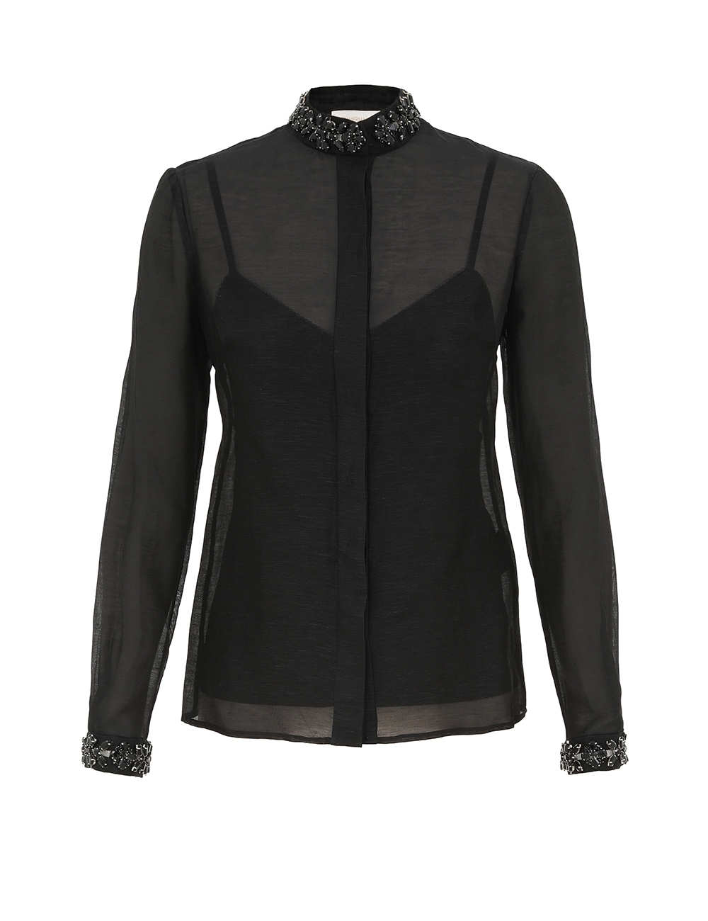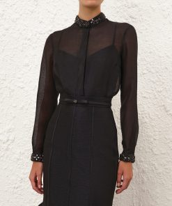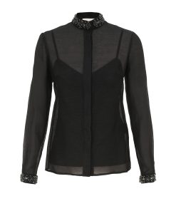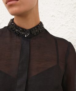 The Hypnotic Jewelled Body Shirt in Black from our Fall 2025 Collection, Hypnotic. A silk linen shirt featuring a stand collar trimmed with jewels, a concealed front opening, and tucks at the cuffs.long slim sleeves, gathered at the cuffs with crystal trim, concealed front placket, box pleat at the centre back, comes with separate cami