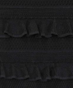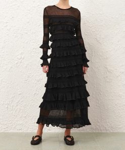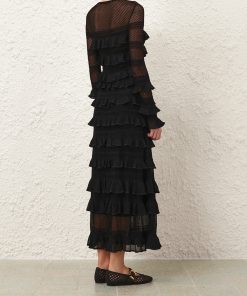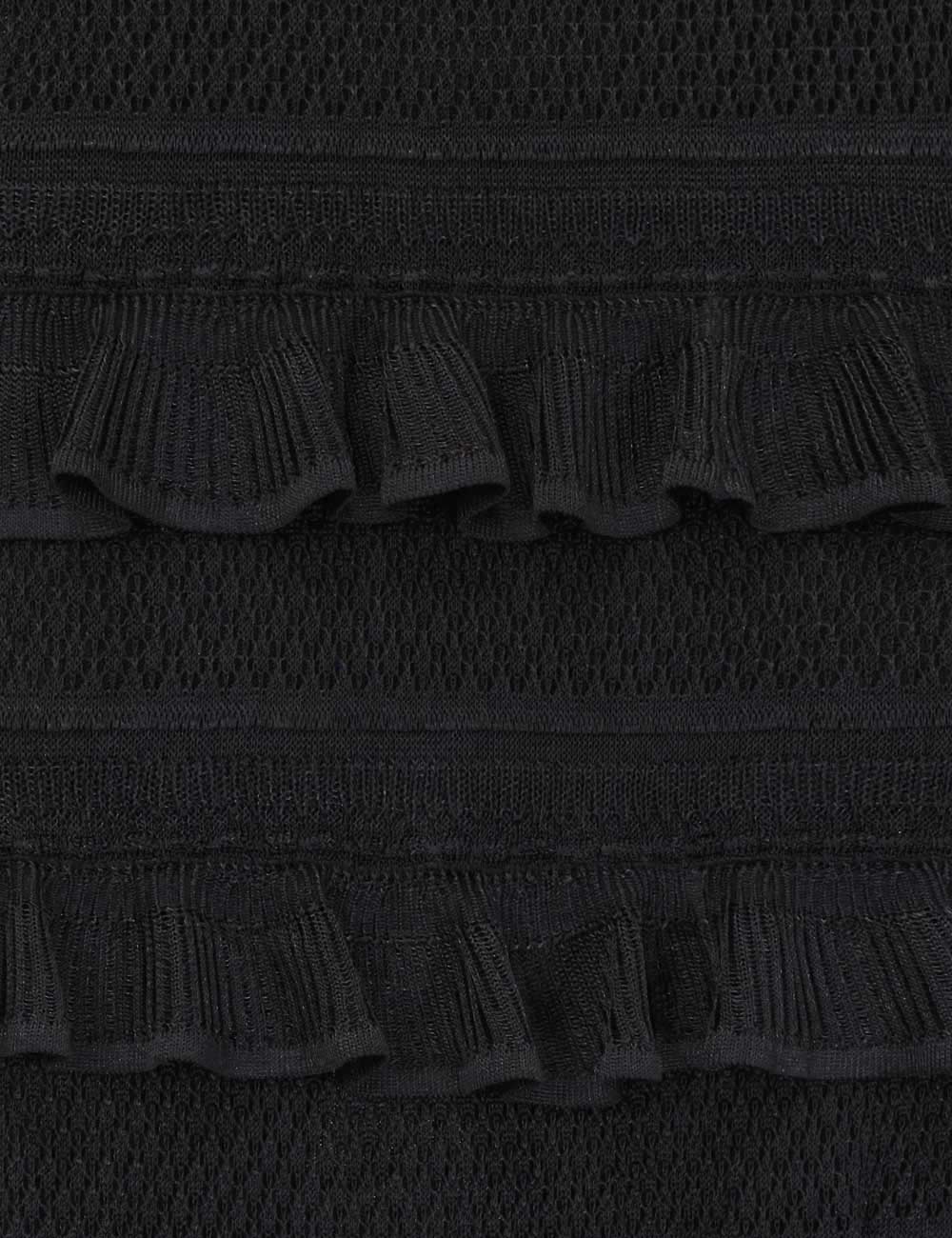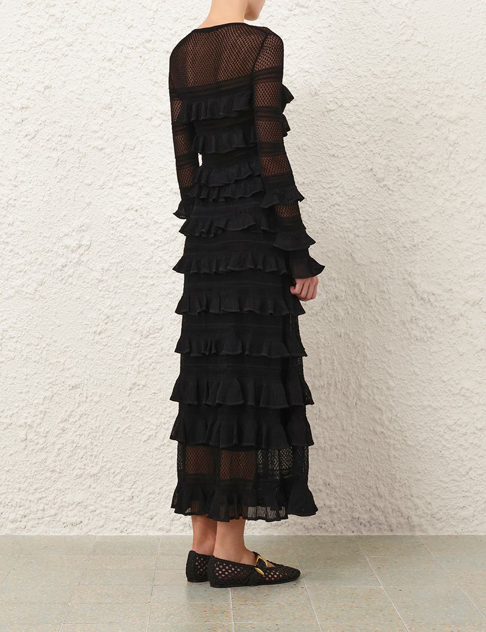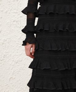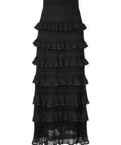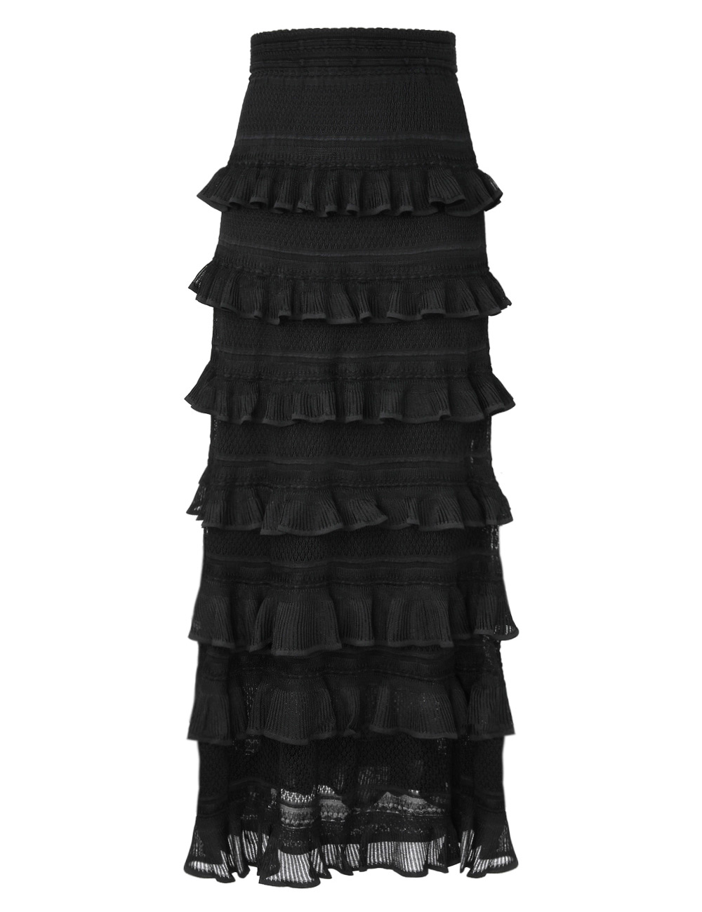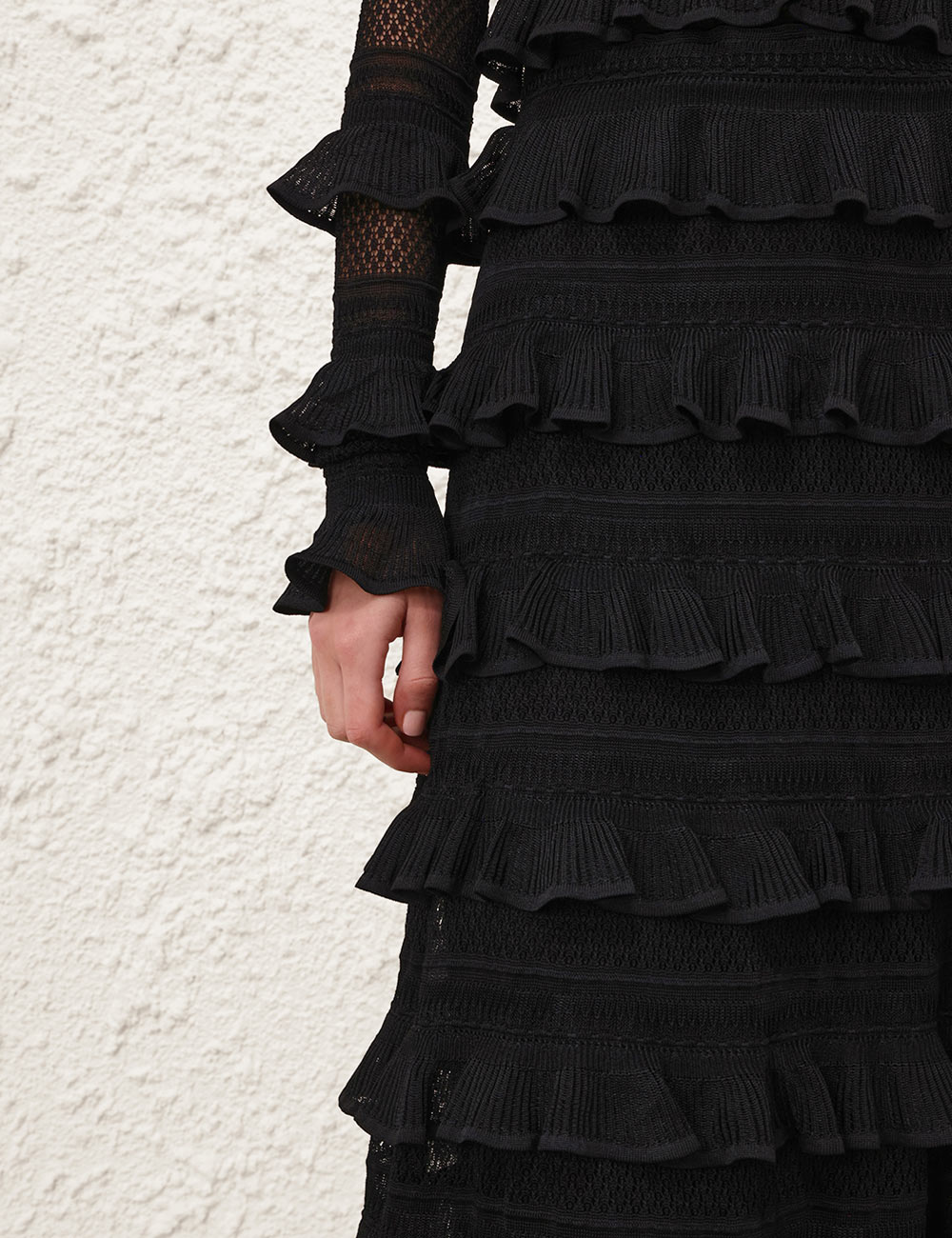 The Hypnotic Lace Frill Skirt in Black from our Fall 2025 Collection, Hypnotic. A knit midi skirt featuring an elasticated waistband and tiered ruffle details throughout. knit midi skirt, high waisted, tiered ruffles, elasticated waist, slip on style