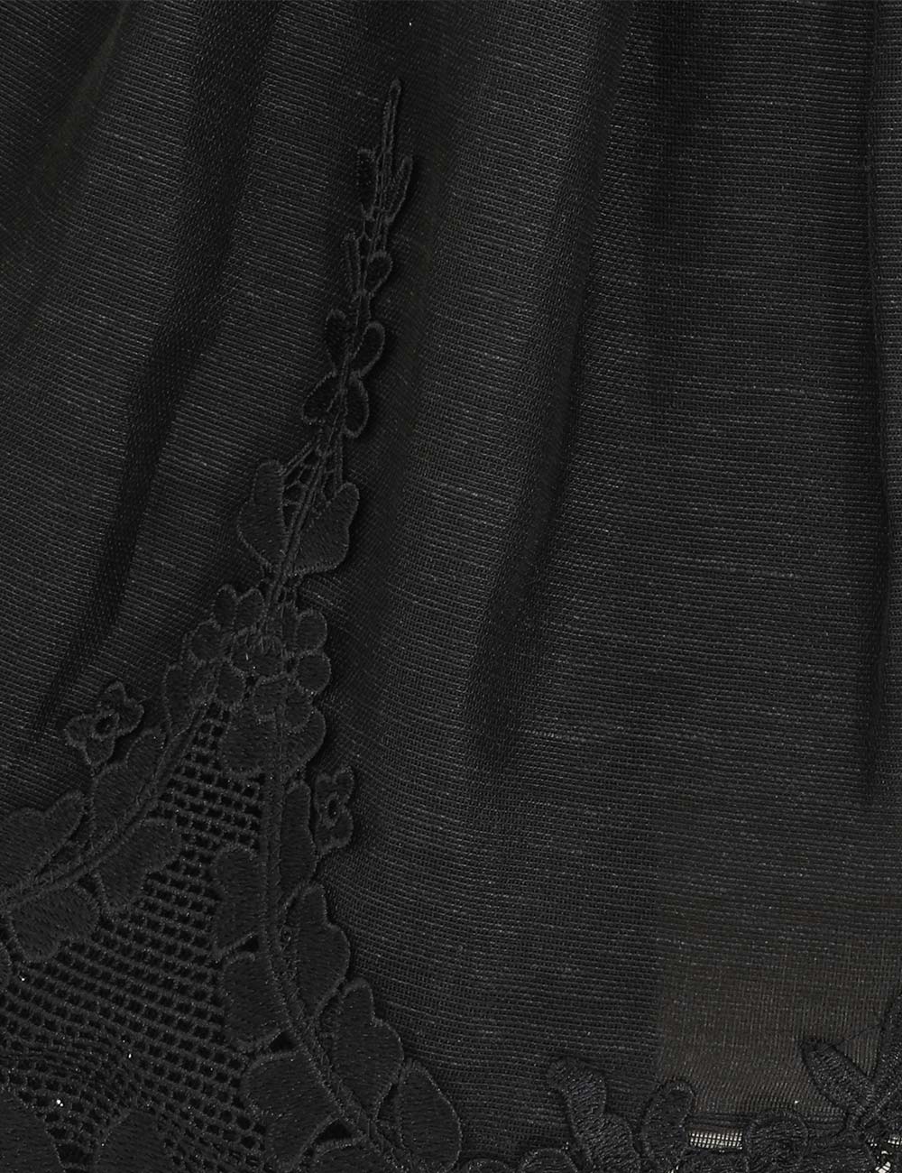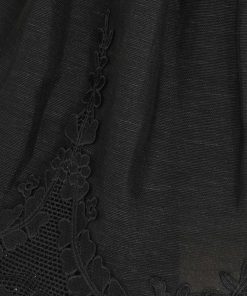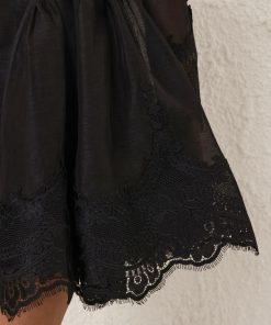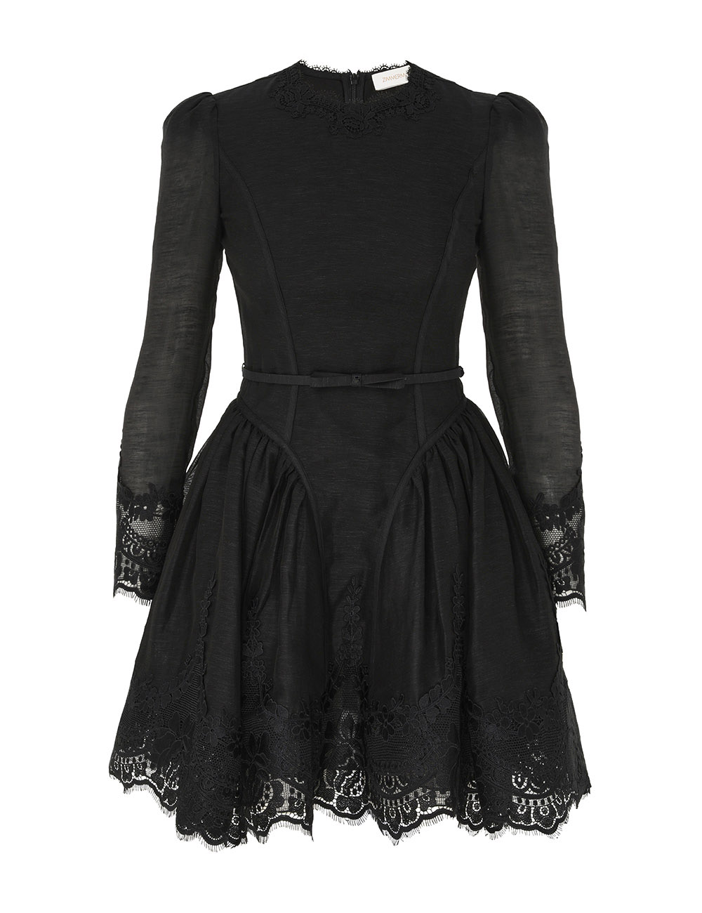 The Hypnotic Lace Trim Mini Dress in Black from our Fall 2025 Collection, Hypnotic. A silk linen mini dress featuring a rounded neckline, long sleeves, and lace trim at the neckline, cuffs, and hem, finished with a full flared skirt. long sleeved mini dress, lace trim detailing, gathered shoulders, removable self covered bow beltfull flared skirt with tulle inserted for volume, invisible zip closure at centre back, lined