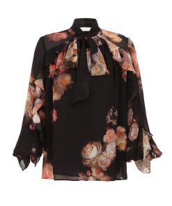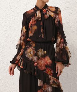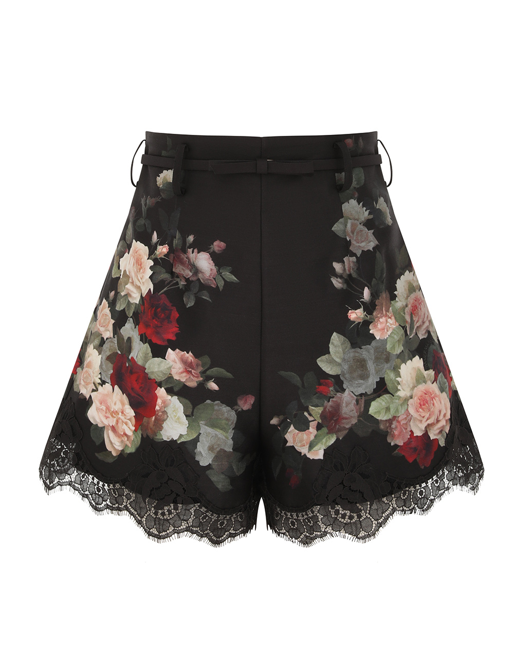 The Hypnotic Lace Trim Short in Black Cascade from our Fall 2025 Collection, Hypnotic. A high waisted silk blend short featuring a self-tie belt, invisible centre back zip closure and lace trim throughout.silk cotton blend short, belt loops with removable waist tie belt, side seam pockets, placement printed, embroidered trim, fully lined