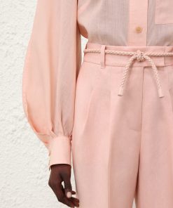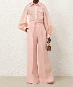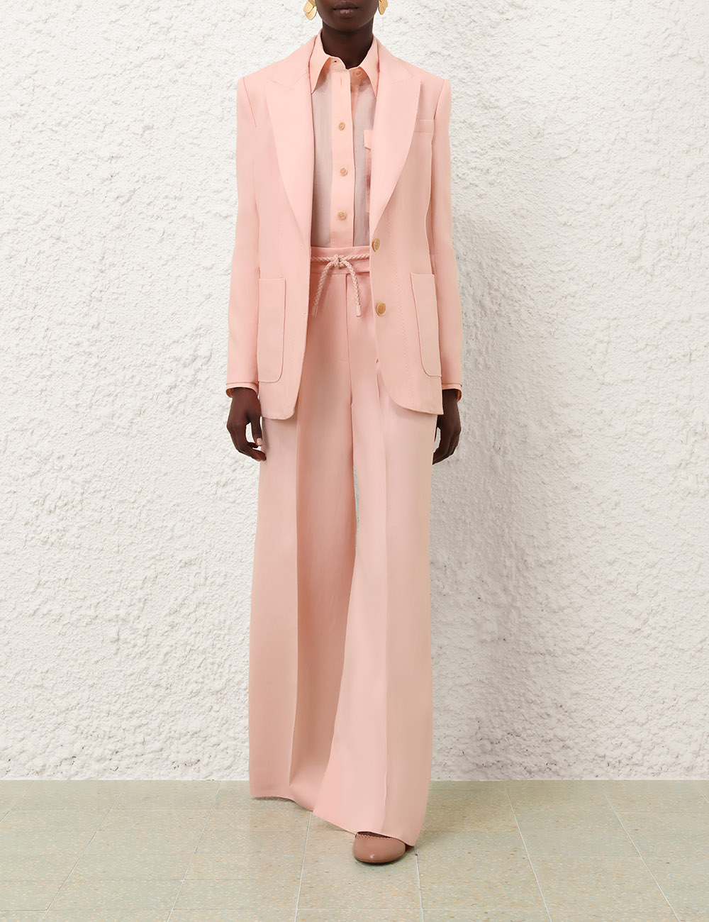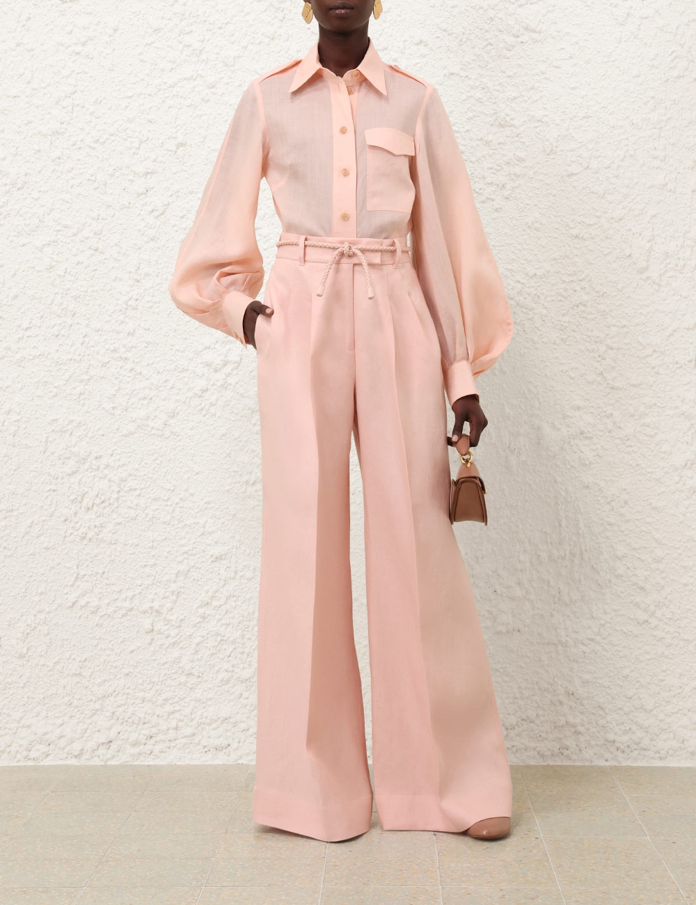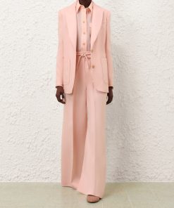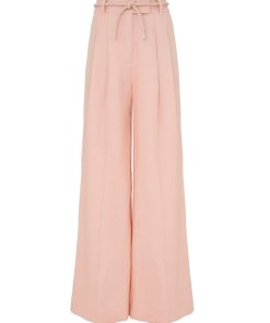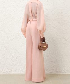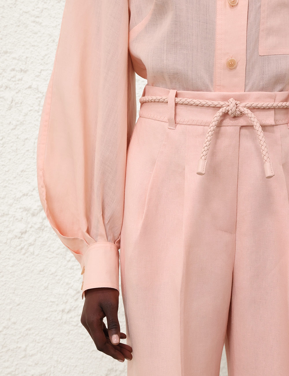 The Hypnotic Linen Wide Leg Pant in Pink from our Fall 2025 Collection, Hypnotic. A high waisted linen pant featuring centre front pintucks, front pockets and a removable buckle belt. linen pant, wide leg, pintucks through centre front legs, front fly closure, side seam and back welt pockets, removable self covered belt, topstitch zig-zag detailing