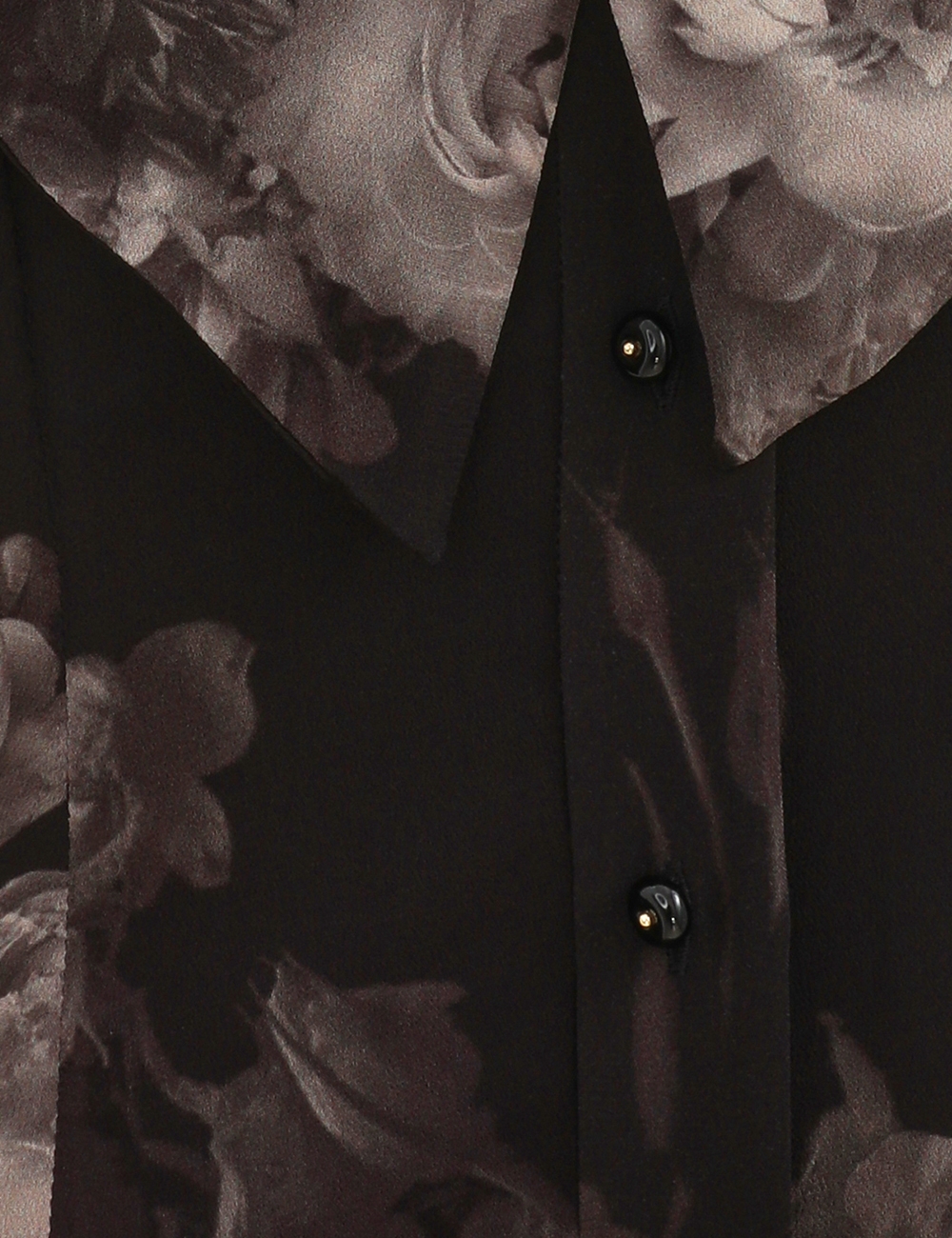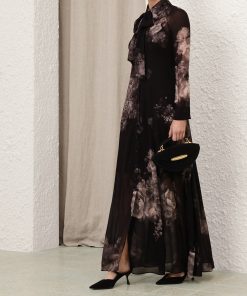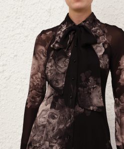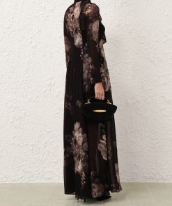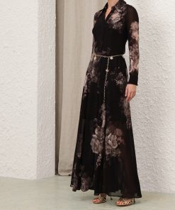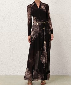 The Hypnotic Maxi Shirt Dress in Ghost Floral from our Fall 2025 Collection, Hypnotic. A long sleeve dress featuring a classic collar, pussybow necktie and buttons down the centre front. shirt style maxi dress, removable self-rouleau necktie, long fitted sleeves and cuffs, buttons down centre front placket, comes with a separate slip