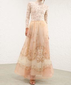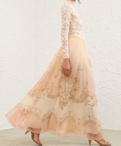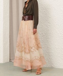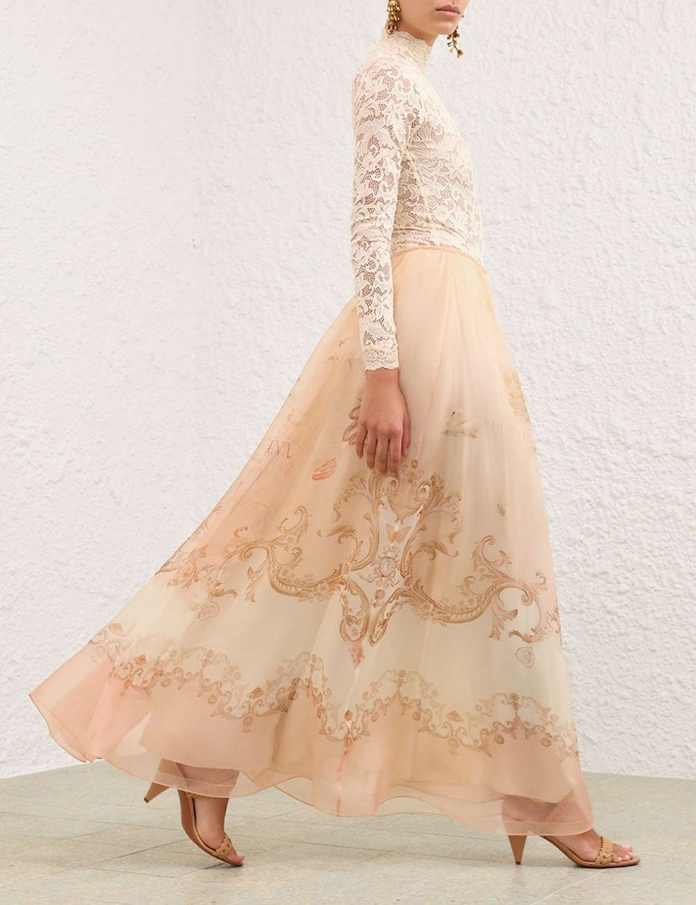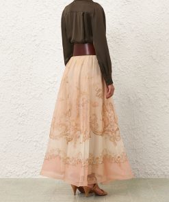 The Hypnotic Organza Maxi Skirt in Map Print from our Fall 2025 Collection, Hypnotic. A silk organza maxi skirt featuring a gathered waist and placement print throughout. 100% silk fabric, invisible zip closure at left side, gathers at waistband, mid-rise silhouette, fully lined