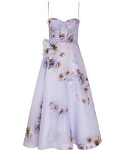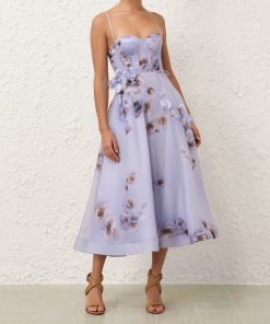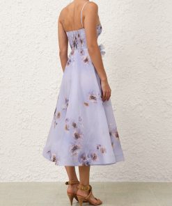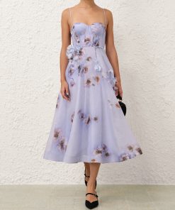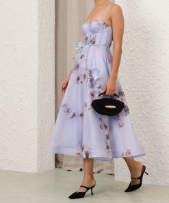 The Hypnotic Picnic Dress in Lilac Poppy from our Fall 2025 Collection, Hypnotic. A silk linen midi dress featuring a sweetheart neckline, a structured bustier bodice and a full flared skirt.structured bodice with boning and underwire, adjustable straps for versatile fit, removable rouleau belt with flower trim, shirred back with invisible zip closure, flared skirt, side seam pockets