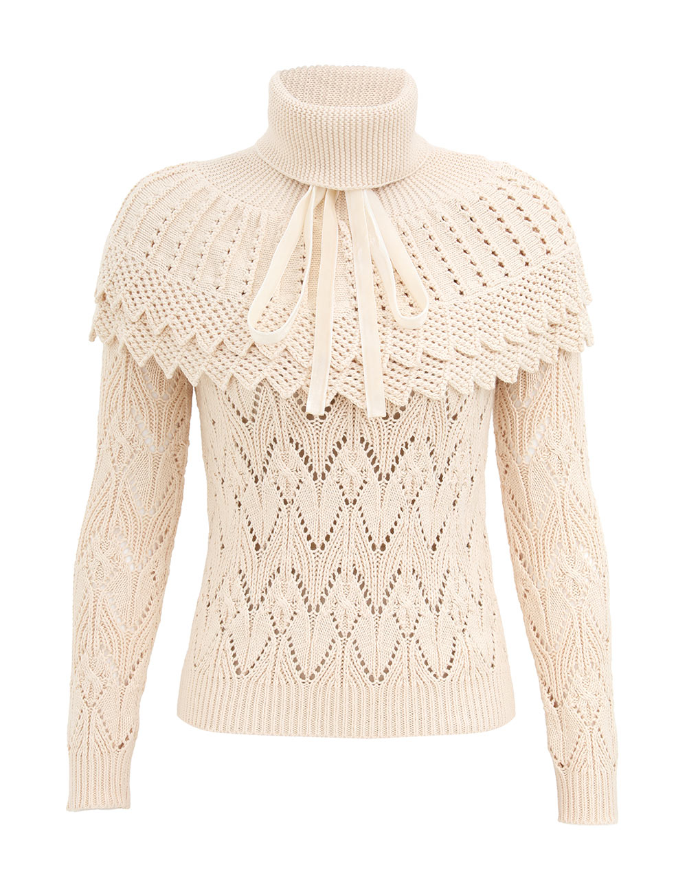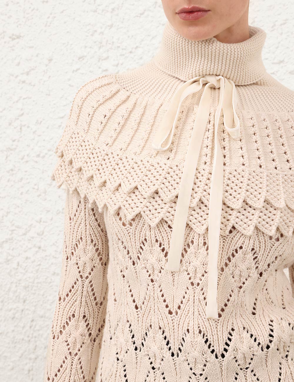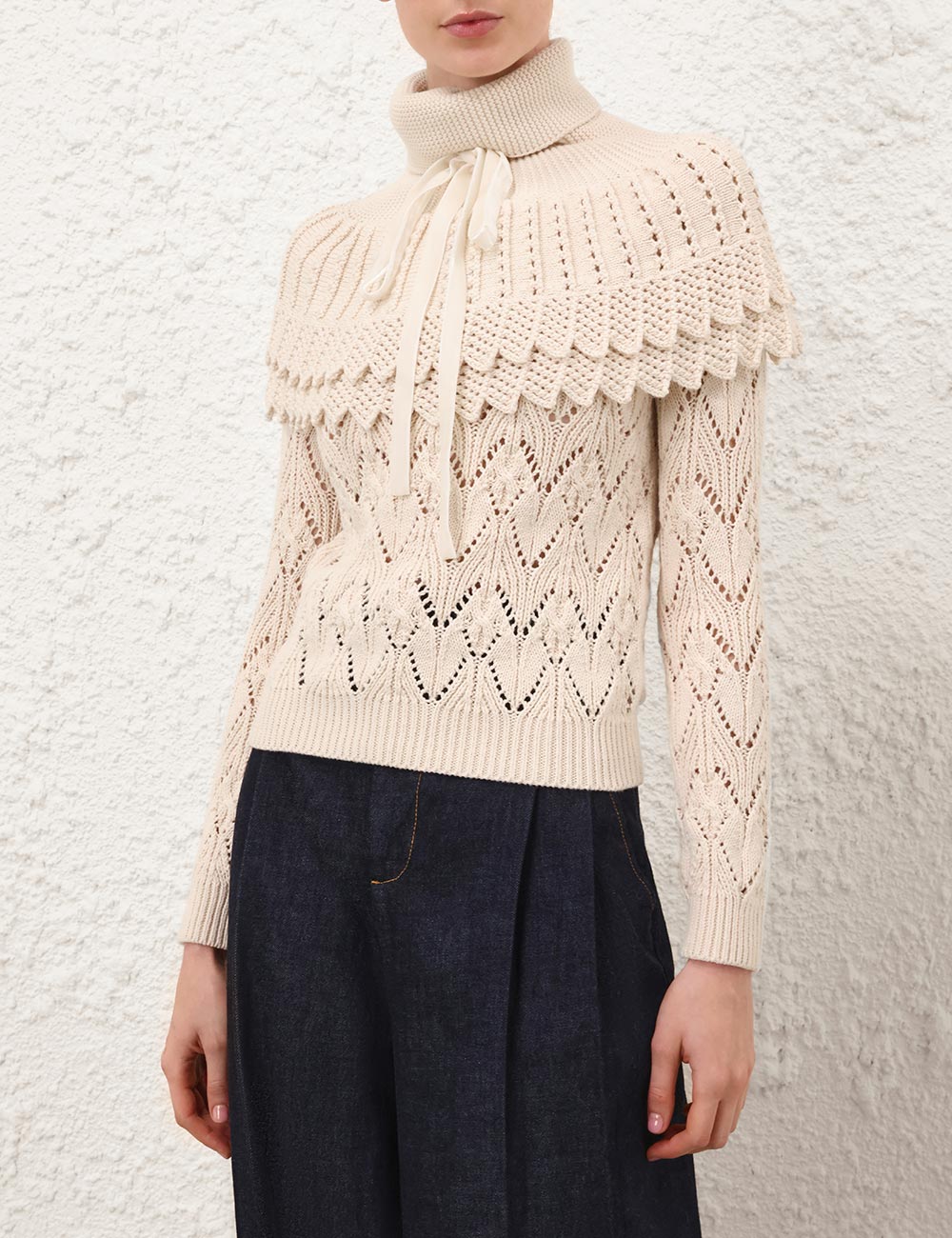 The Hypnotic Ruffle Collar Sweater in Chalk from our Fall 2025 Collection, Hypnotic. A crochet sweater featuring a ribbed turtleneck with a velvet necktie and a tiered, over shoulder cape detail. crochet turtleneck sweater, ribbed at collar, cuffs and hem, layered cape detail over the shoulders, crochet detailing with sheer panelling throughout