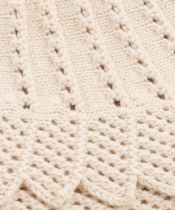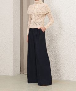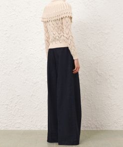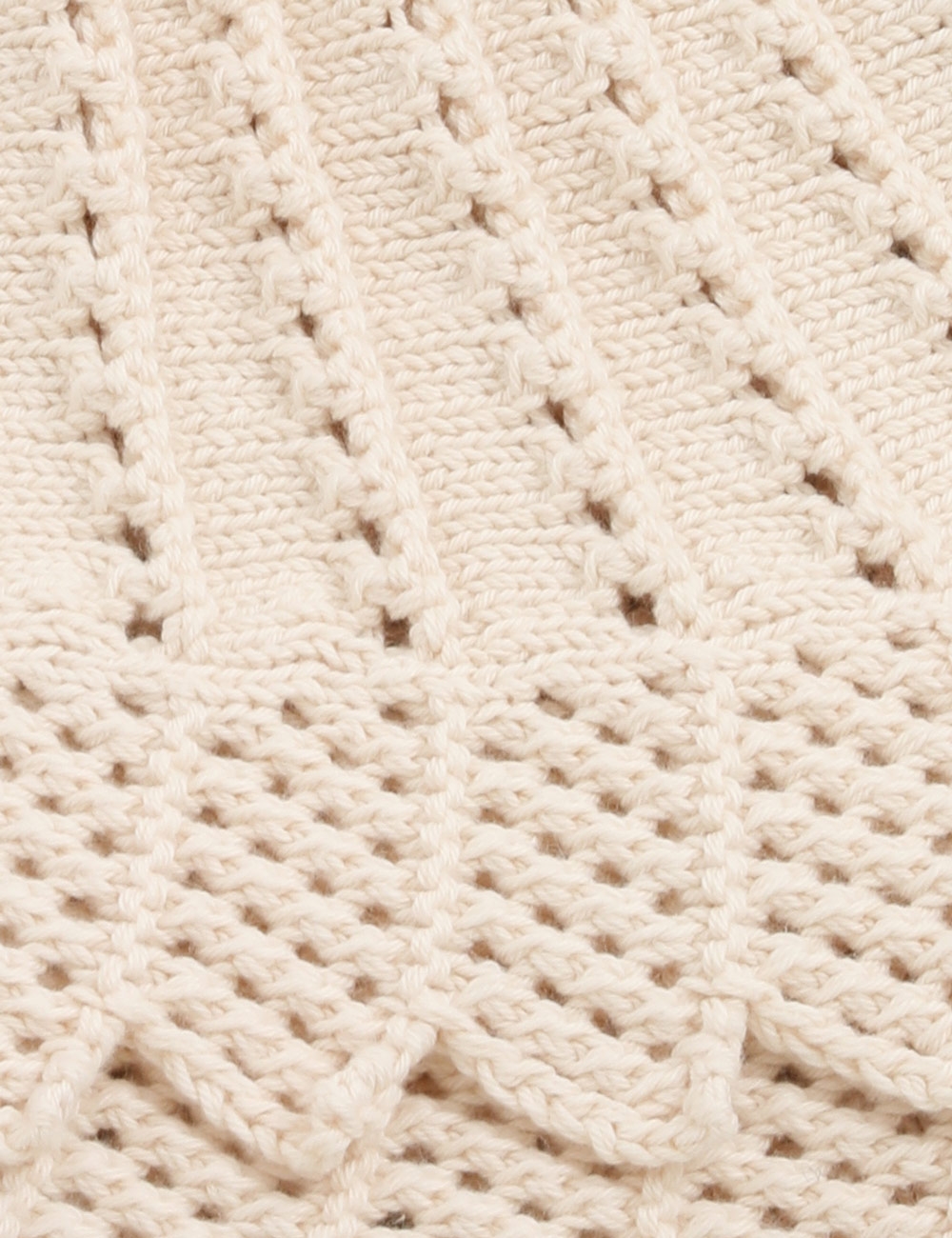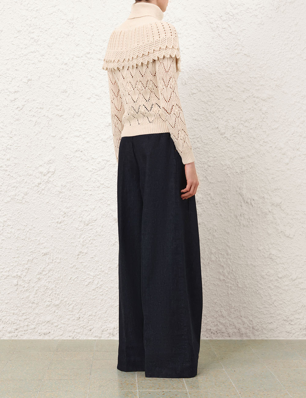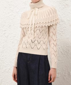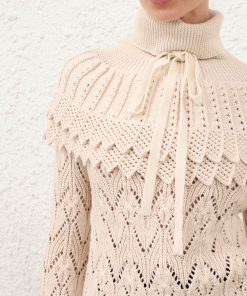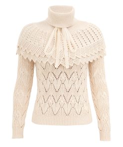 The Hypnotic Ruffle Collar Sweater in Chalk from our Fall 2025 Collection, Hypnotic. A crochet sweater featuring a ribbed turtleneck with a velvet necktie and a tiered, over shoulder cape detail. crochet turtleneck sweater, ribbed at collar, cuffs and hem, layered cape detail over the shoulders, crochet detailing with sheer panelling throughout